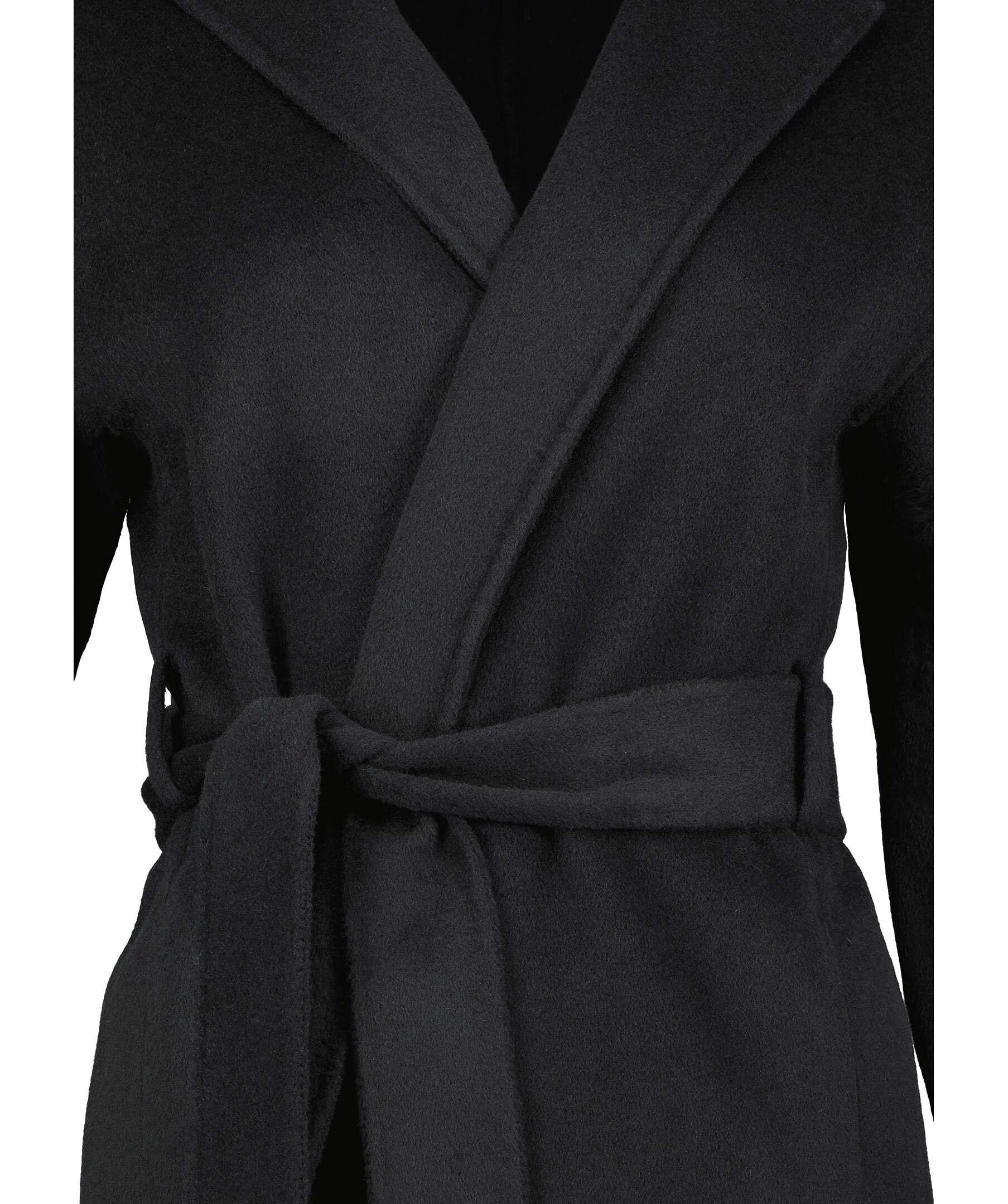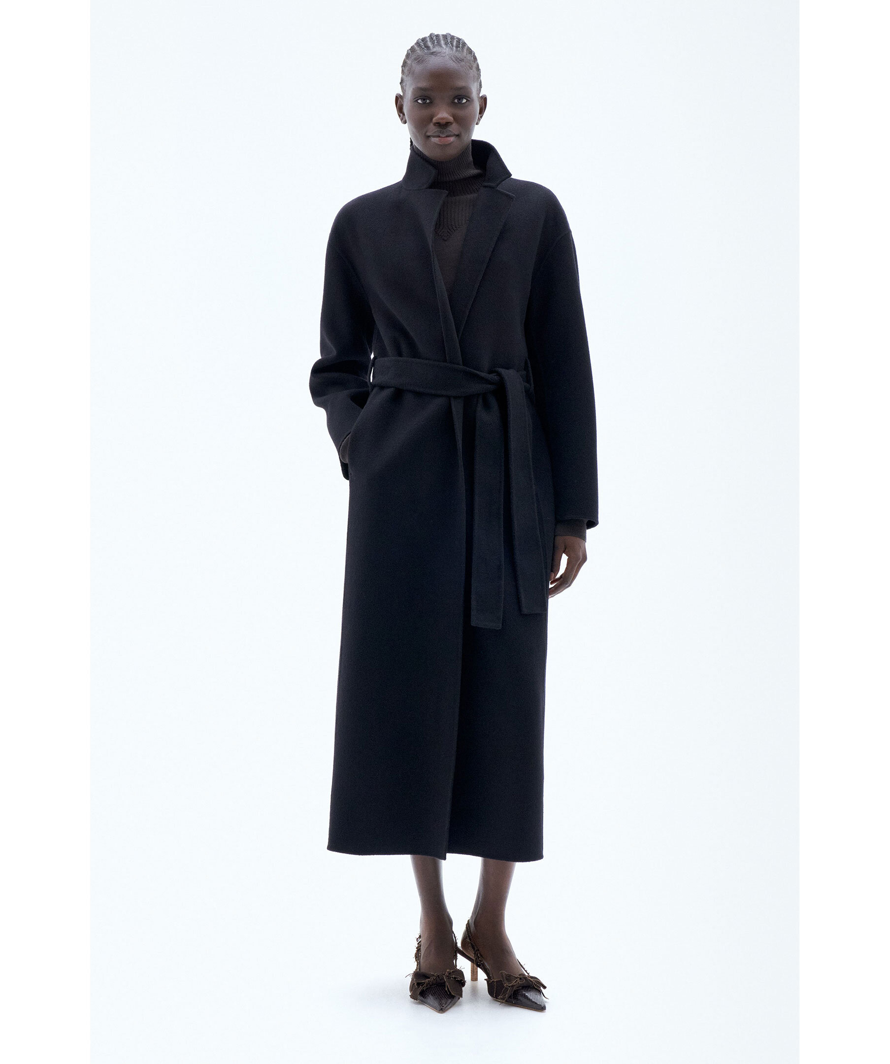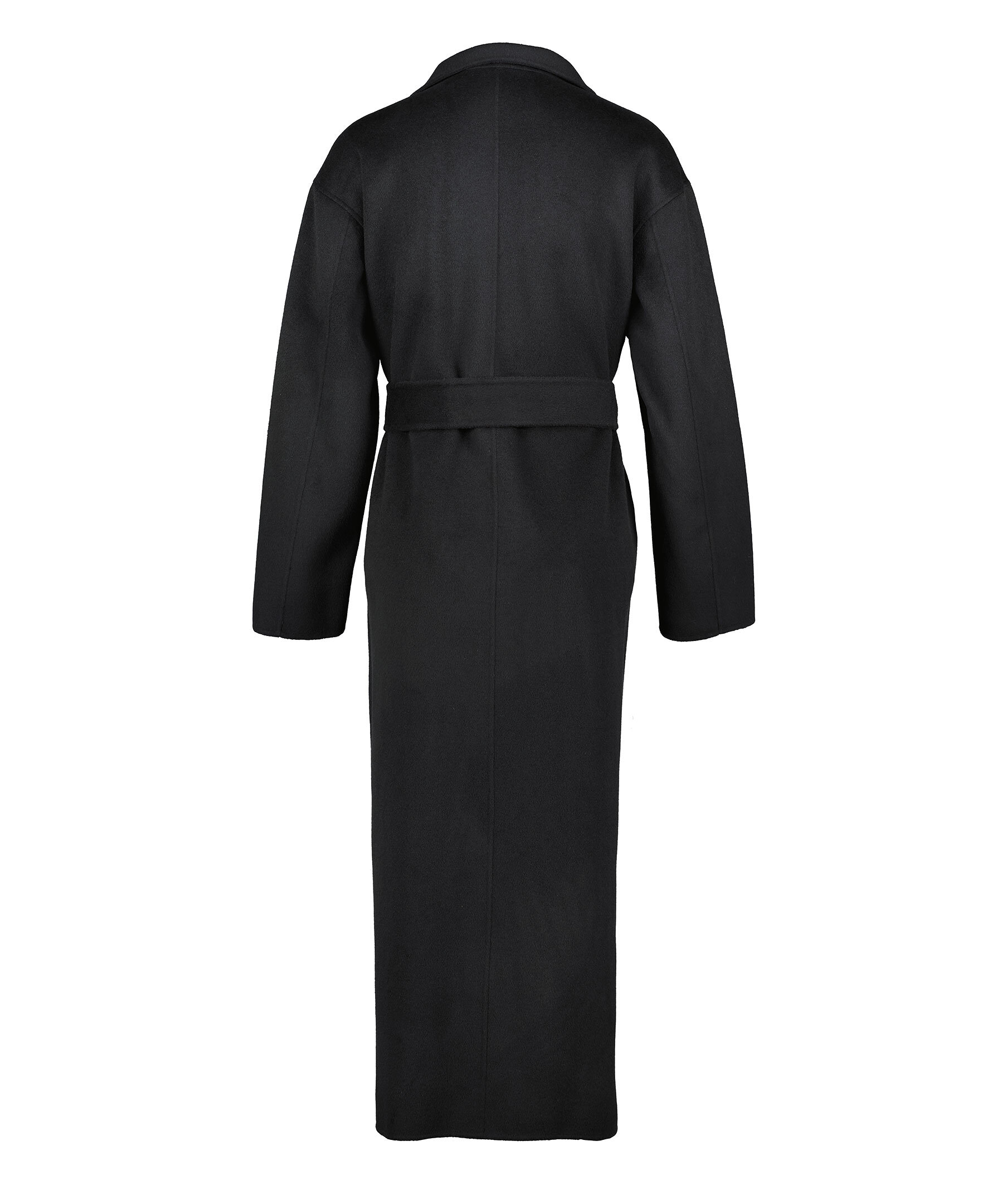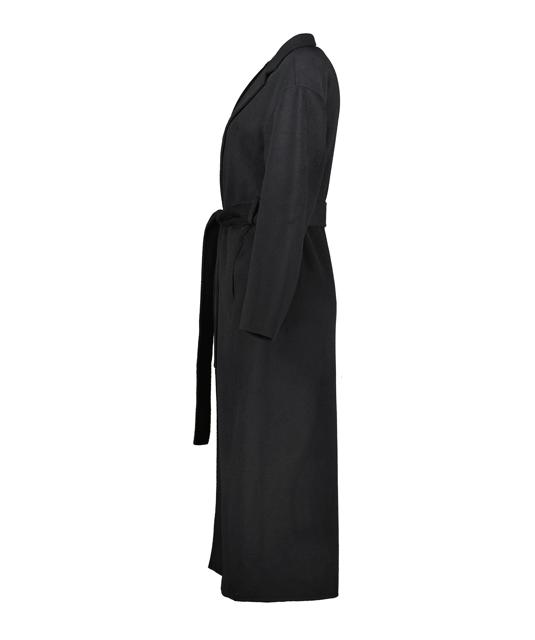 Svart lång kappa med handsydda kanter från Filippa K. Stålkrage, bälte i midjan och två sidfickor.