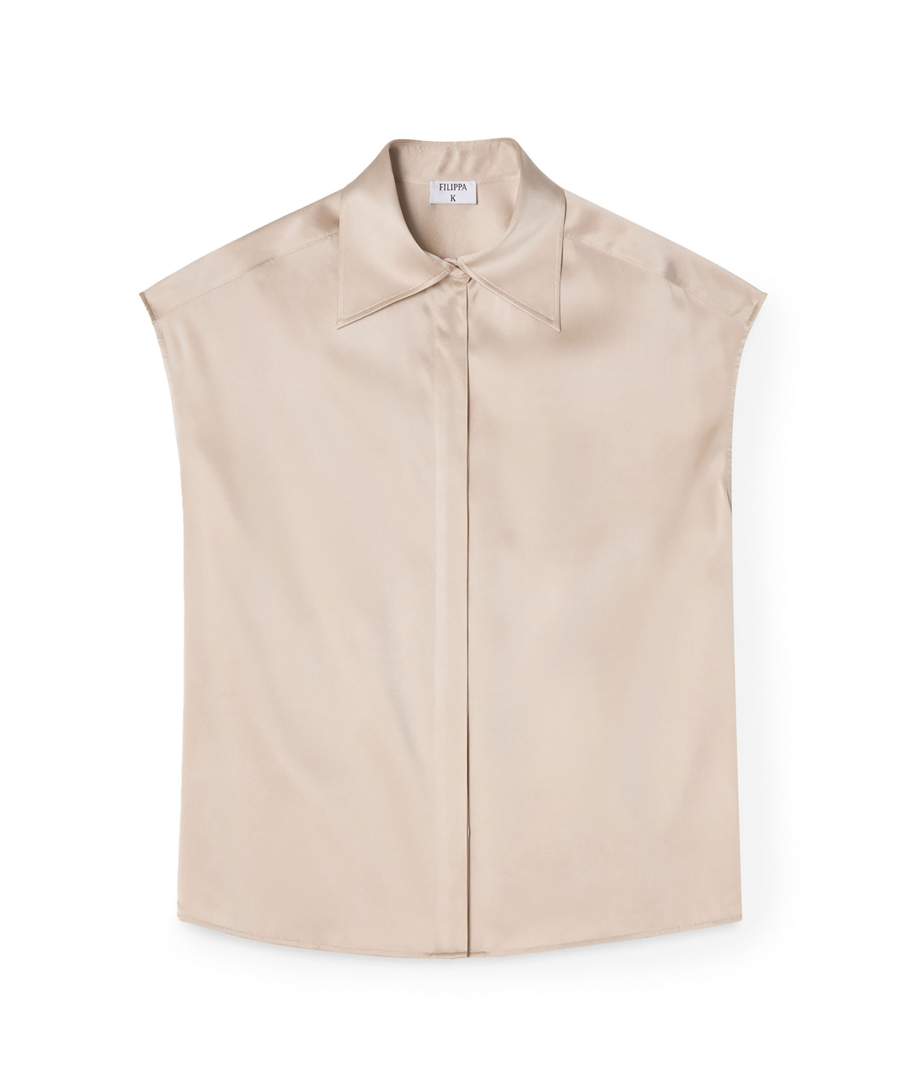 Beige silkblus från Filippa K. Blusen stängs med dolda knappar och har korta, droppade axlar. Tillverkad i en silkblandning.