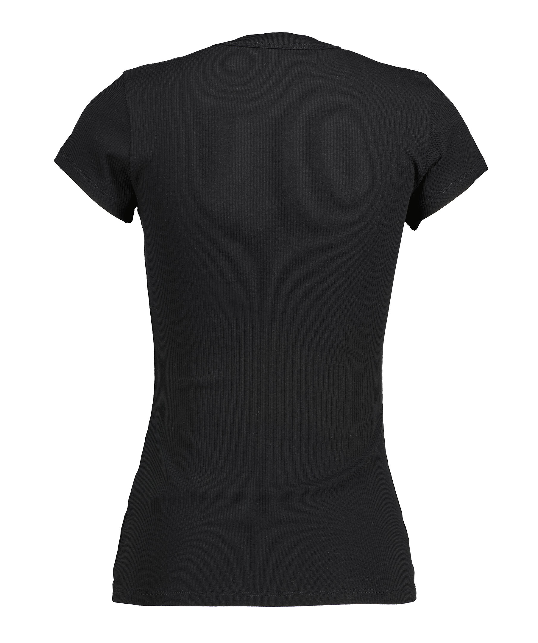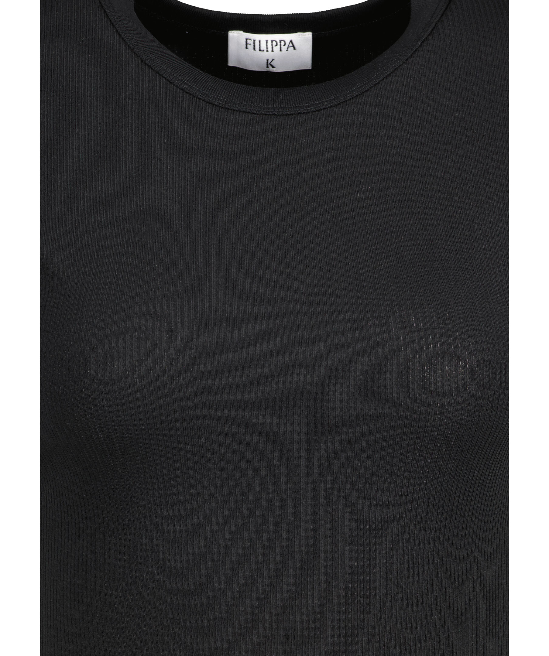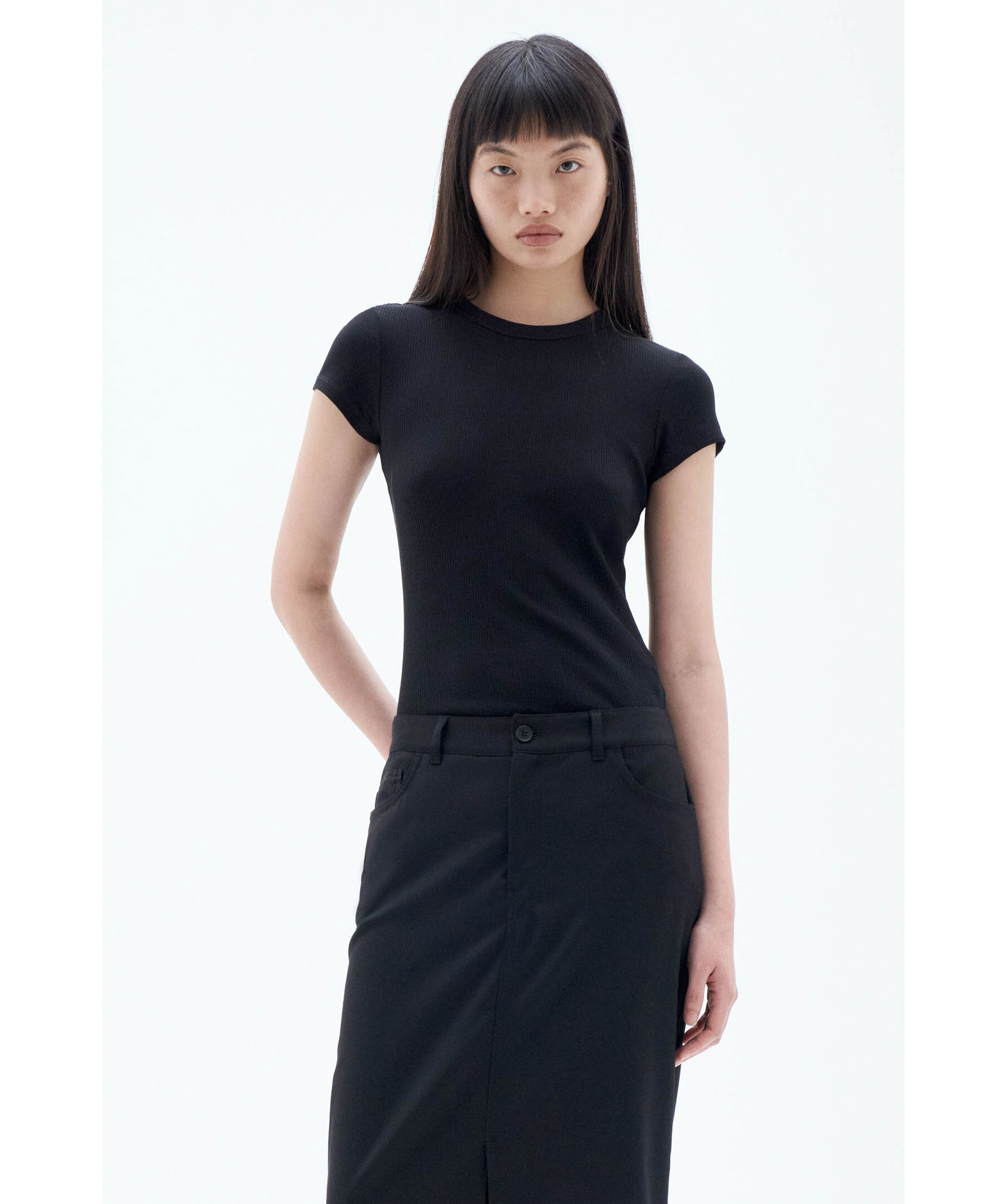 Svart, ribbad t-shirt från Filippa K. T-shirten har rund, ribbstickad halsringning. Tillverkad i en bomullsblandning.