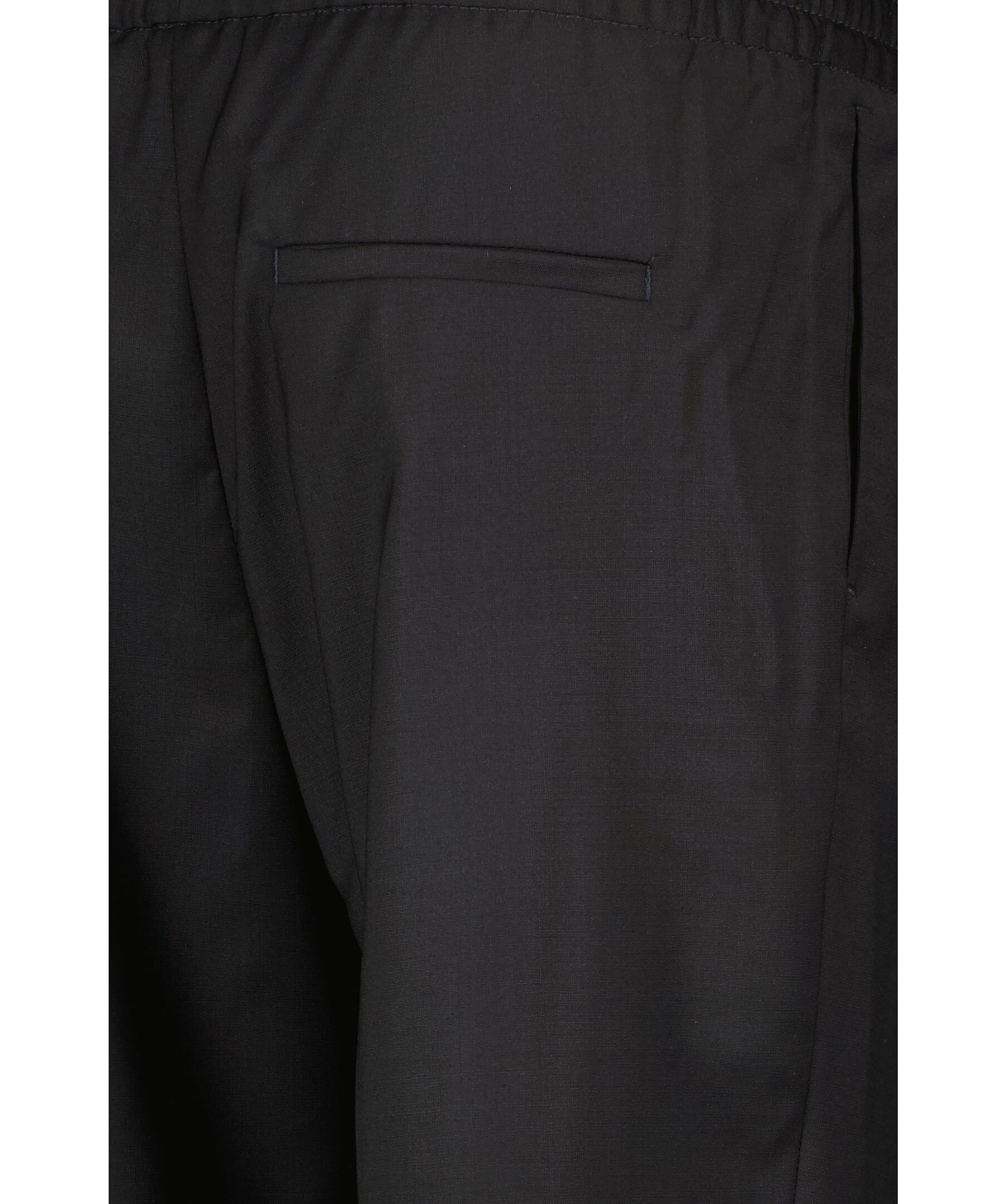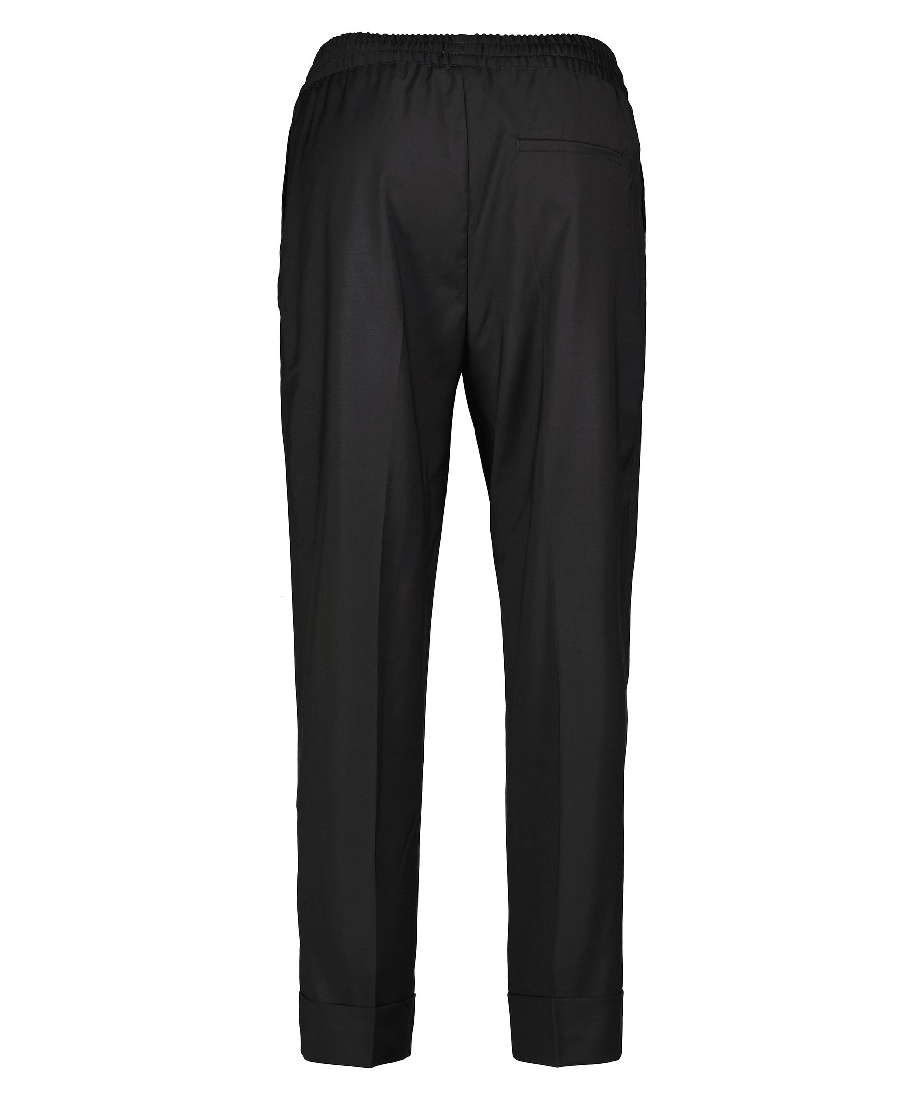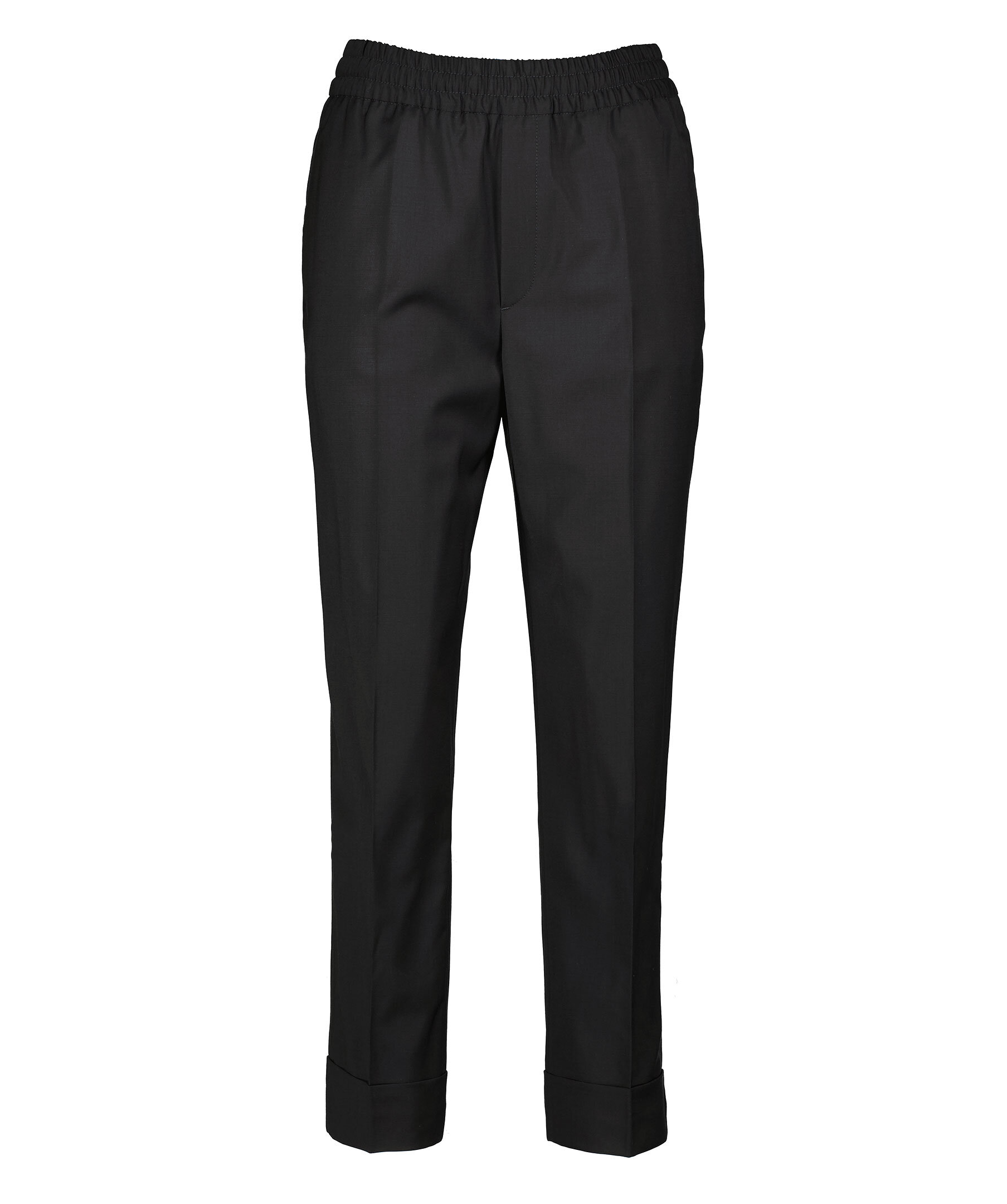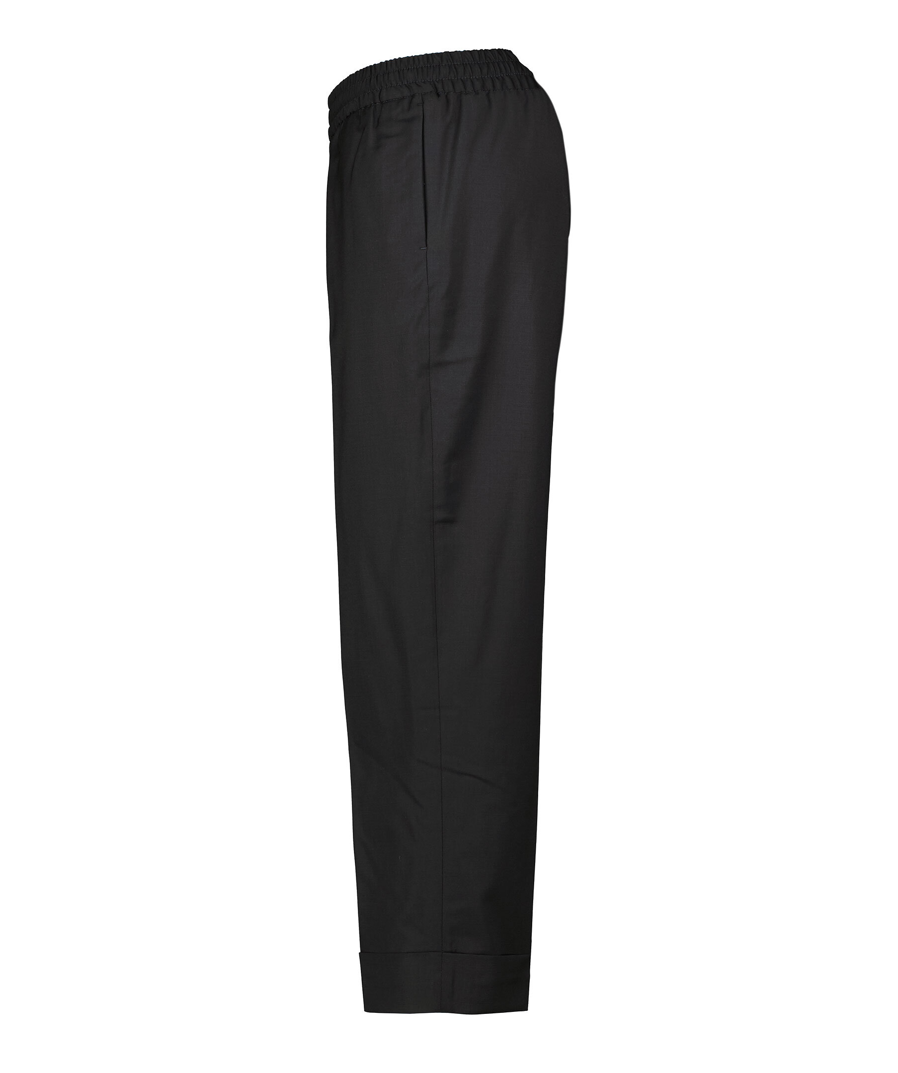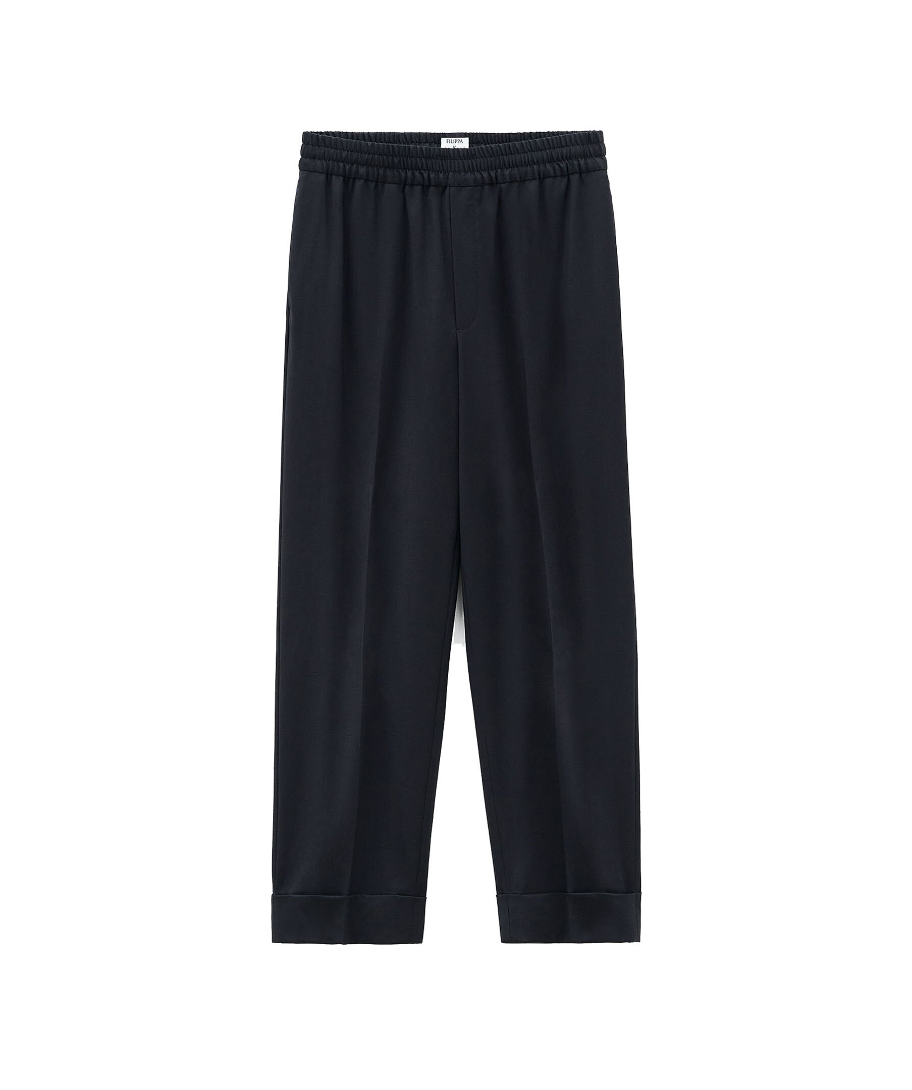 Svarta, croppade kostymbyxor från Filippa K. Rak passform med medelhög midja, croppad längd och uppvikta benslut. Elastisk mudd vid midjan och pressade veck fram och bak.