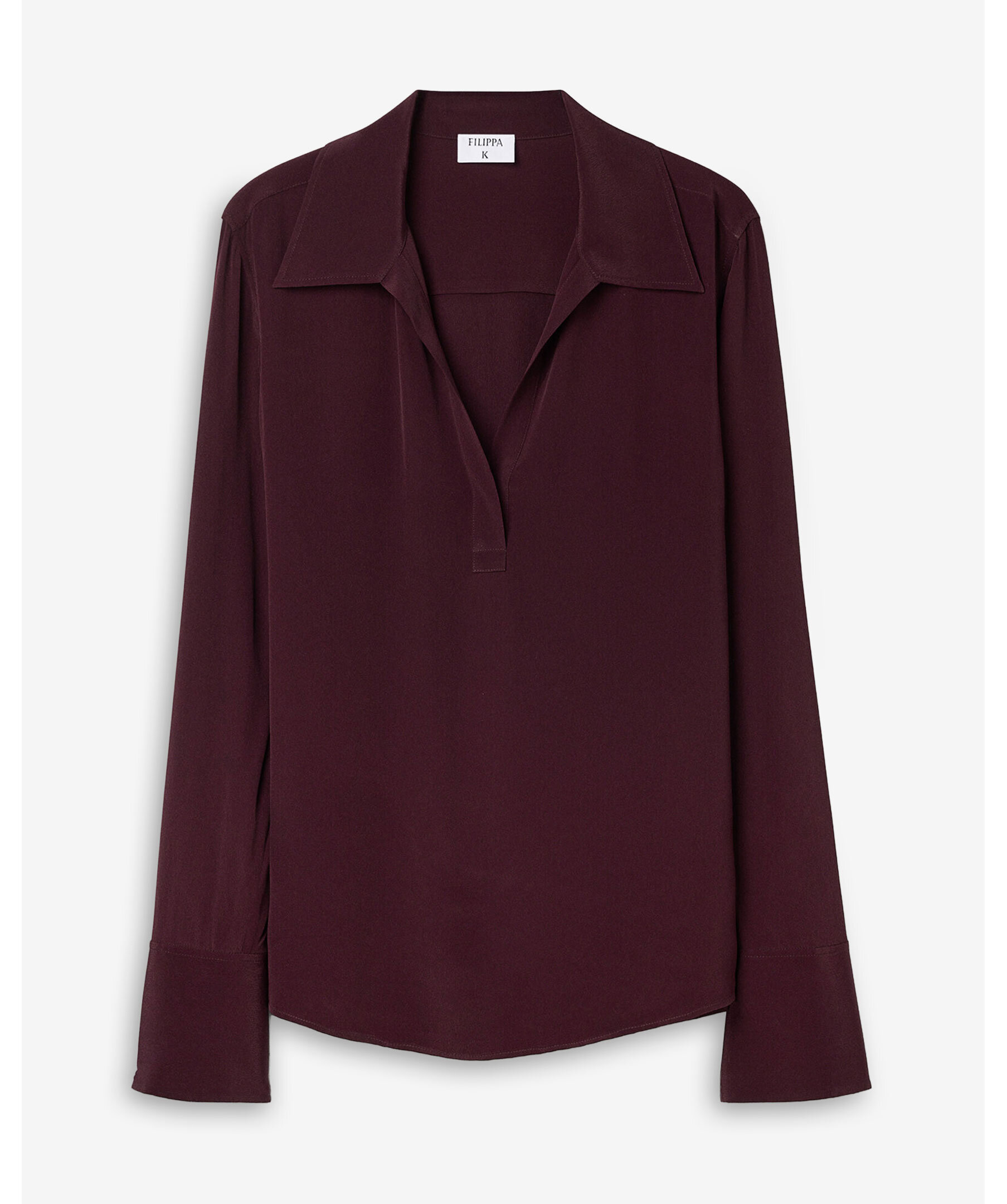 Half Placket Blouse från Filippa K är en långärmad blus i färgen Dark Burgundy. Blusen har en avslappnad passform, halvknäppning framtill, dubbel lager med veckad yoke och högt knäppta manschetter. Tillverkad i en lättviktsblandning av 64 % Naia™-acetat och 36 % viskos, vilket ger ett mjukt och följsamt fall. En stilren blus som passar både till vardags och till festligare tillfällen.