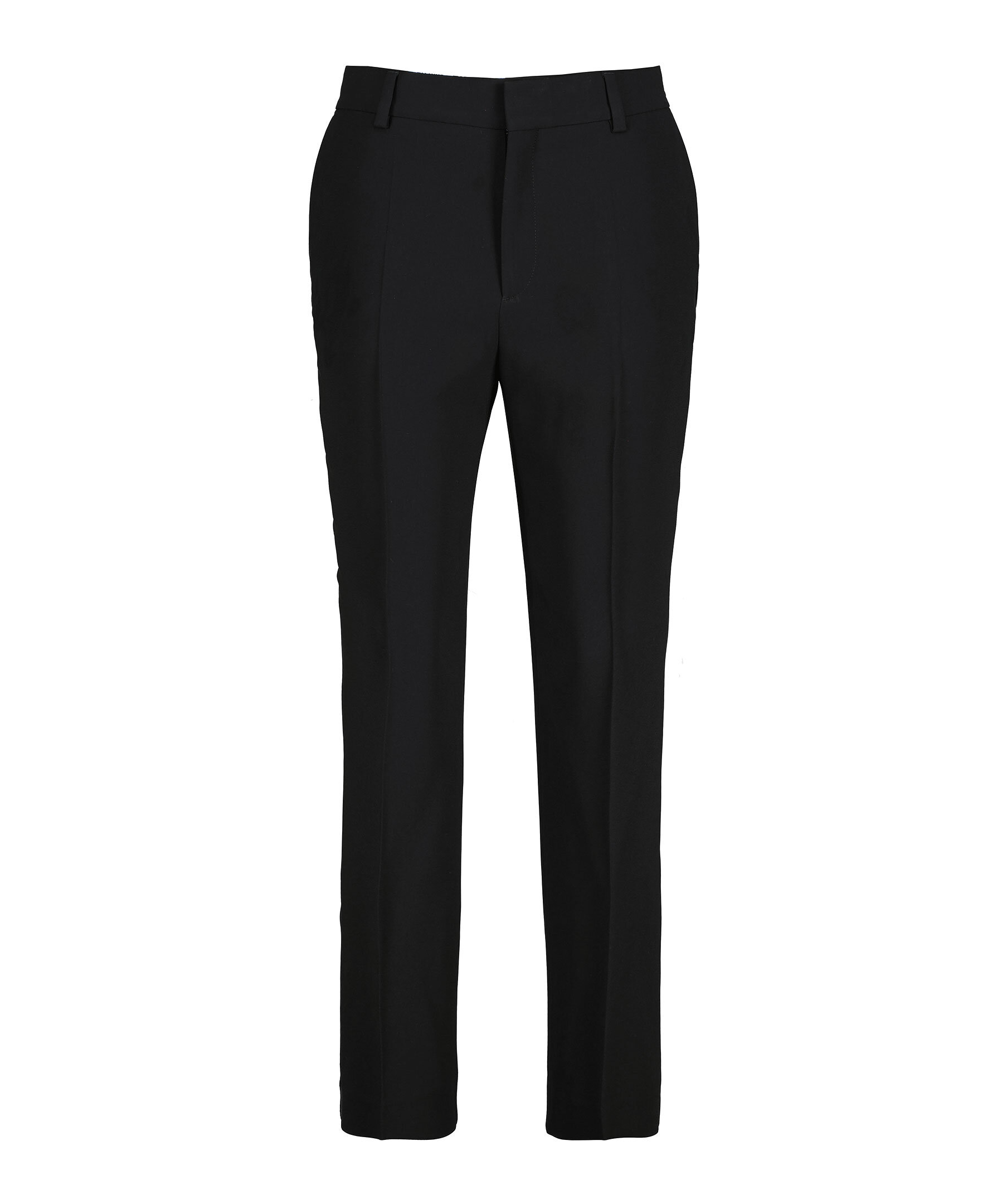Svarta, croppade kostymbyxor från Filippa K. Rak passform med medelhög midja, croppad längd och avsmalnande byxben. Gylf med dragkedja och hyska och hake fram. Pressade veck fram och bak. Bälteshällor i midjan. Två sidfickor samt en passpoalficka baktill.