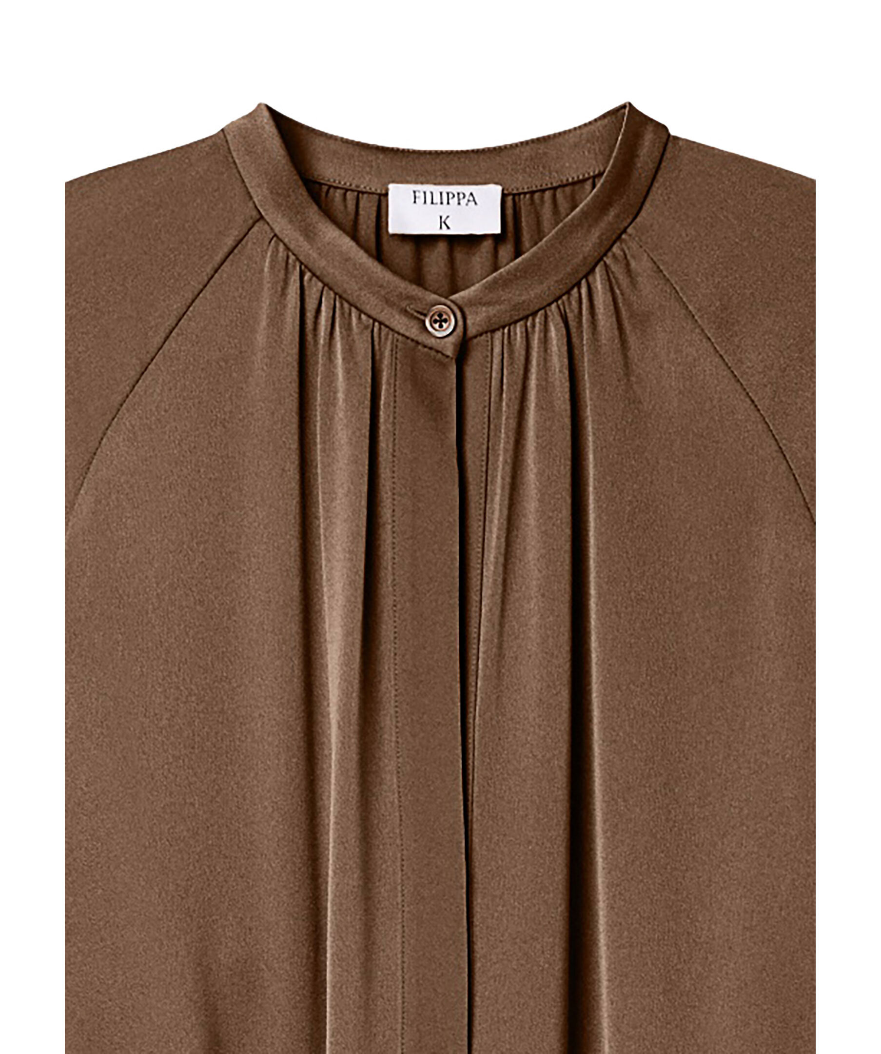 Brun, lätt glansig långklänning från Filippa K. Klänningen har rundad halsringning med en knapp, långa ärmar samt knytning i midjan. Tillverkad i en acetat- och polyesterblandning.