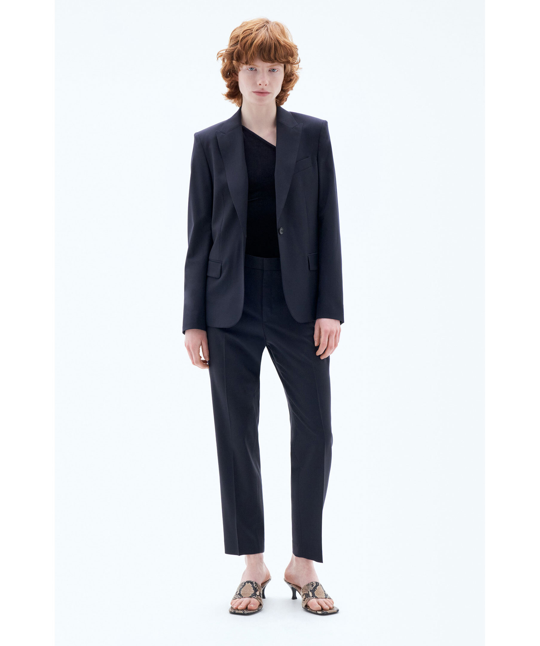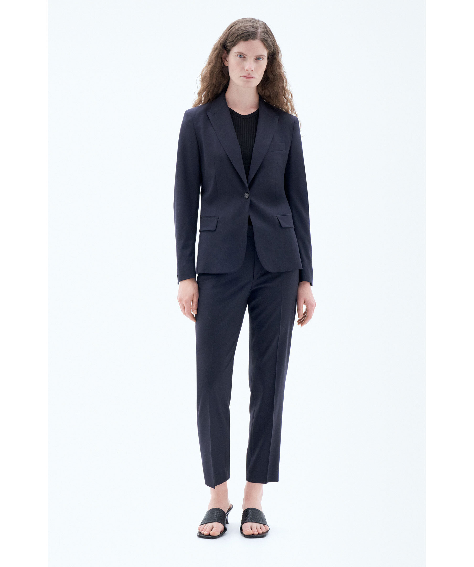 Mörkblå kavaj från Filippa K. Enkelknäppt. Två fickor med lock framtill, snedställd bröstficka på vänster sida. Tillverkad i Ull. Sprund baktill. Fyra knappar vid ärmslut. Fodrad. Spetsiga slag.