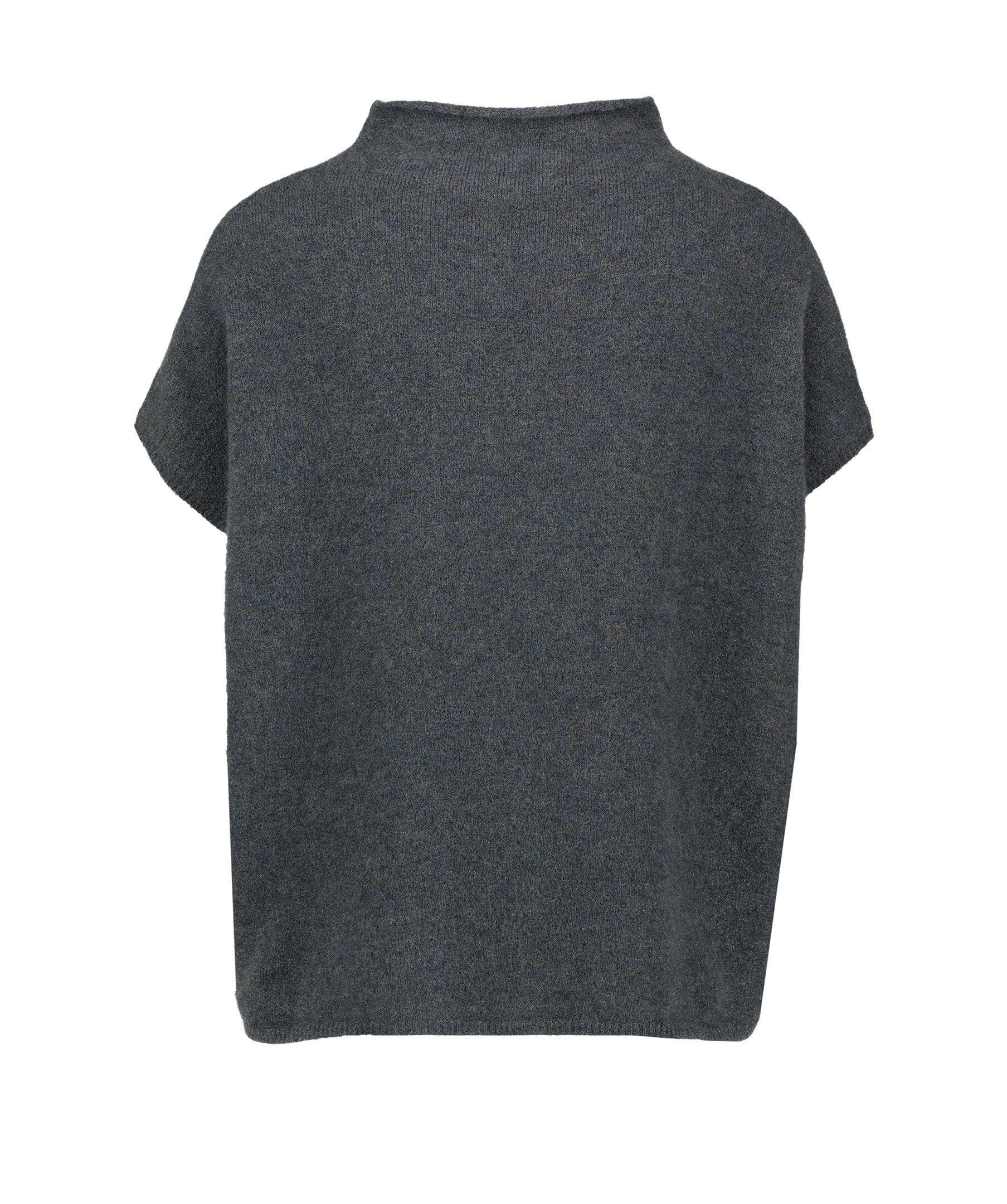 Mörkgrå stickad tröja med korta ärmar och subtilt inslag av blått och grönt från Filippa K. Tröjan har en vid krage och är gjord i en ullblandning. Droppade axlar och avslappnad passform.