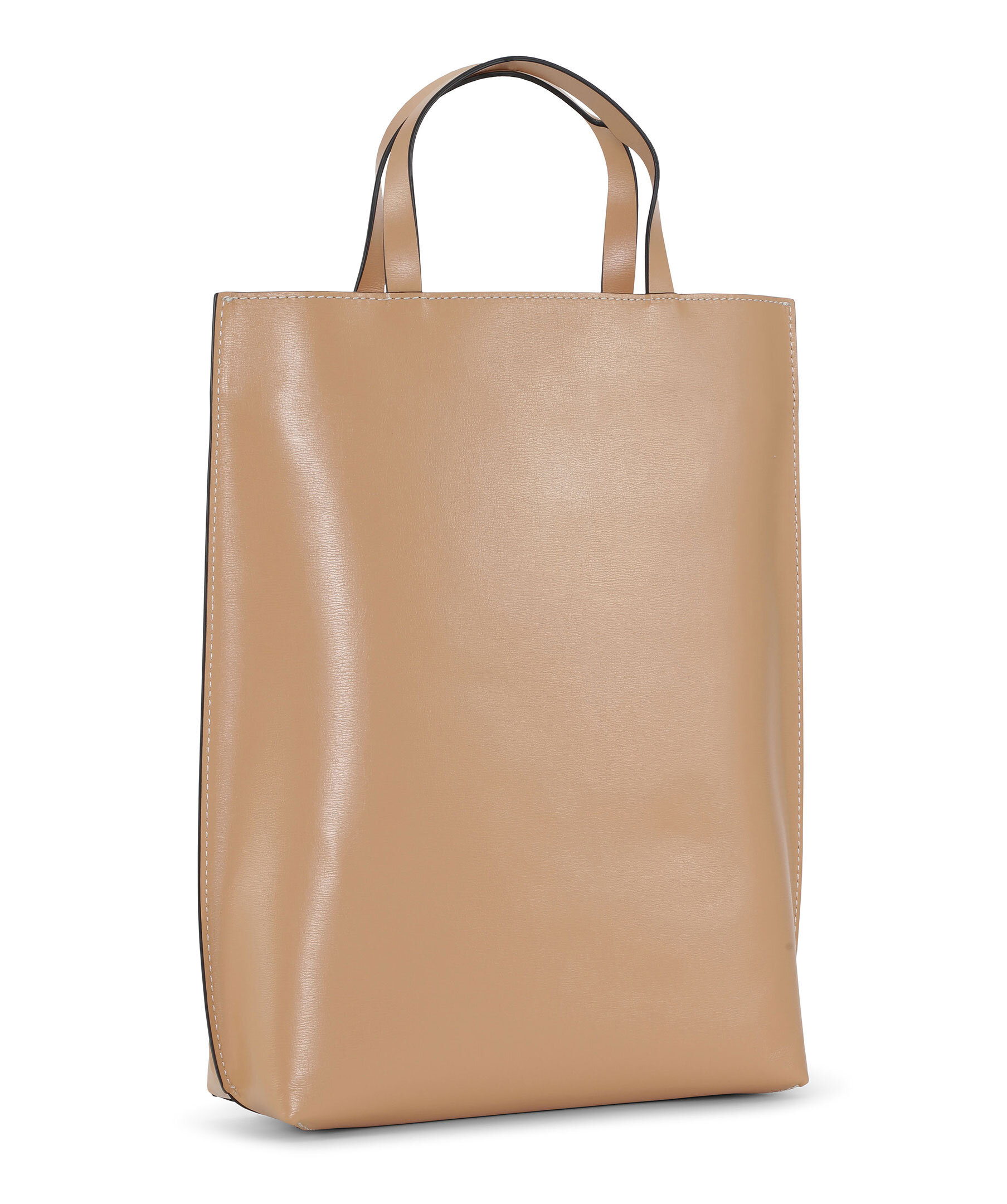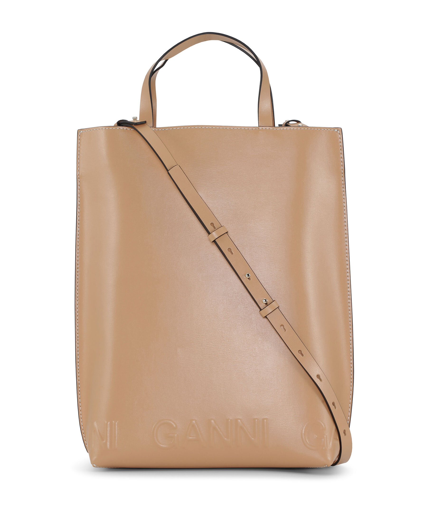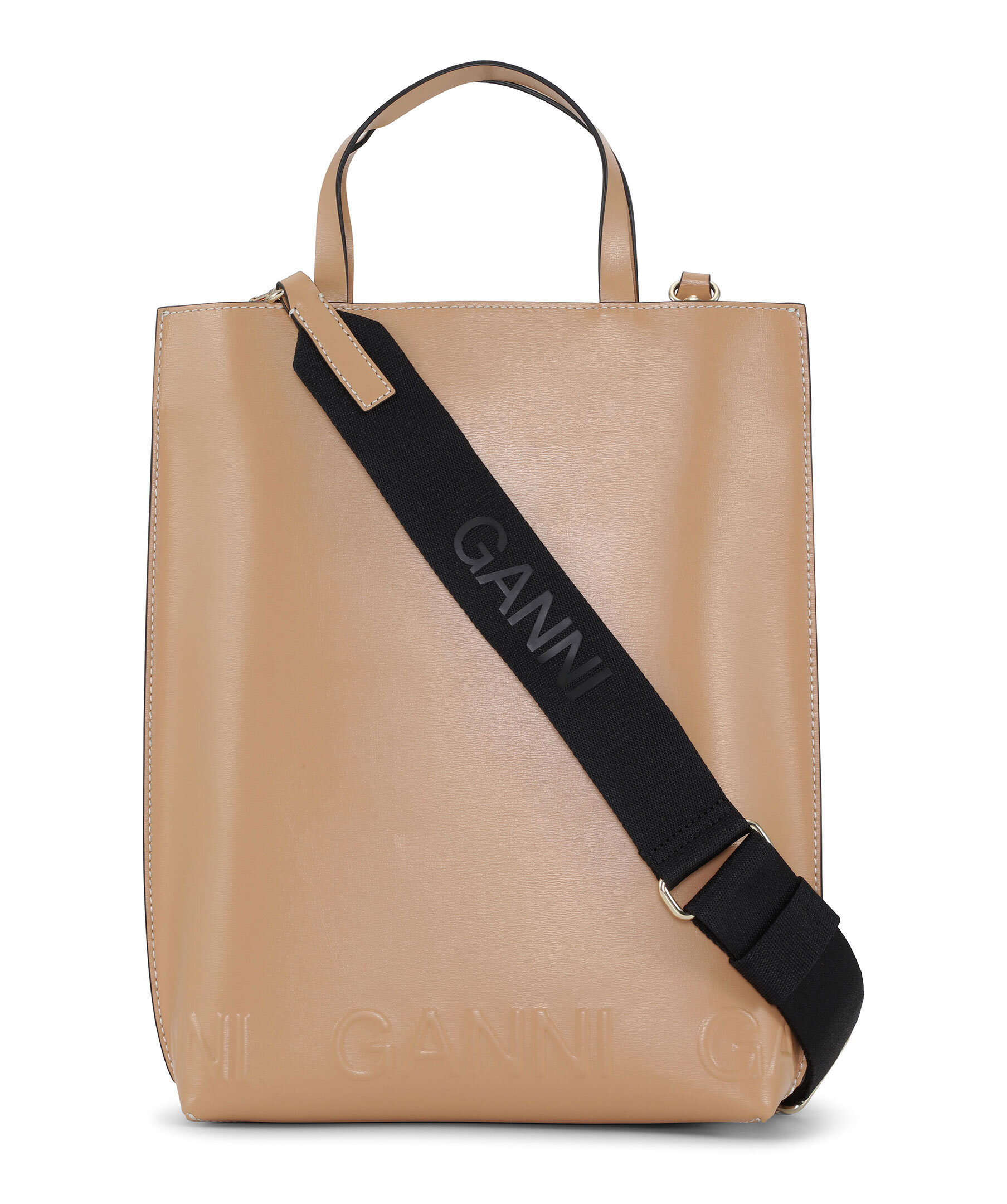 Beige tote bag från Ganni. Justerbar axelrem. Embossad logotyp vid väskans nederkant. Innerficka med dragkedja. huvudfacket stängs med tryckknapp. Gula sömmar. Handtagen har höjden 10cm.
