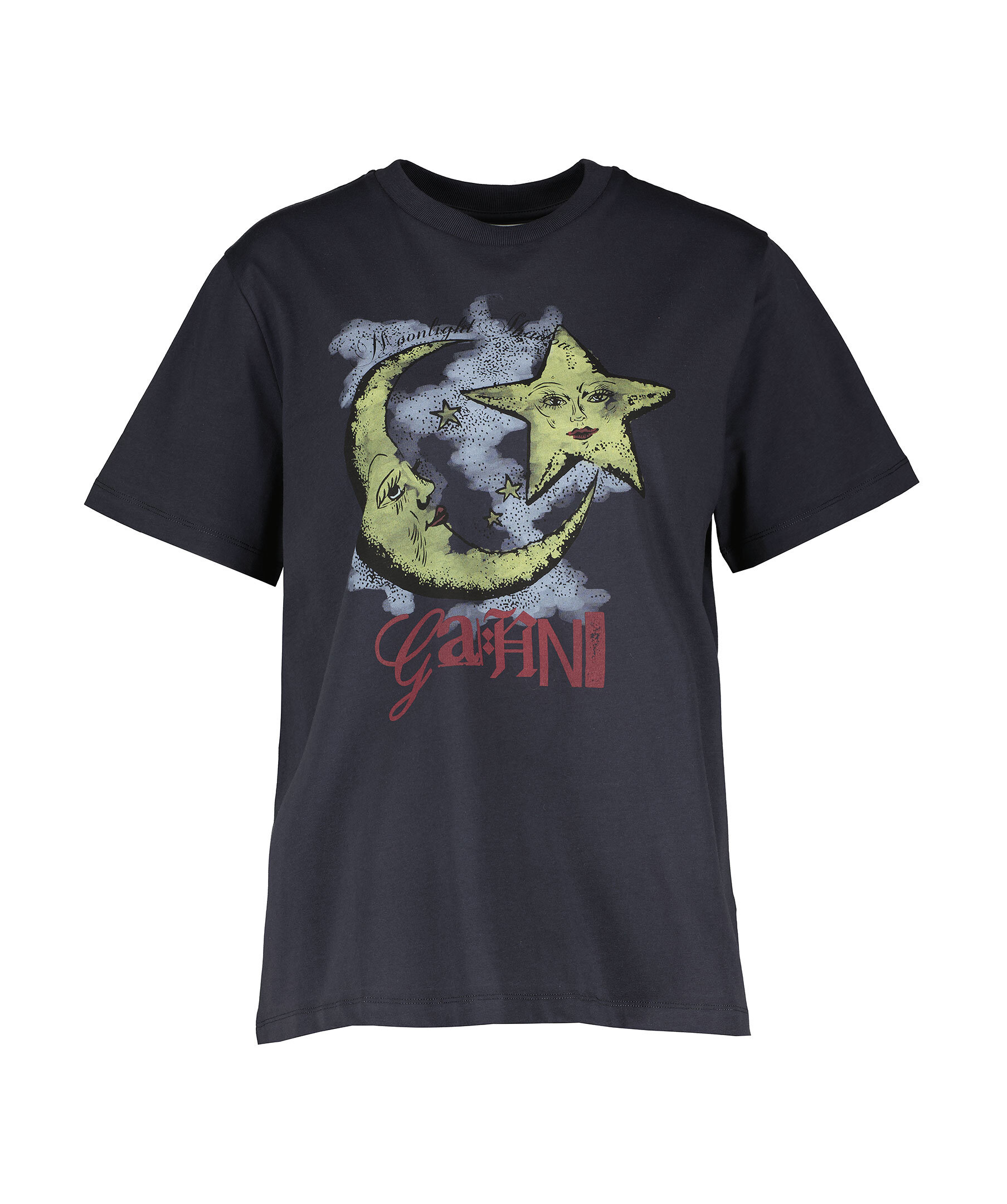 Mörkgrå t-shirt från Ganni. T-shirten har rundad halsringning, korta ärmar samt stort tryck av en månde och stjärna på framsidan. Tillverkad i bomull.
