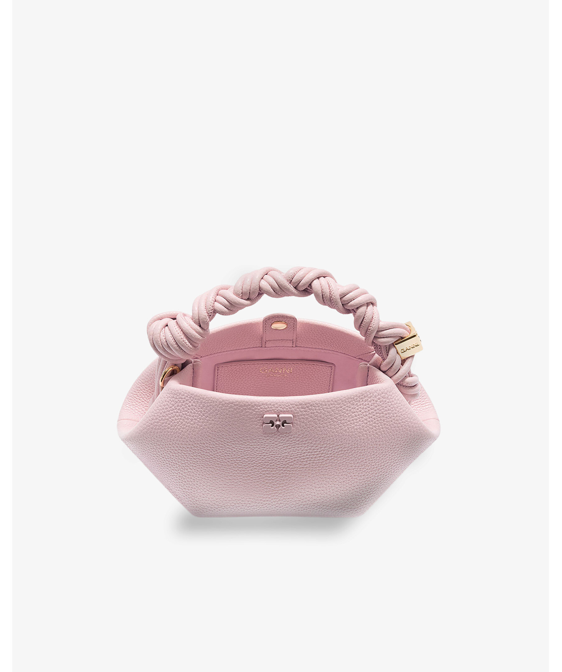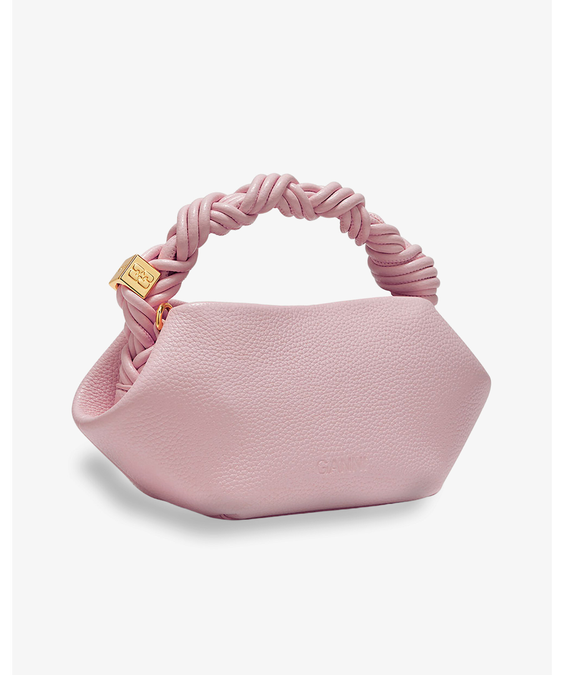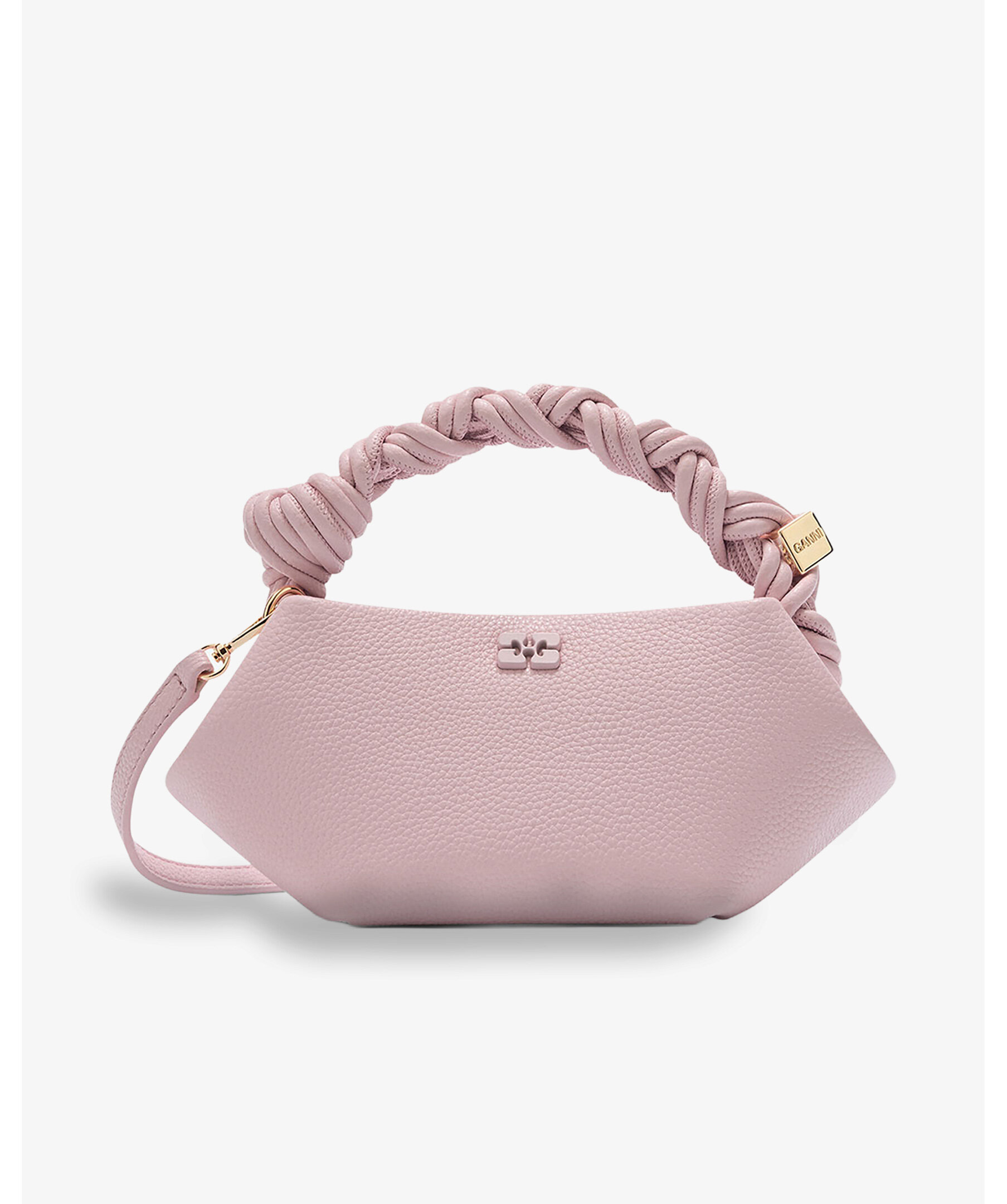 Kompakt rosa mini‑väska från GANNI i kornigt material med vridet flätat topphandtag, justerbar och avtagbar axelrem samt magnetisk stängning. Modellen har en diskret metallisk Butterfly‑logotyp, ett innerfack och är perfekt för att bära dina viktigaste saker i en feminin och trendig silhuett.
