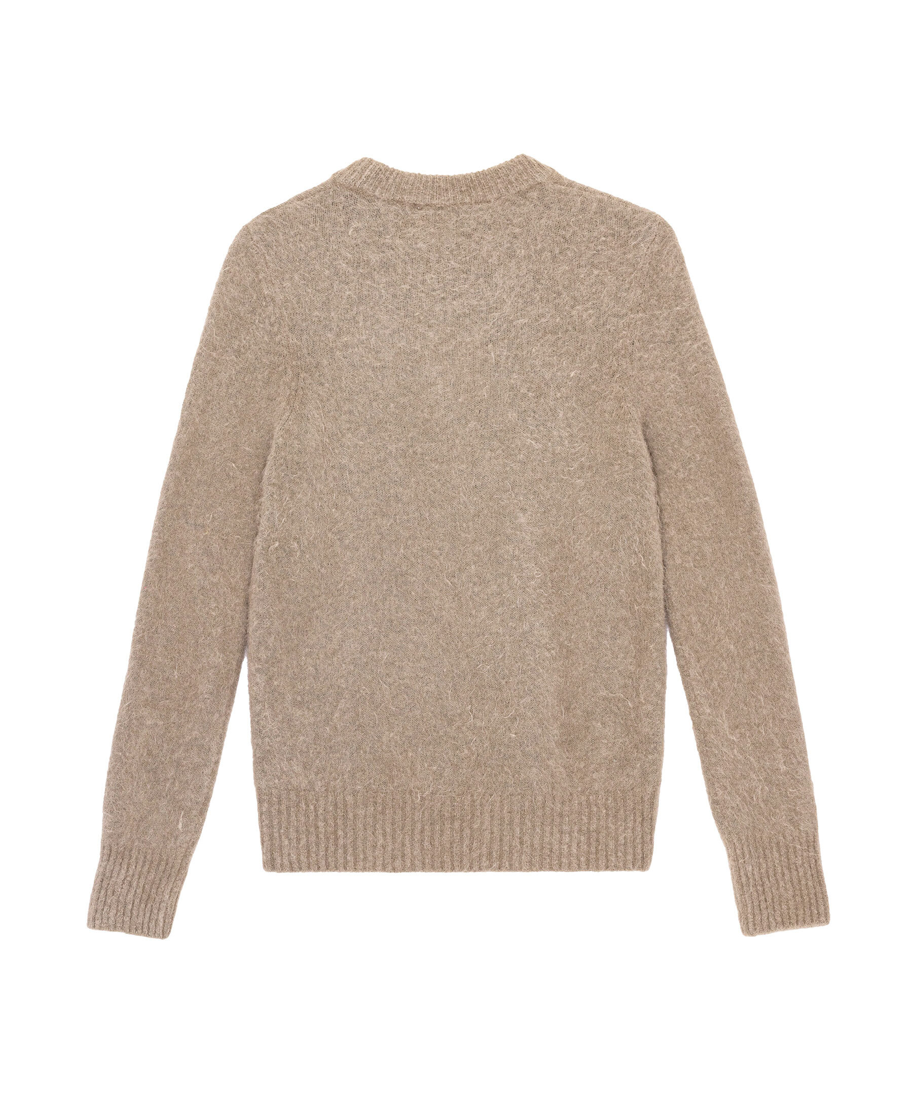 Beige stickad tröja från Ganni. Tillverkad i Tillverkad i Alpacka blandning. Rundad halsringning. Ribbstickad mudd vid kragen, ärm- och plaggslut. Broderad logotyp på vänster sida vid midjan.