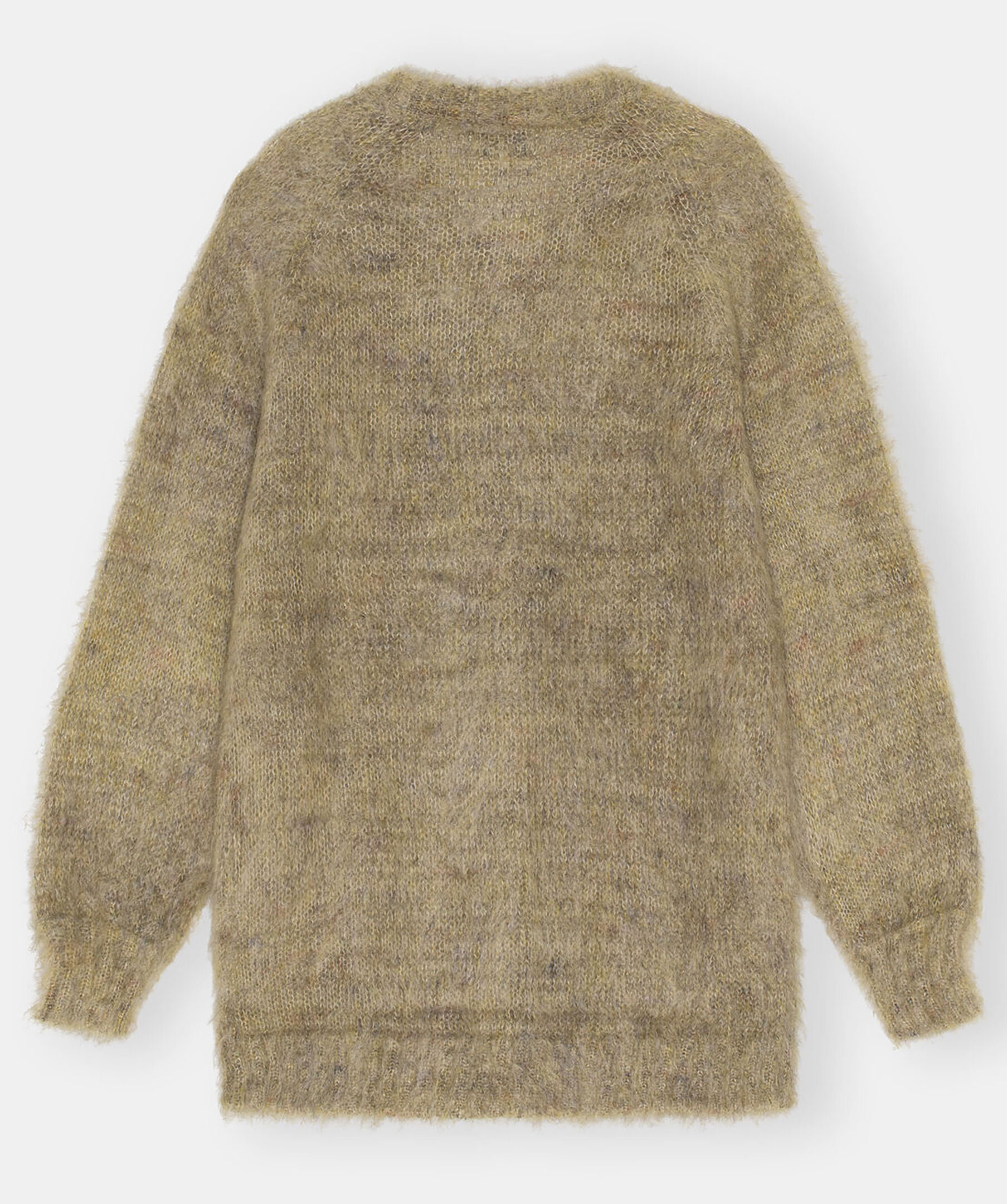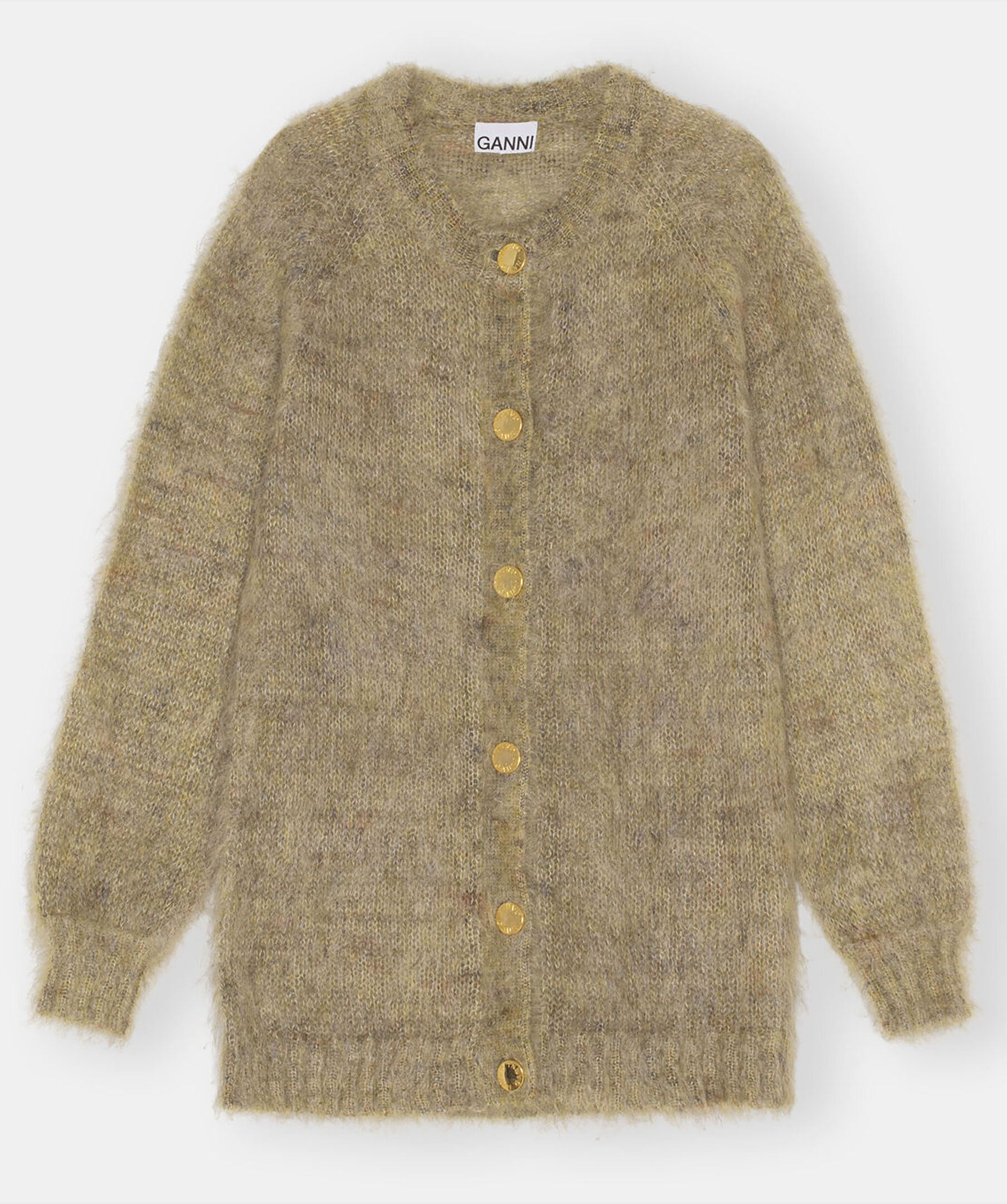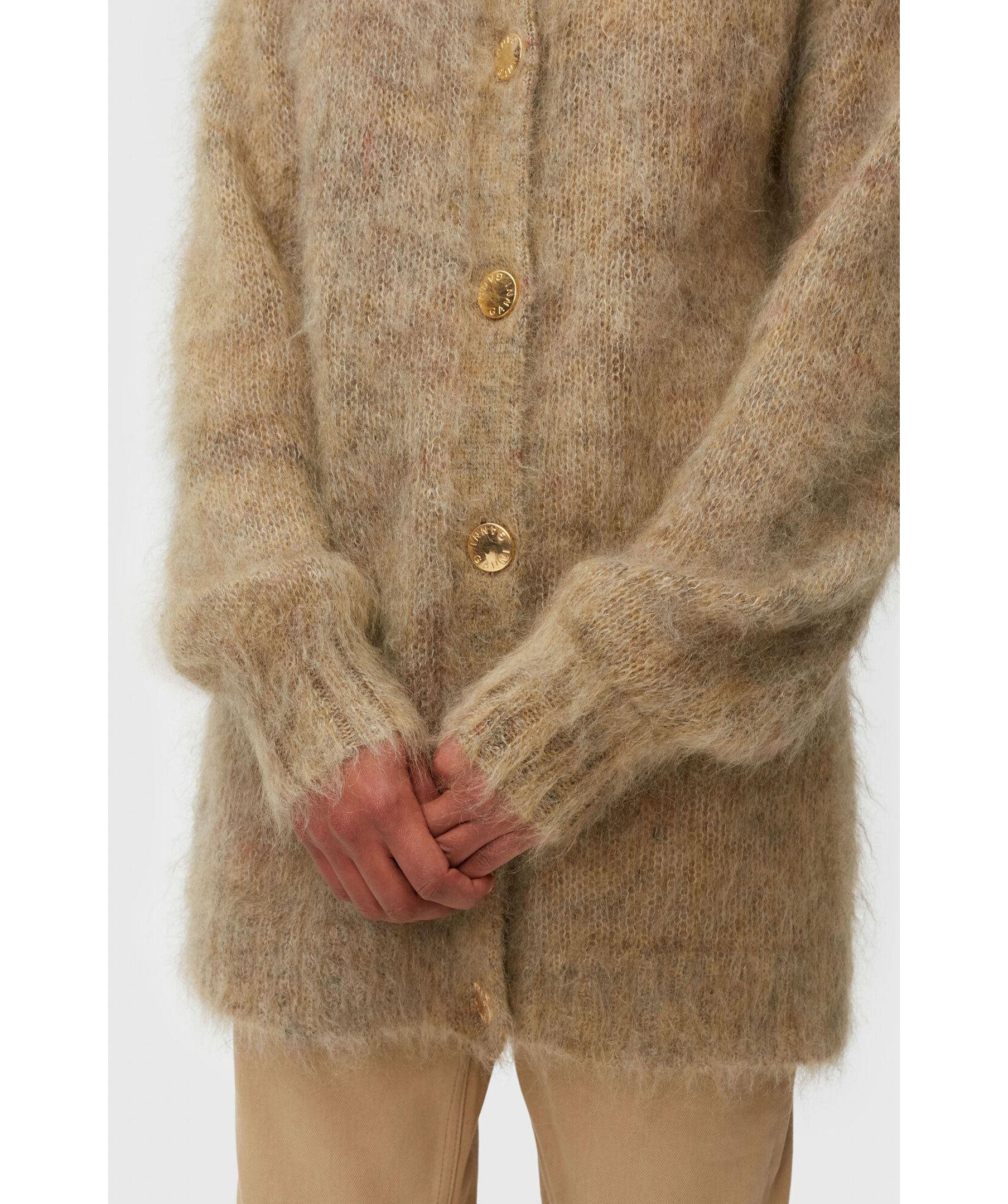 Beige, lång cardigan i borstad mohair från Ganni. Koftan har en rund halsringning, knäppning hela vägen fram med guldfärgade knappar samt har ribbade kanter och en borstad effekt.