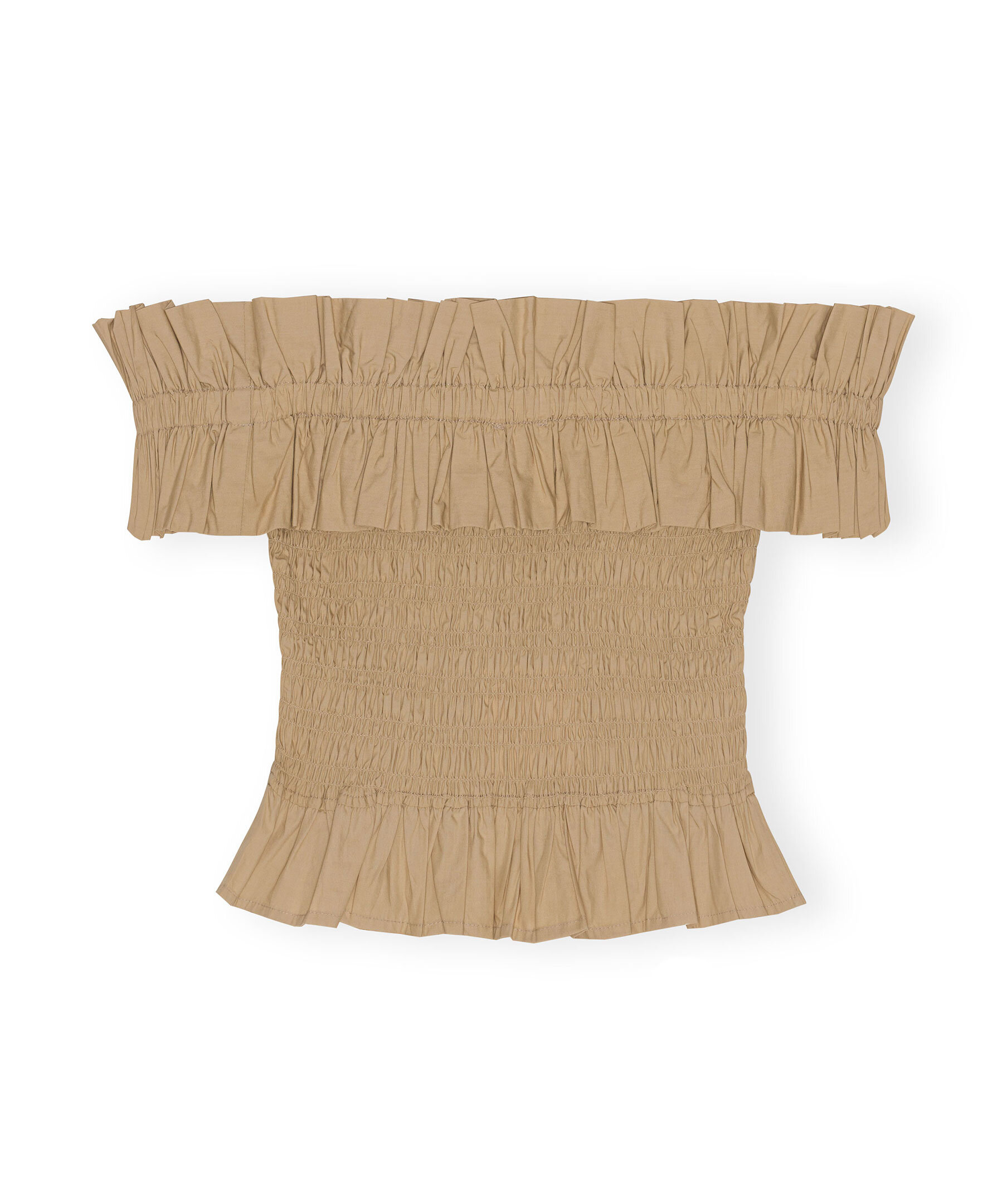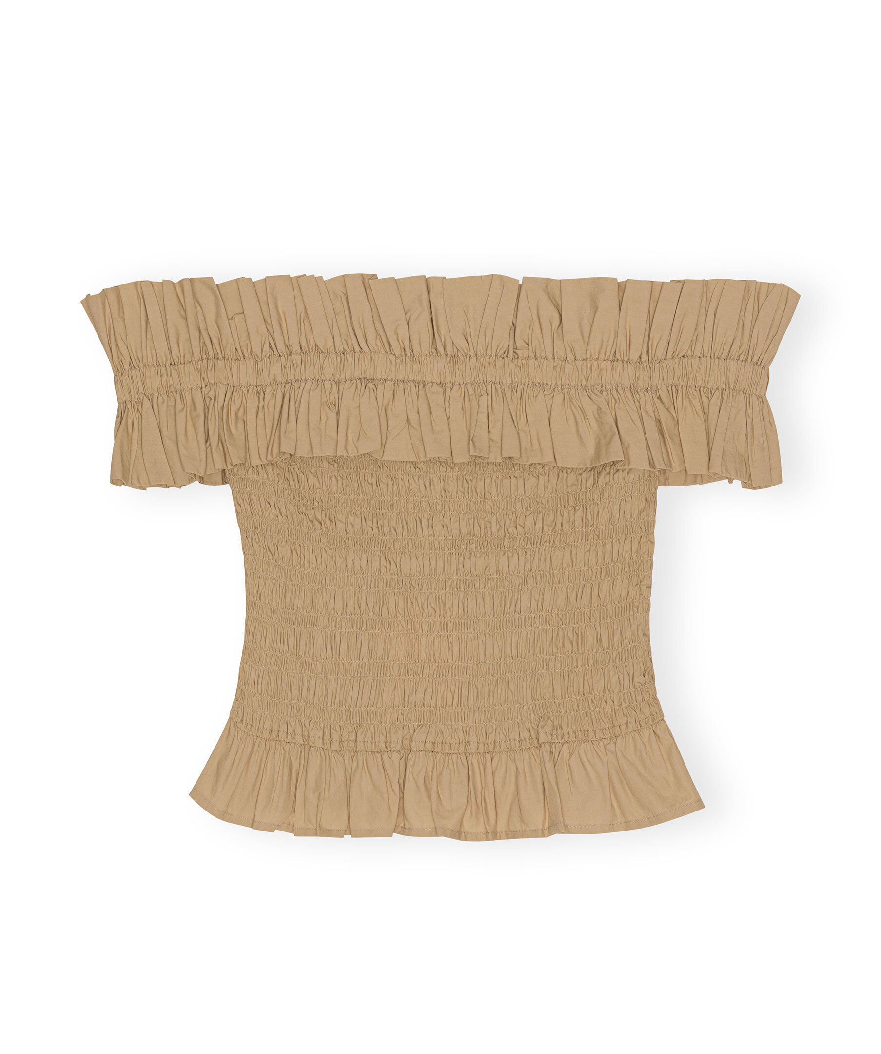 Kamelfärgad Off-shoulder smockad topp från Ganni. Tillverkad av ekologisk bomull. Toppen är utformad för en figursydd silhuett och har en volangprydd off shoulder-ringning, smockat livstycke och volang i fållen.