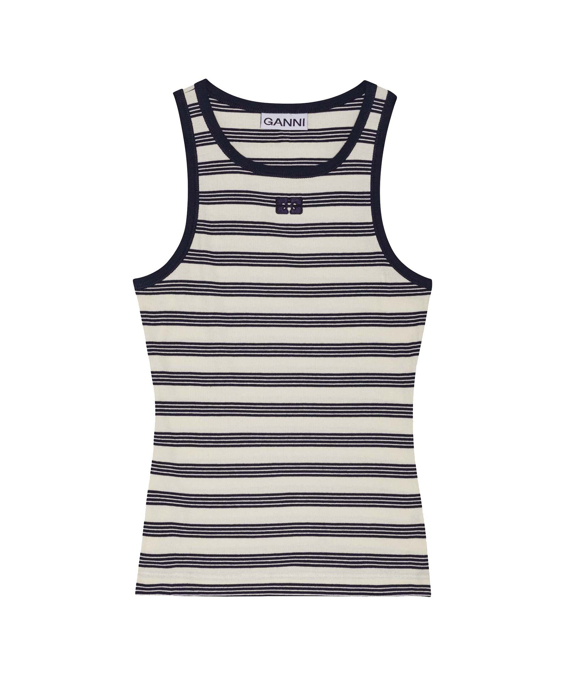 Randigt, ribbstickat linne från Ganni. Linnet har brottarrygg och har broderad GANNI Butterfly-logotyp på bröstet. Tillverkad i en bomullsblandning.