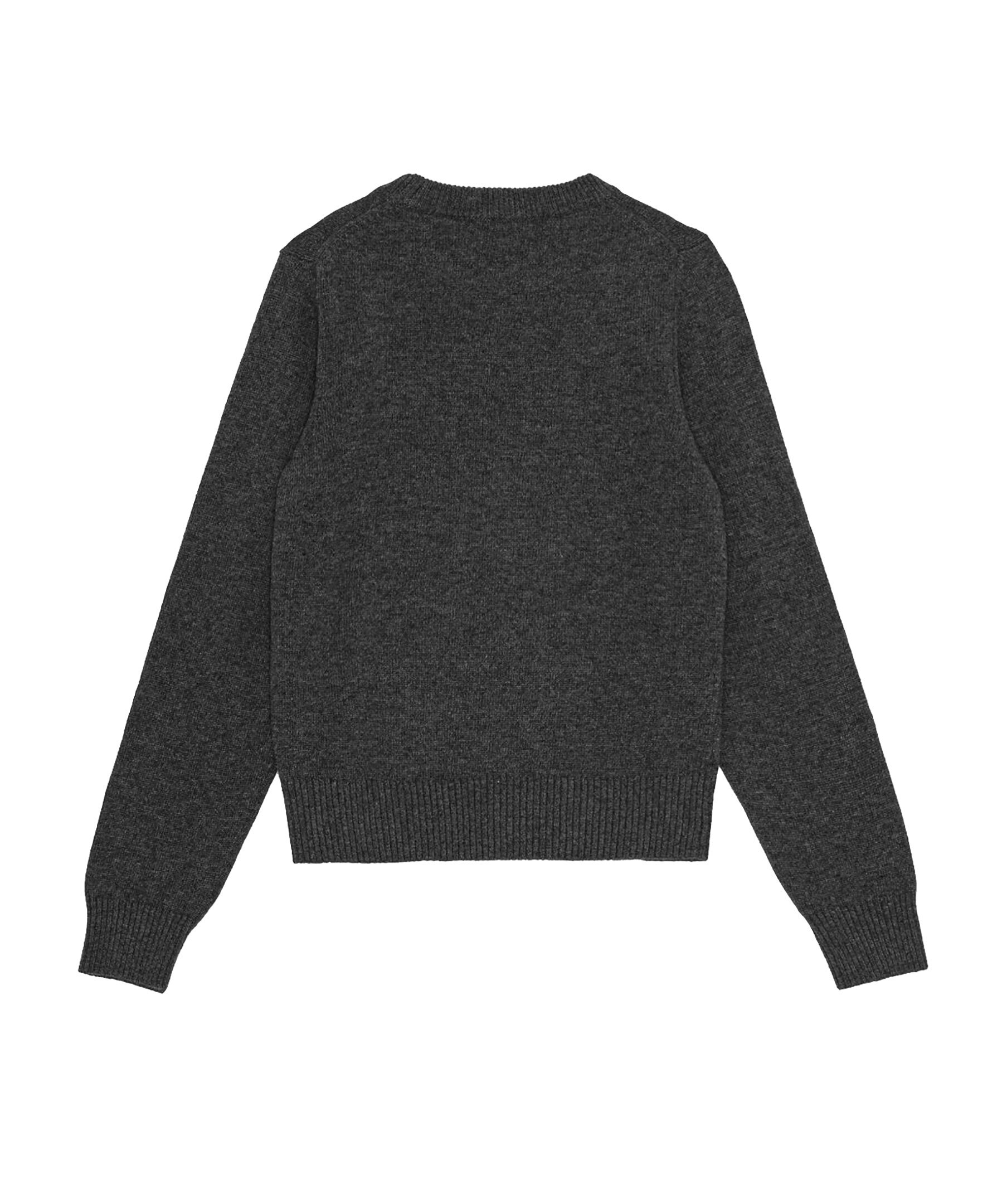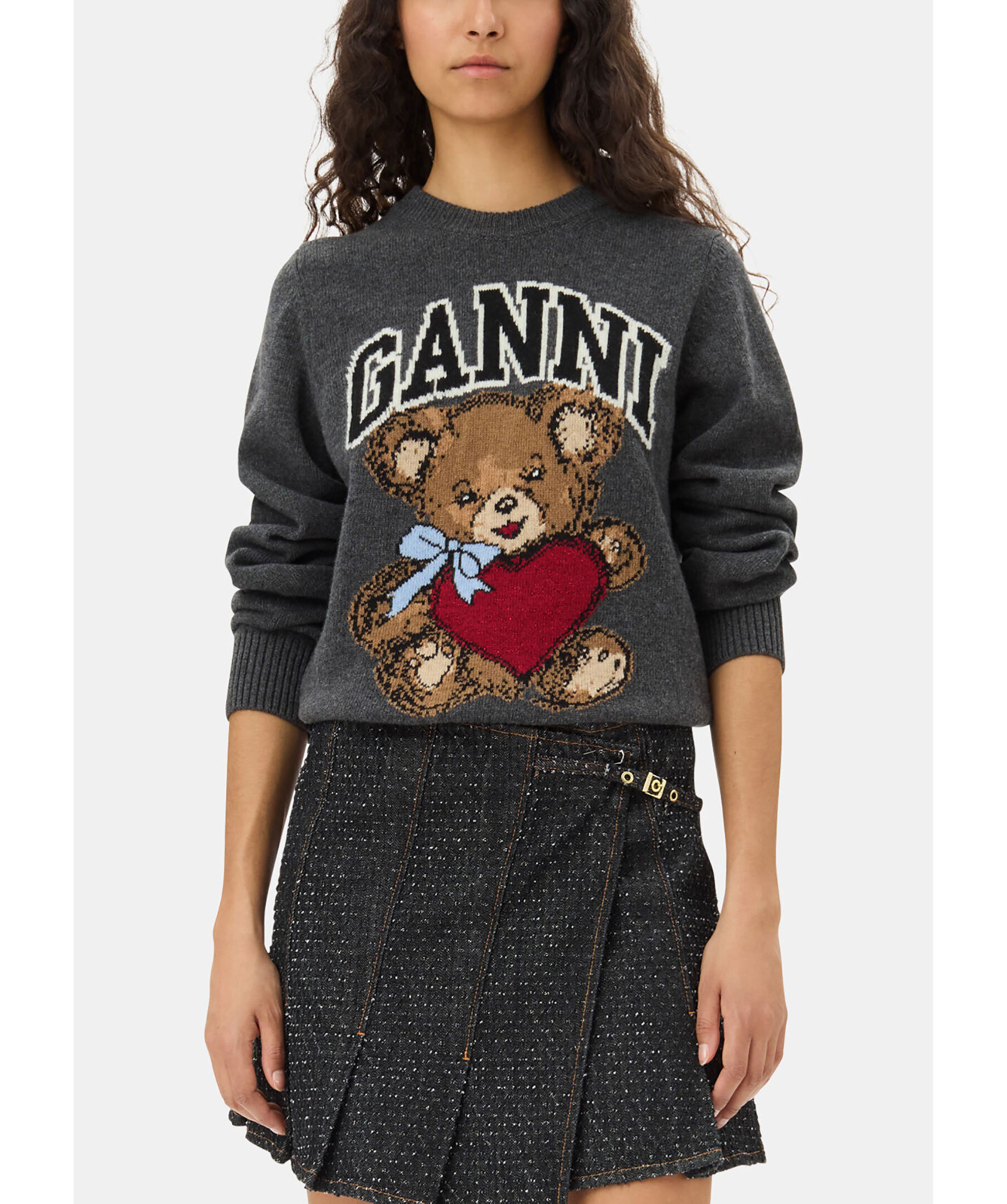 Mörkgrå stickad tröja från Ganni. Tröjan har en rund ribbstickad halsringning samt ribbstickade muddar vid ärm- och plaggslut och ett stickad björnmotiv med logotyp på framsidan. Tillverkad i en ullblandning.