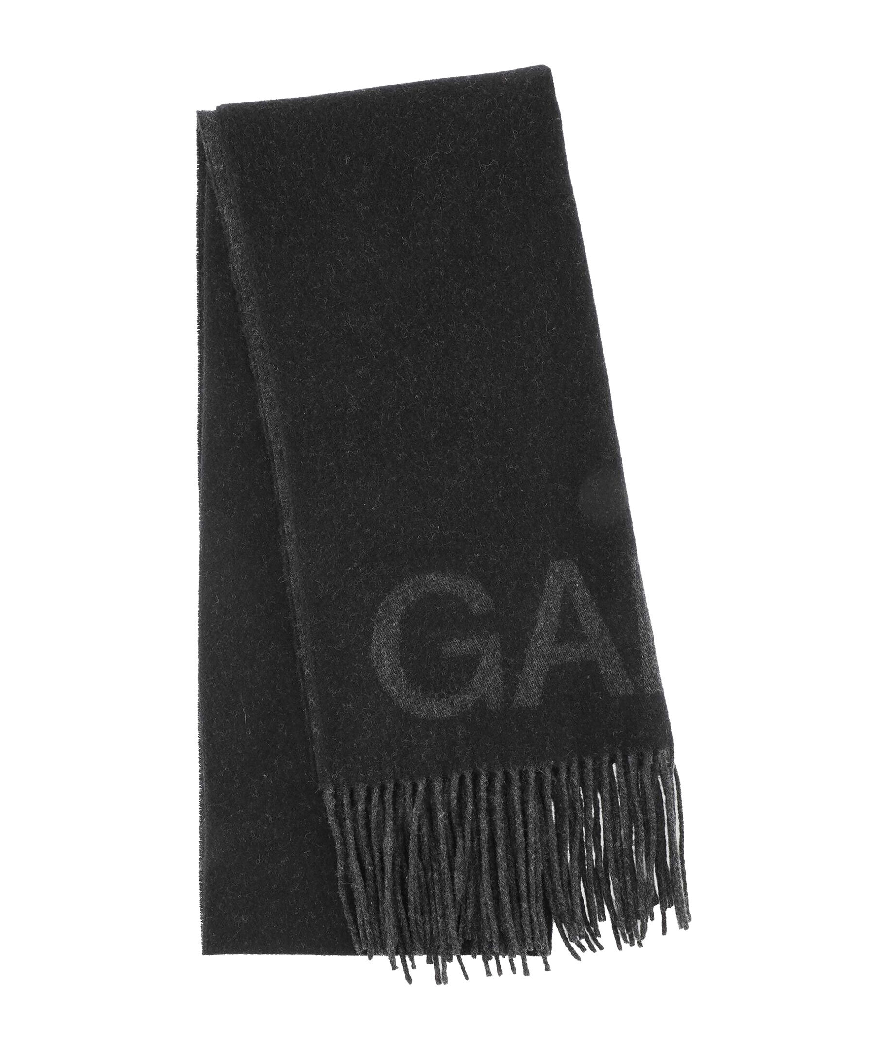 Svart, lång och överdimensionerade halsduk från Ganni. Tvåfärgad i svart och mörkgrått i återvunnen ull. Fransig kant och logotyp på båda sidor. Mått: 230 x 50 cm.