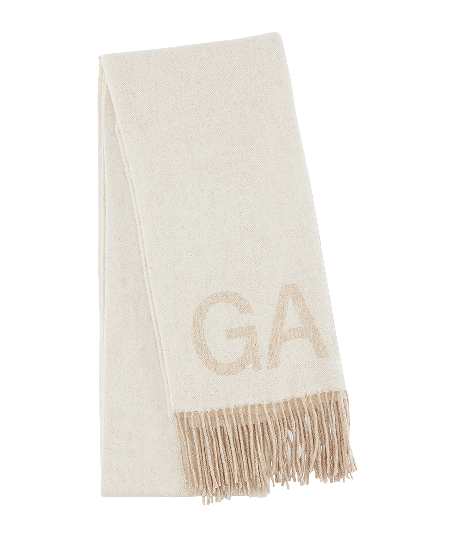 Krämvit, lång och överdimensionerade halsduk från Ganni. Tvåfärgad i krämvitt och ljusbeige i återvunnen ull. Fransig kant och logotyp på båda sidor. Mått: 230 x 50 cm.