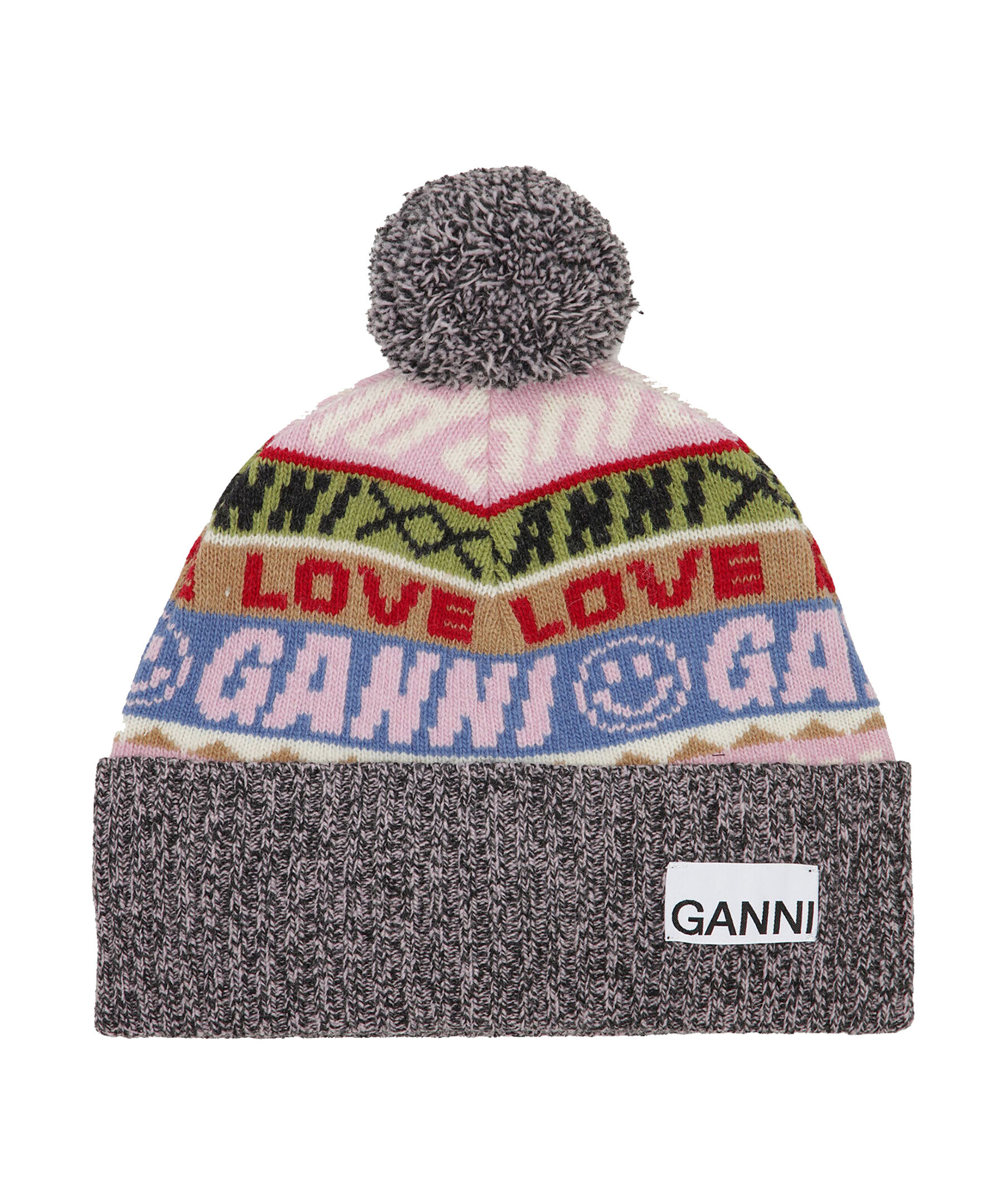 Färgglad, mössa i grafiskt mönster från Ganni. Tillverkad i ullblandning. Mössan har en flerfärgad design med olika mönster, en pompom toffs högst upp och en vit patch med GANNI-logotyp på den uppvikta kanten.