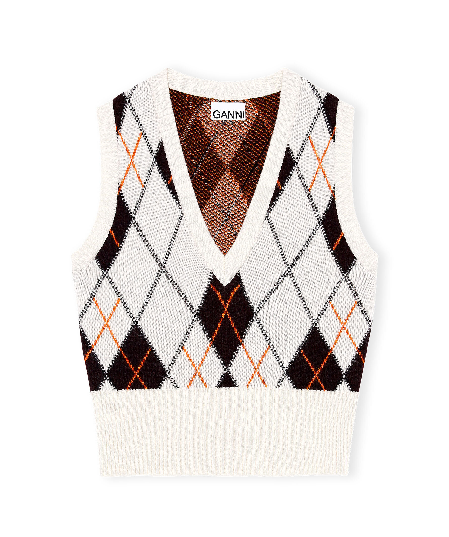 Vit stickad mönstrad väst från Ganni, rutor i mörkbrunt och orange. Västen är V-ringad. Ribbstickade muddar i krage, ärm- och plaggslut.