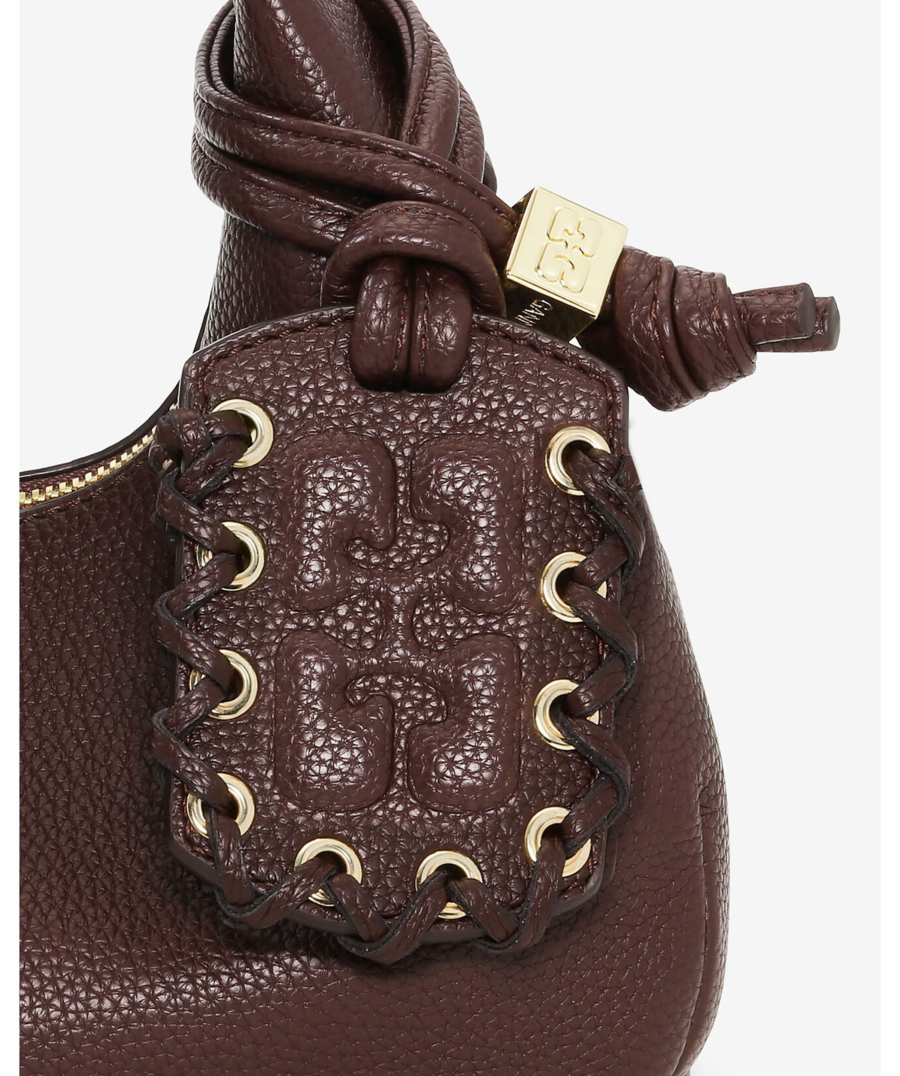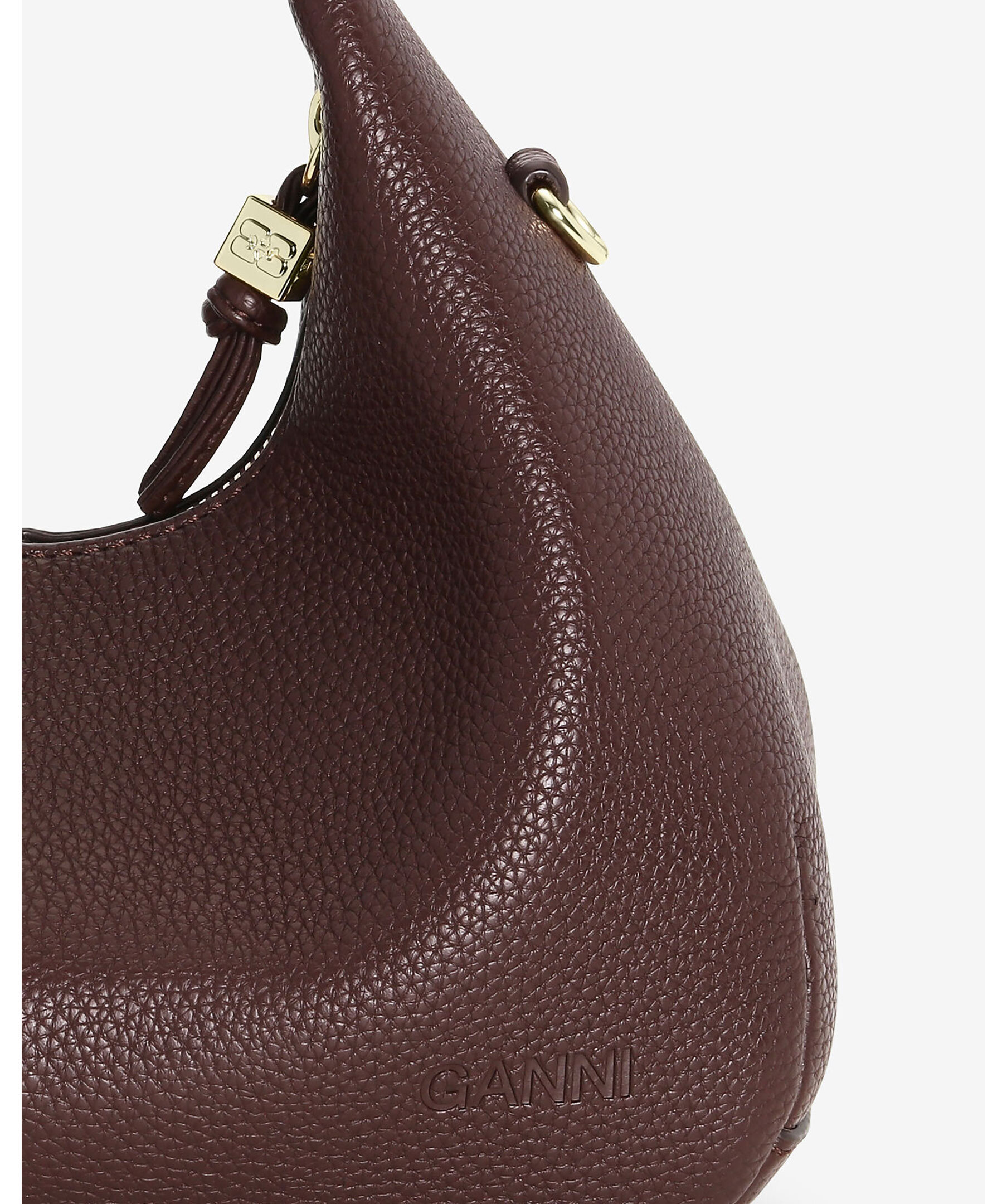 Brun mini hobo-väska från GANNI med struktur och grained finish. Väskan har topphandtag, justerbar/rembar axelrem, dragkedja, intern ficka och guldfärgad logotyp samt dekorativ spegel-hängtag. Väskan är designad för att rymma en iPhone 16 Pro Max, en plånbok, solglasögon, nycklar och ett läppstift.