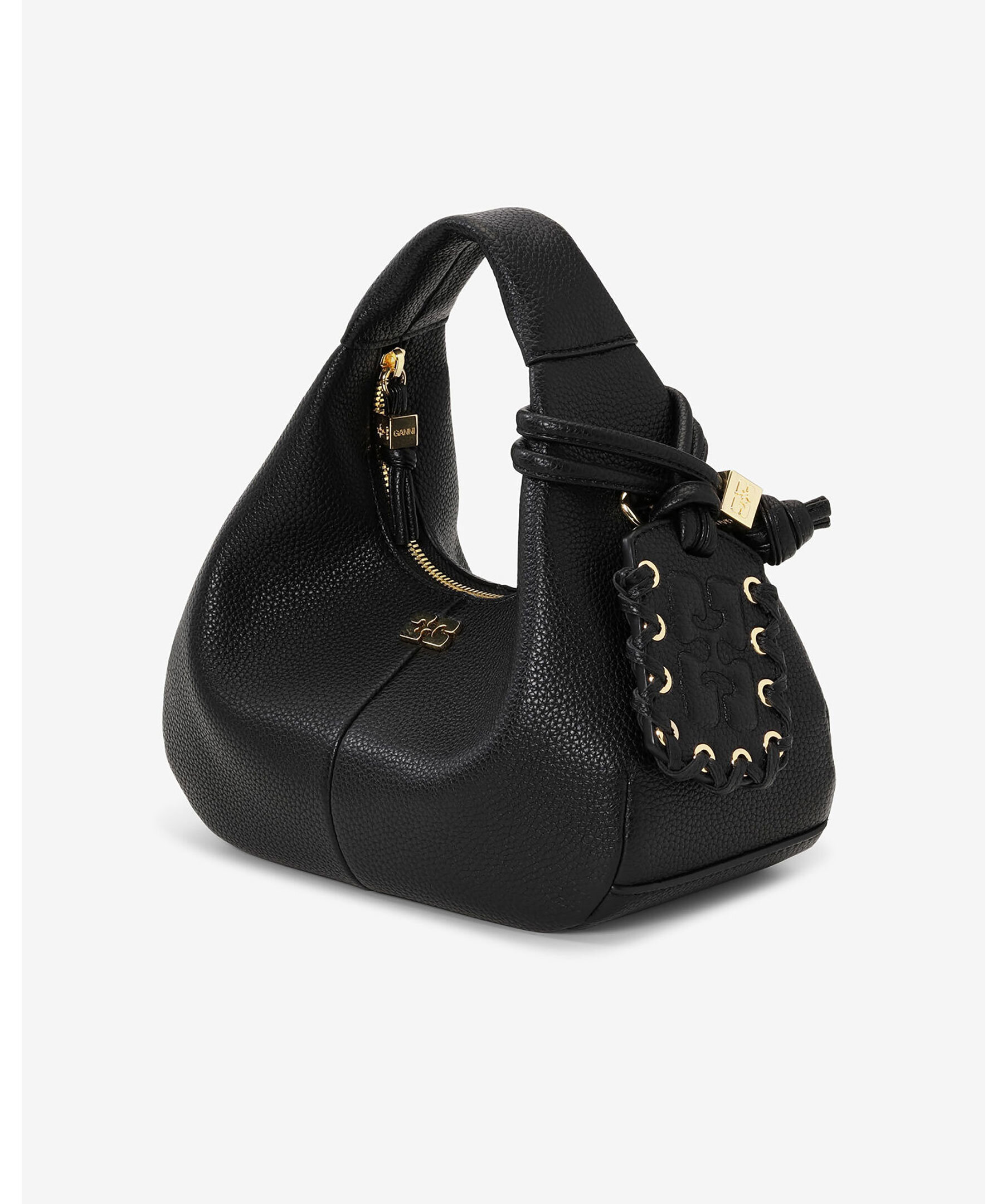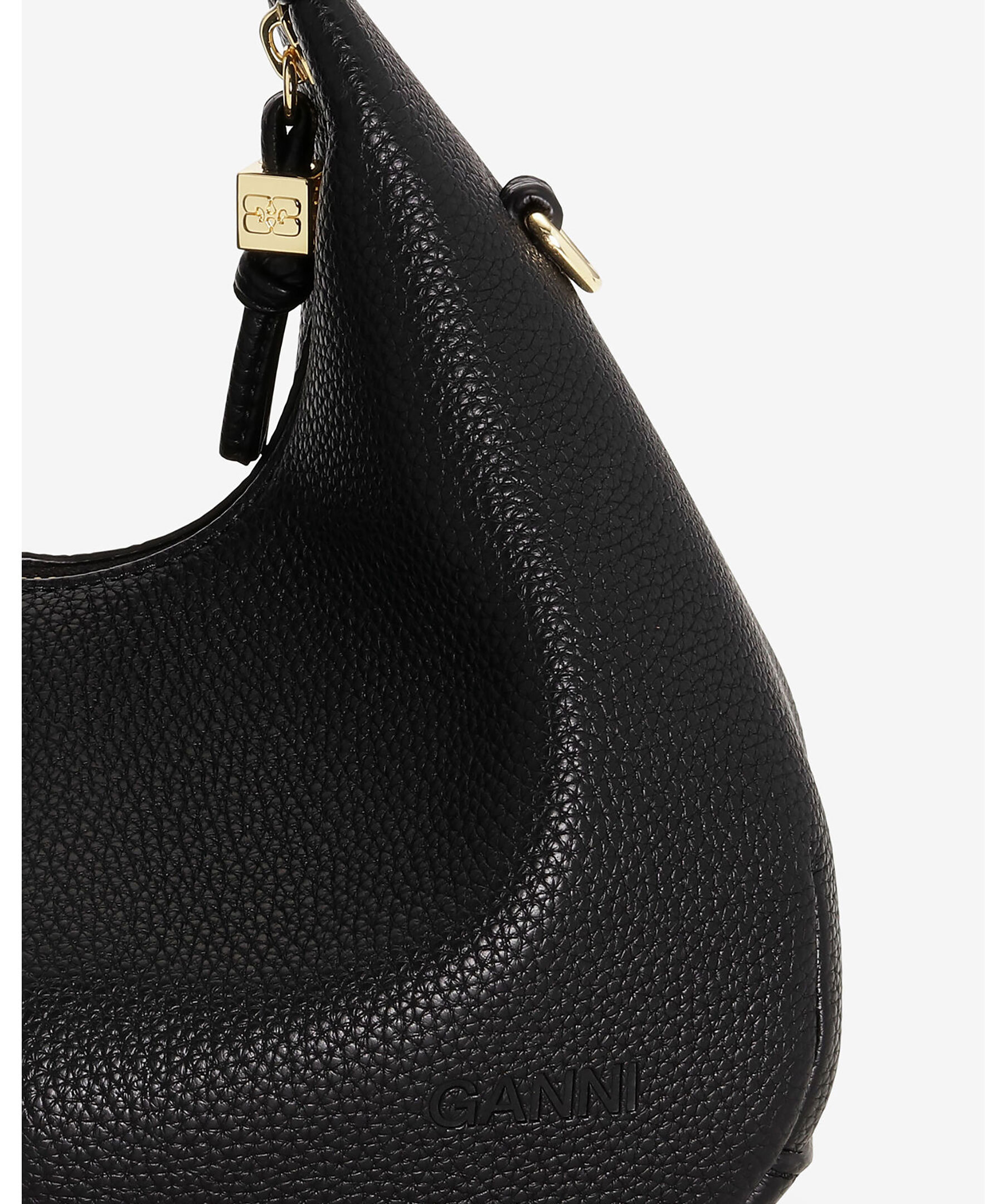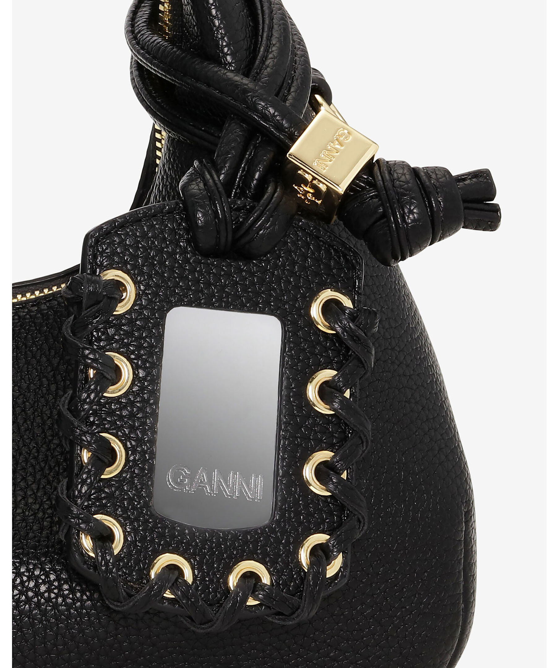 Svart mini hobo-väska från GANNI med struktur och grained finish. Väskan har topphandtag, justerbar/rembar axelrem, zip-stängning, inre ficka och dekorativ spegel-hängtag. Väskan är designad för att rymma en iPhone 16 Pro Max, en plånbok, solglasögon, nycklar och ett läppstift