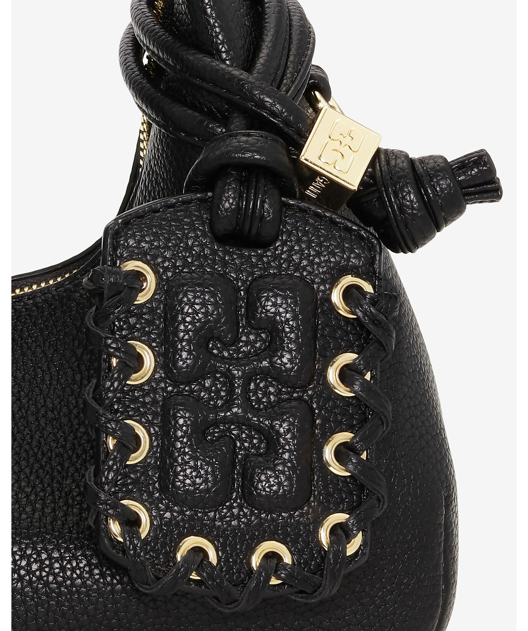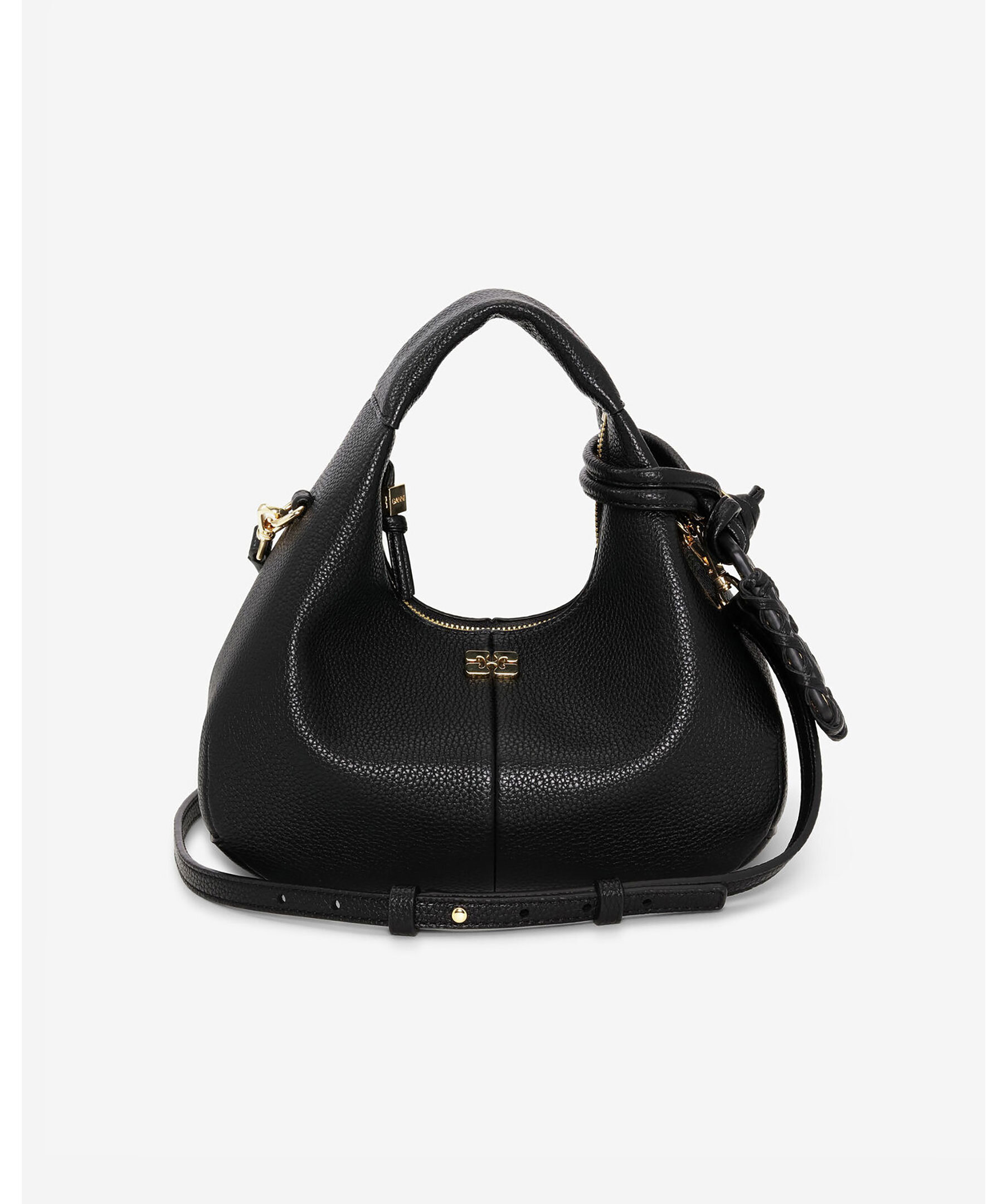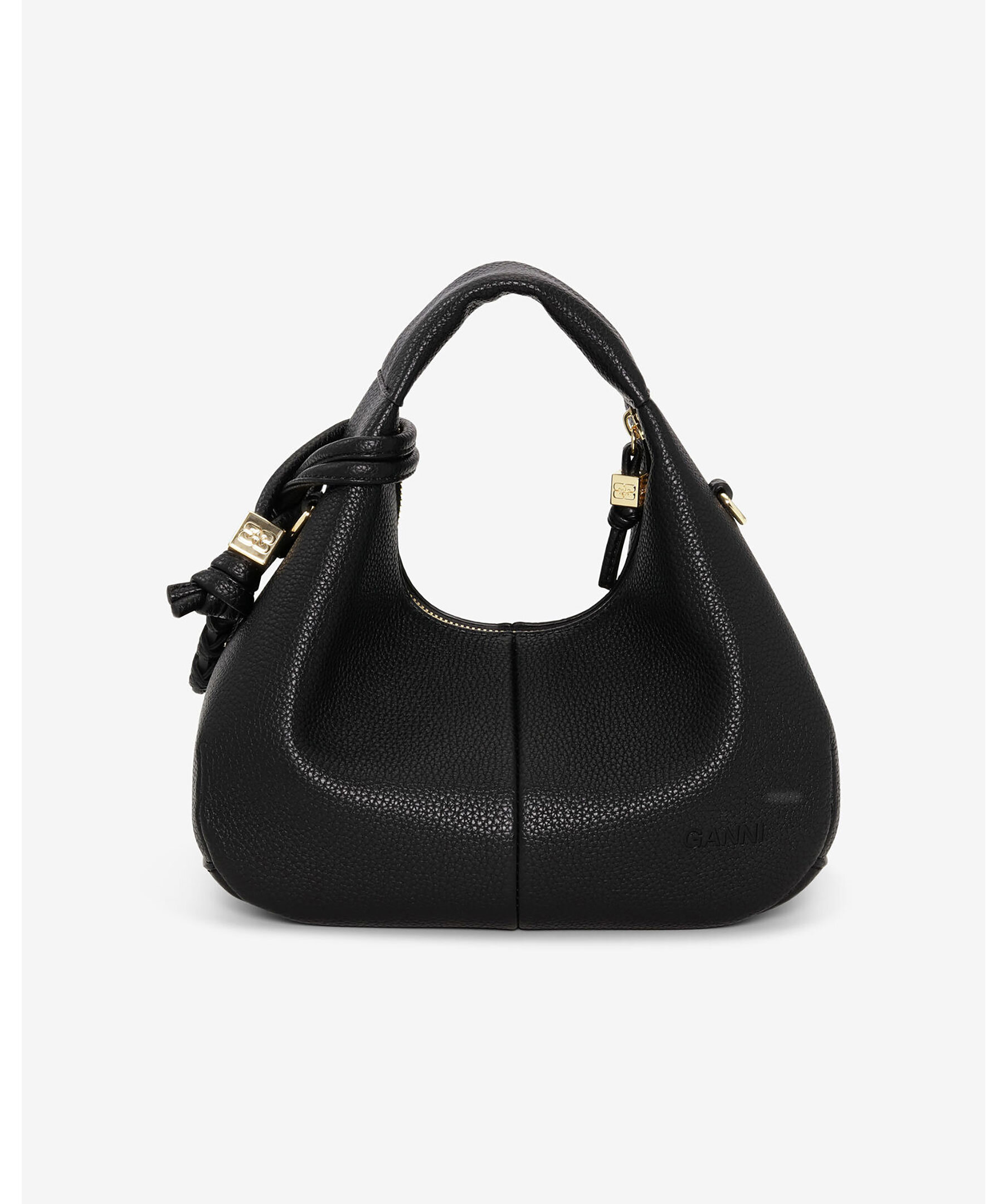 Svart mini hobo-väska från GANNI med struktur och grained finish. Väskan har topphandtag, justerbar/rembar axelrem, zip-stängning, inre ficka och dekorativ spegel-hängtag. Väskan är designad för att rymma en iPhone 16 Pro Max, en plånbok, solglasögon, nycklar och ett läppstift