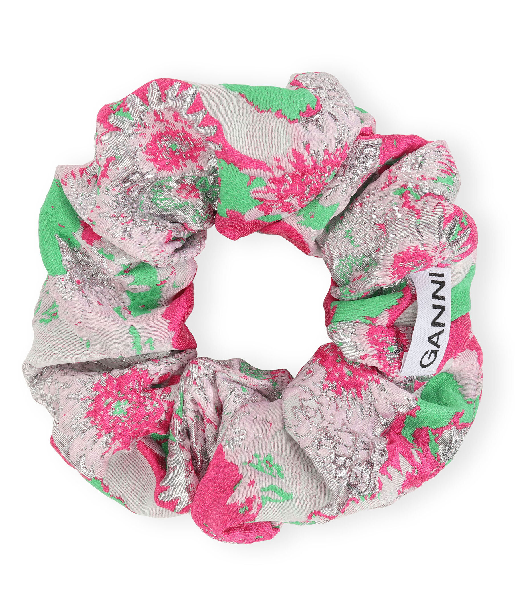 Rosa och grön mönstrad scrunchie med silver detaljer från Ganni. Tillverkad i Jacquardtyg. Patch med logotyp.