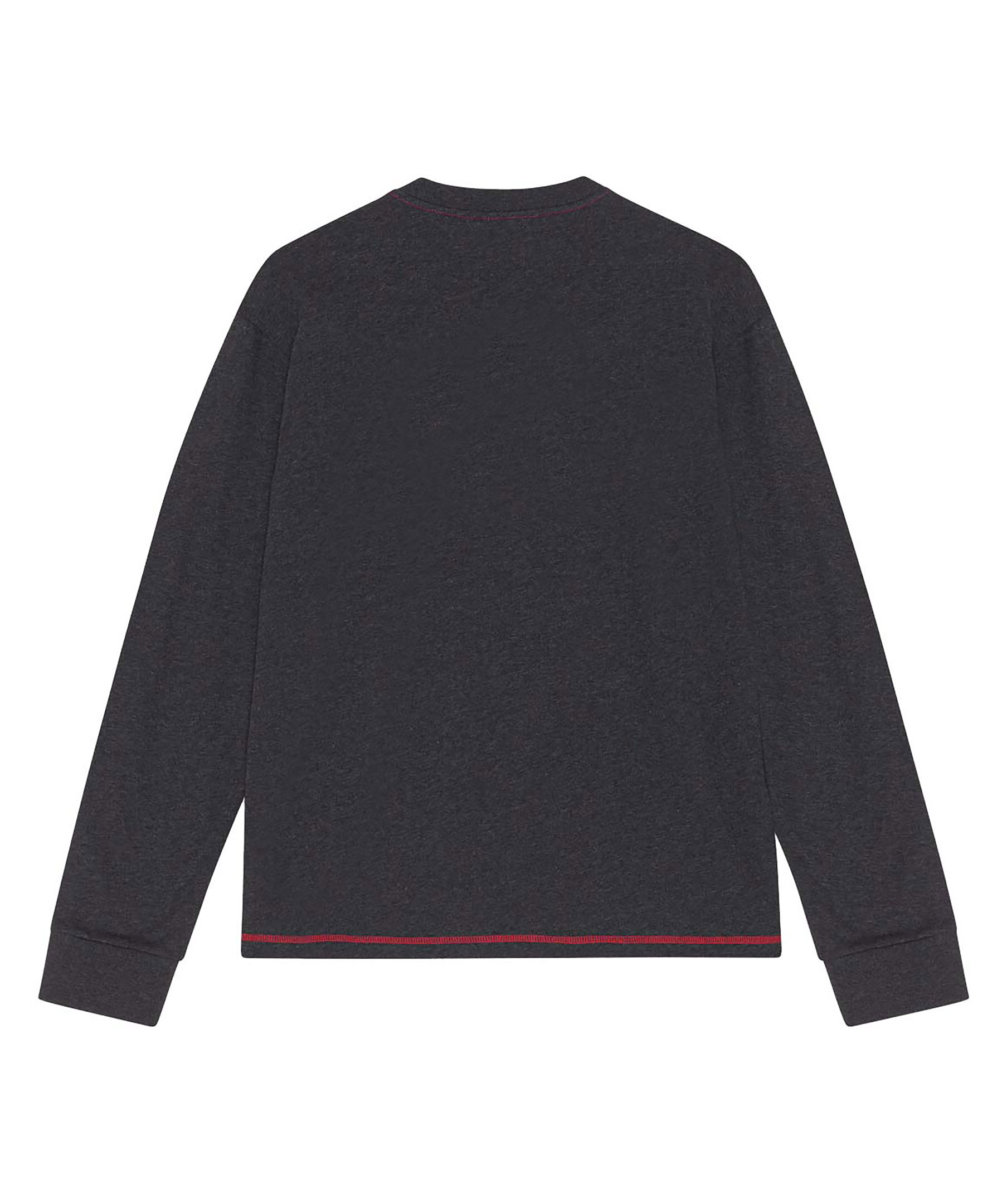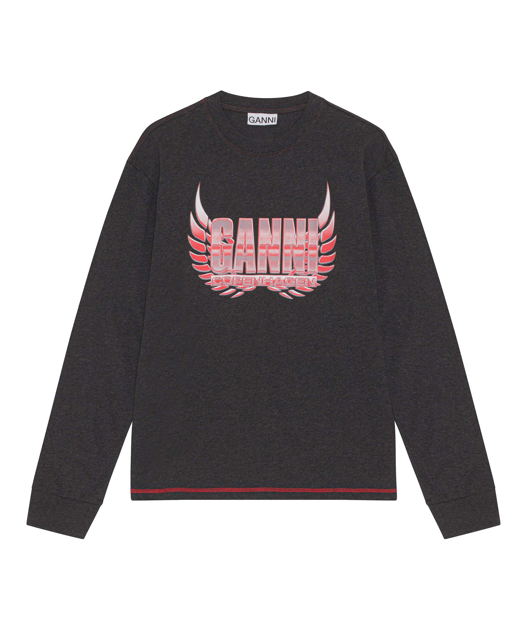 Mörkgrå, mellerad och långärmad t-shirt från Ganni. Tillverkad i 100% certifierad ekologisk bomull. T-shirten har en rund halsringning, tappade axlar, långa ärmar, kontrastsömmar och en GANNI logotyp tryckt över bröstet.