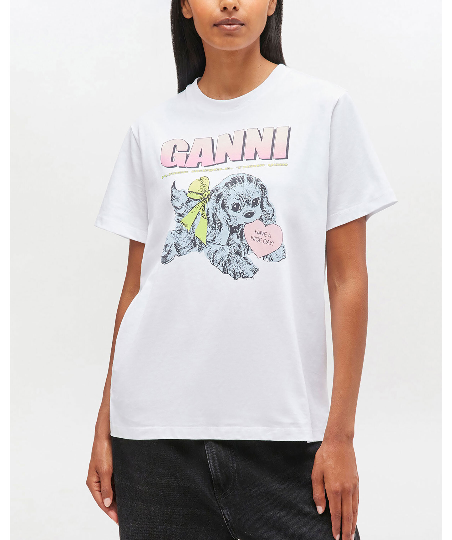 Vit T-shirt med neon-valptryck från GANNI. Tillverkad i bomullsjersey med rund halsringning och kort ärm. Enkel silhuett med grafiskt inslag för modern stil.
