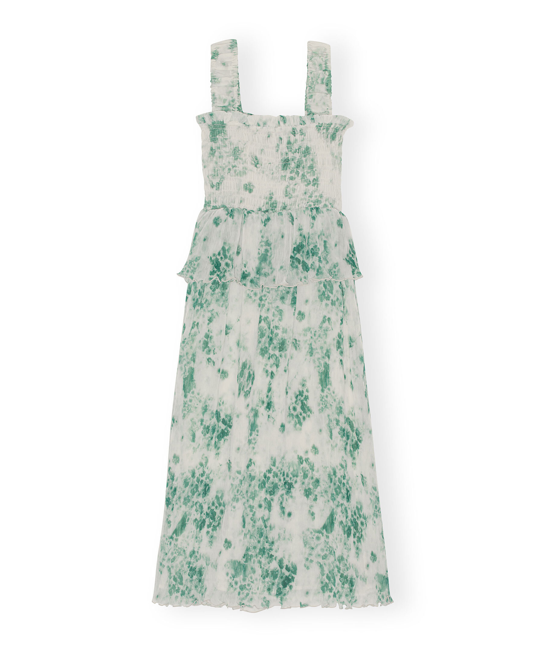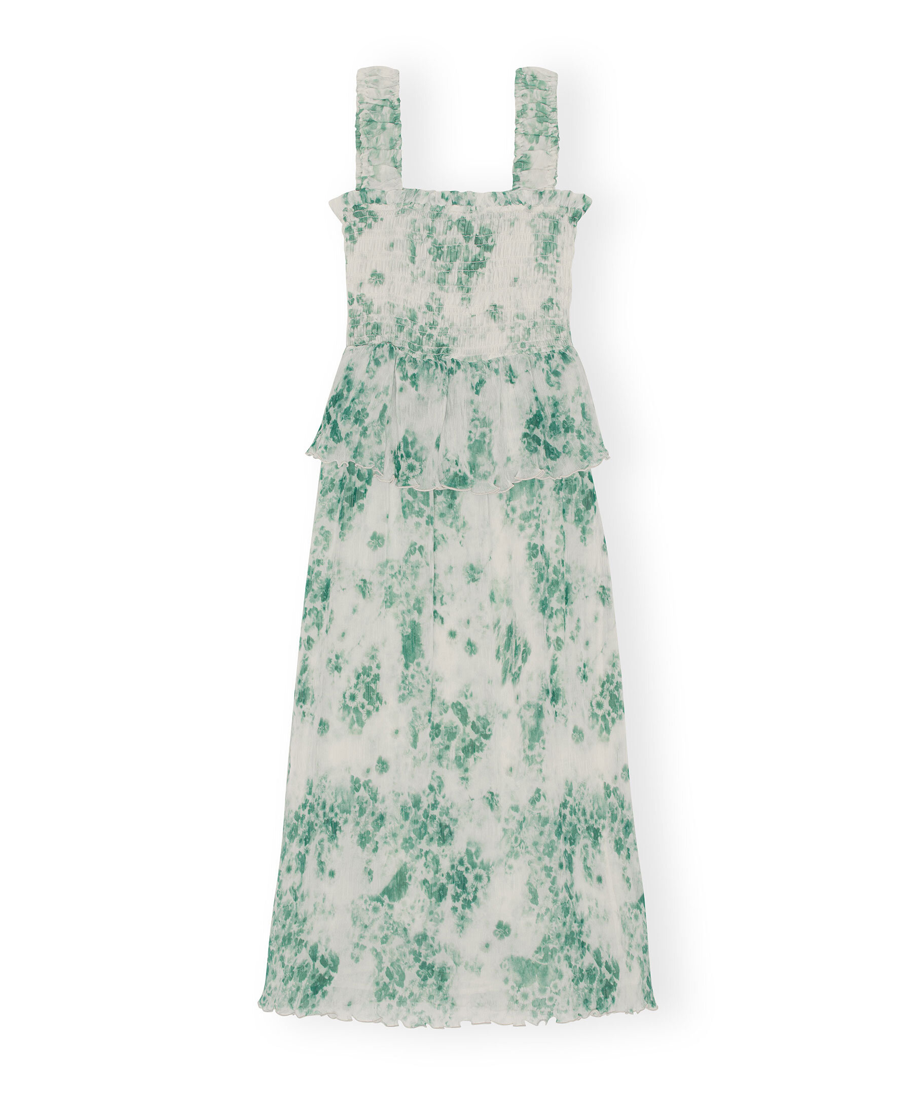 Grön och vit mönstrad plisserad klänning från Ganni. Fyrkantig halsringning. Klänningens liv i smock. Elastiska axelband. Volang vid midjan. Tillverkad i återvunnen polyester.