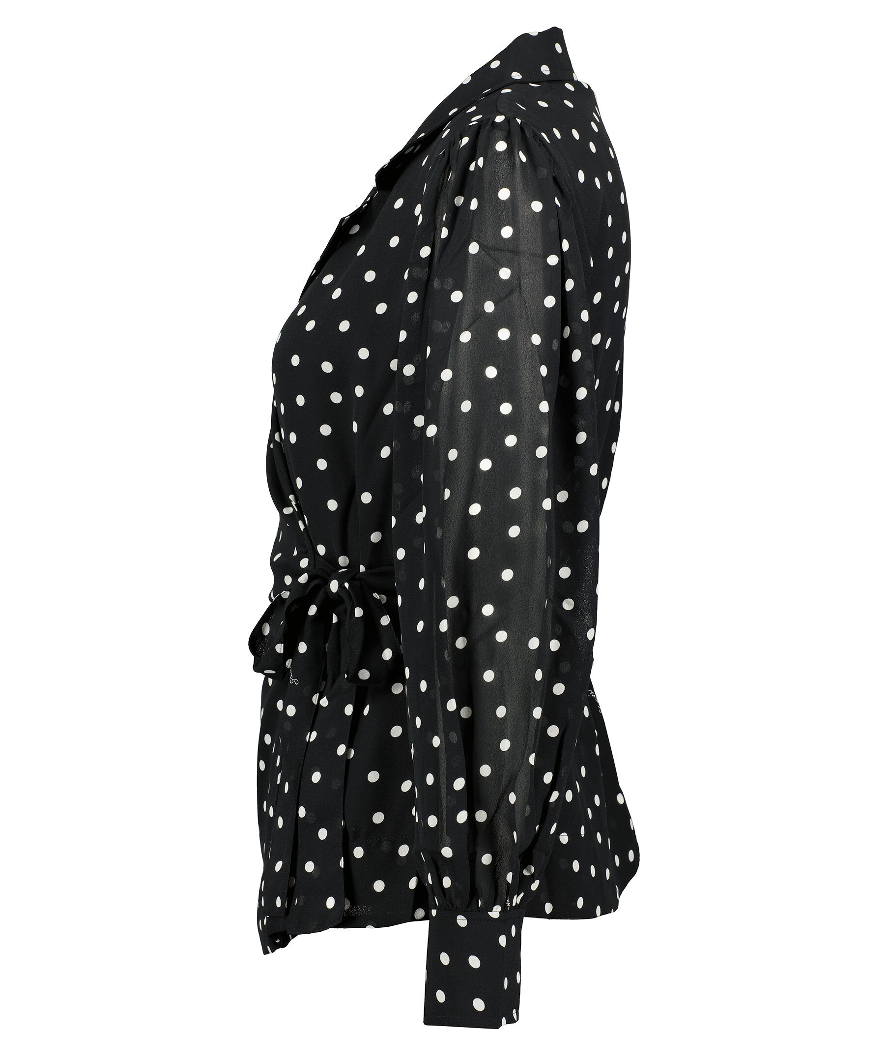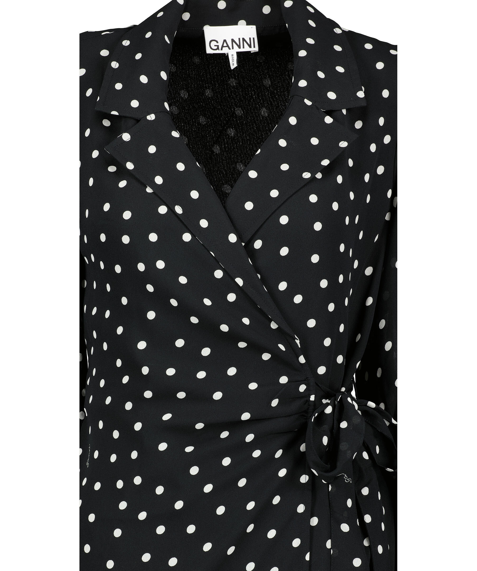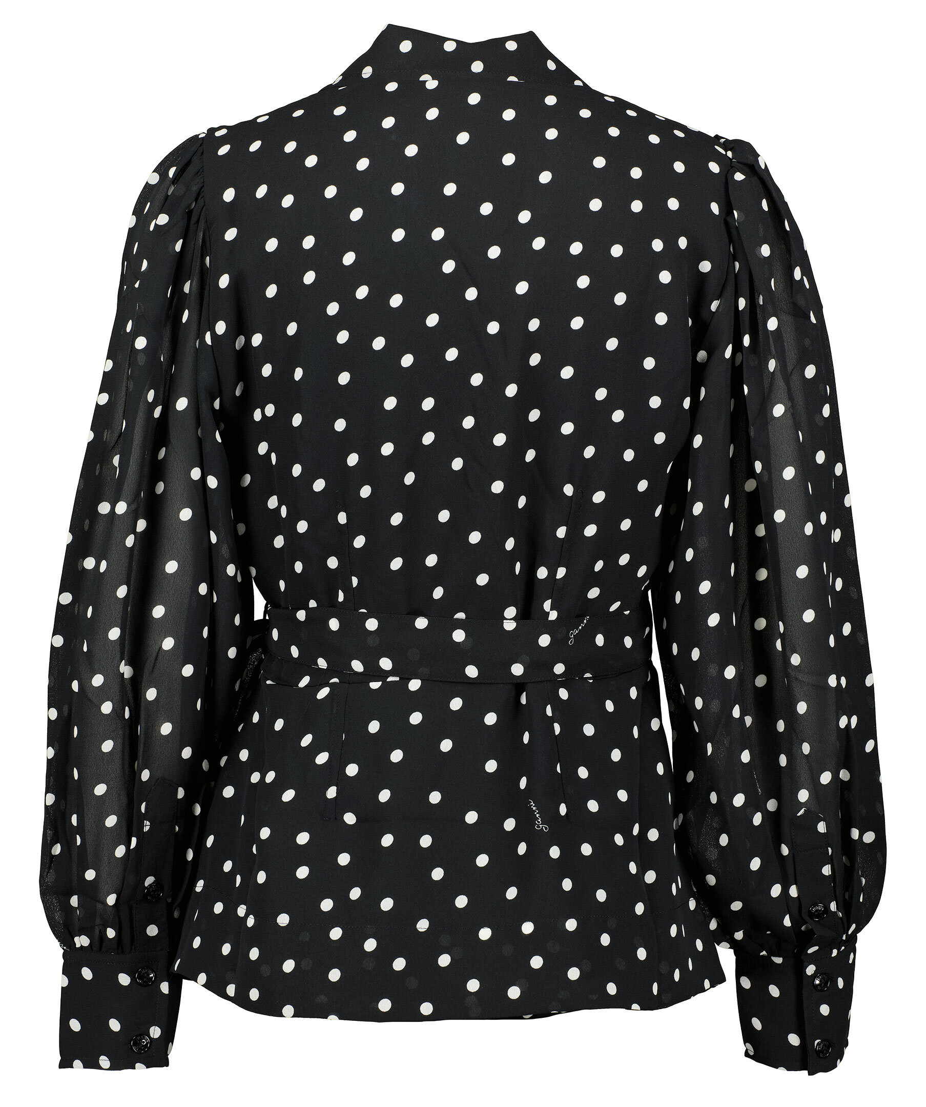 Svart och vit prickig blus från Ganni. Designad i omlott modell Puffärmar med manschetter nedtill vid ärmslut. Karge med slag.
