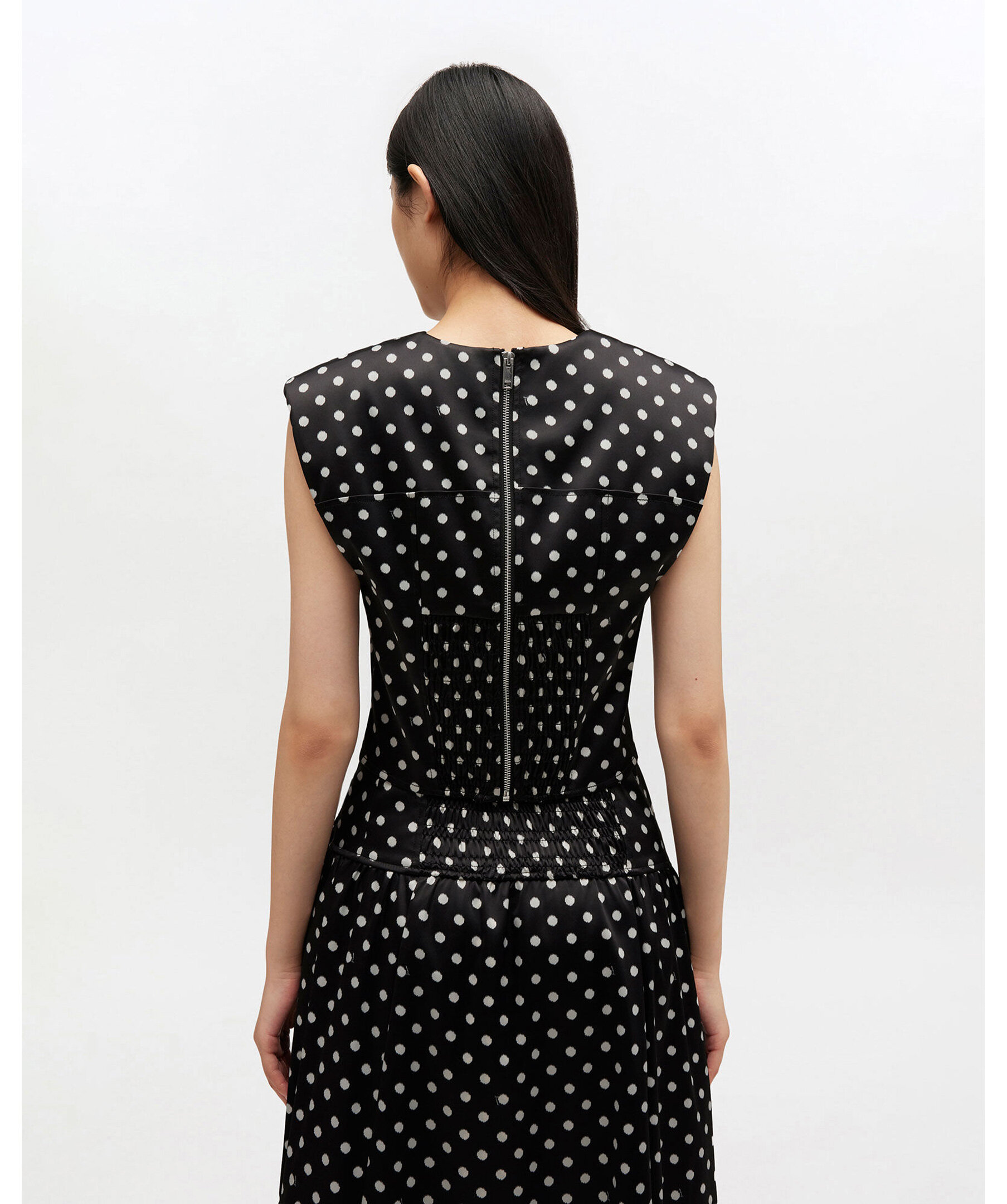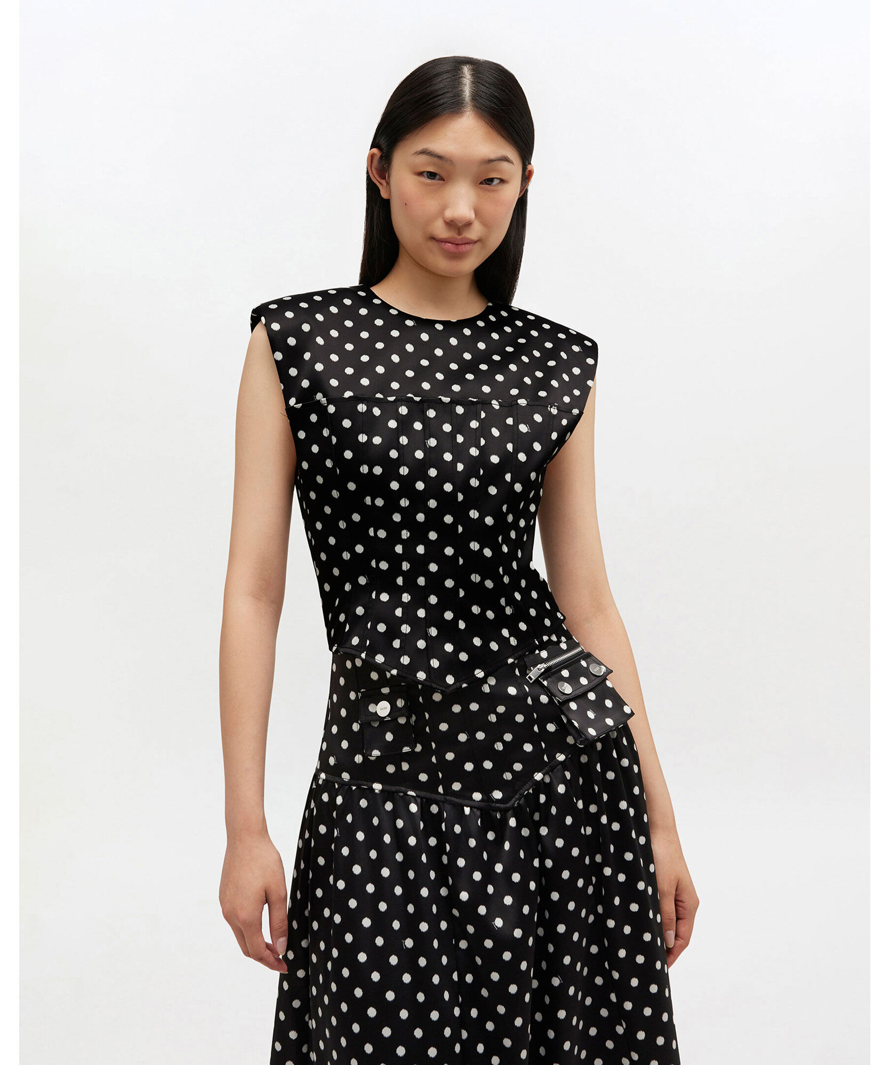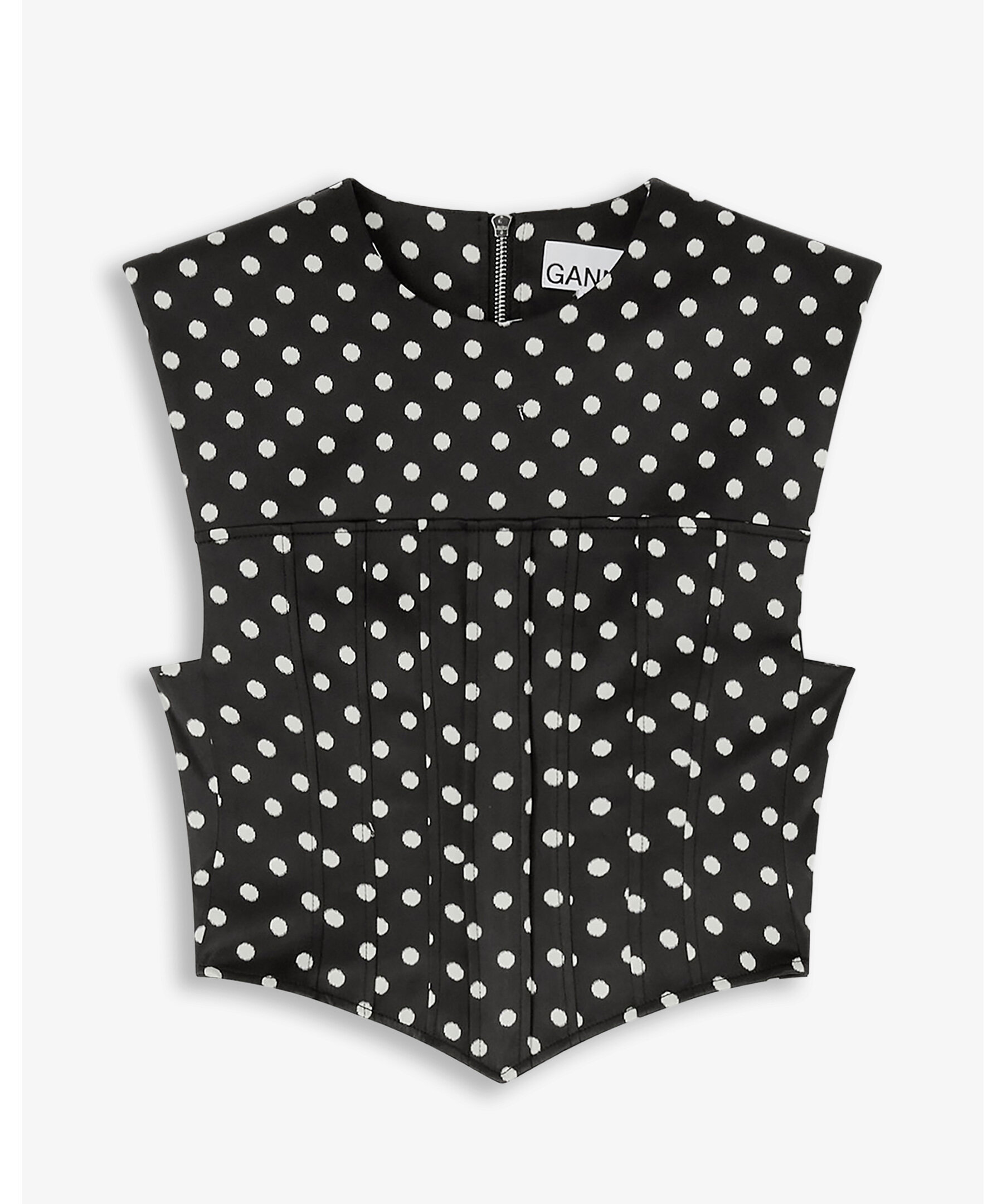 Svart polkaprickig korsett‑topp i satin från GANNI. Toppen har en rund halsringning och är ärmlös med en smickrande, figurnära silhuett inspirerad av klassisk korsettform. Den har en dold dragkedja framtill och ett elastiskt bakpanel som ger en bekväm, flexibel passform. Perfekt att styla till både festliga tillfällen och trendiga vardagsoutfits där du vill lyfta fram midjan och skapa en sofistikerad look med playfull edge.