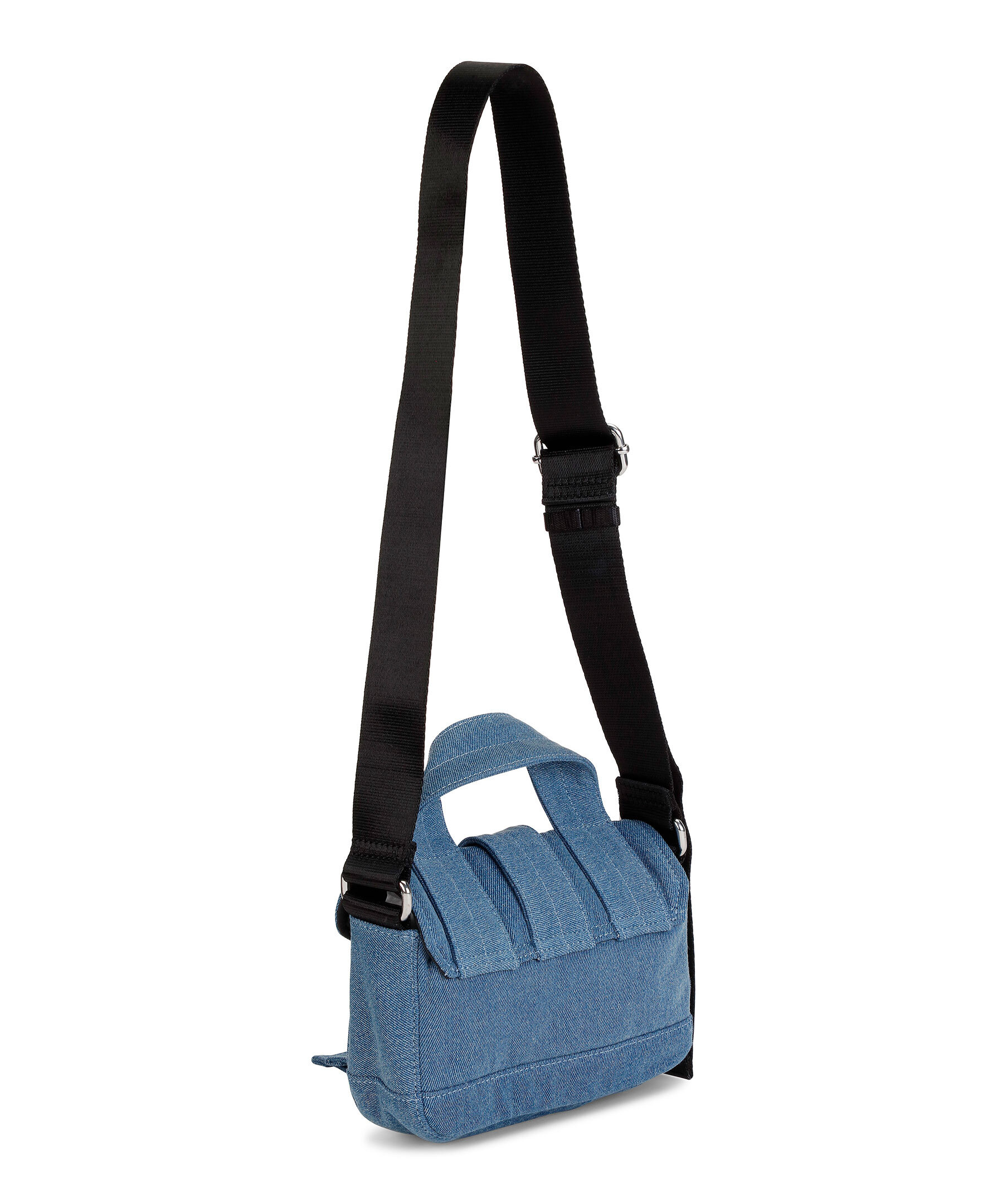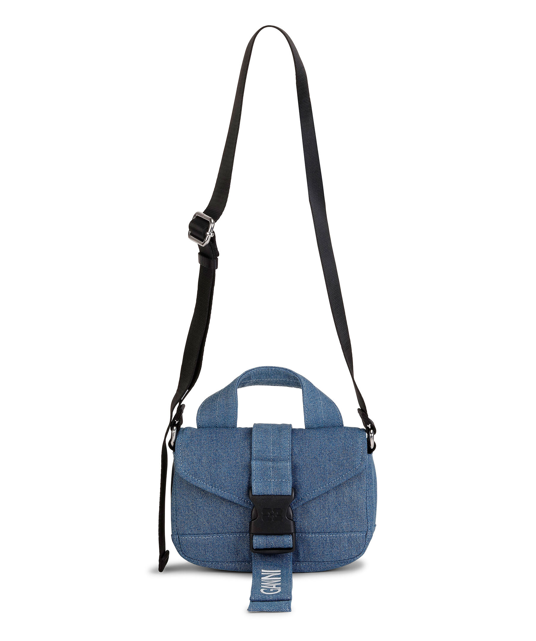 Miniväska från Ganni i denimmaterial. Denna Recycled Denim Mini Satchel väska är tillverkad av bomull med ett polyesterfoder. Väskan har ett topphandtag, en framklaff med GANNI Butterfly-spänne, en justerbar axel-/crossbodyrem och banddetaljer med GANNI-logotyp.