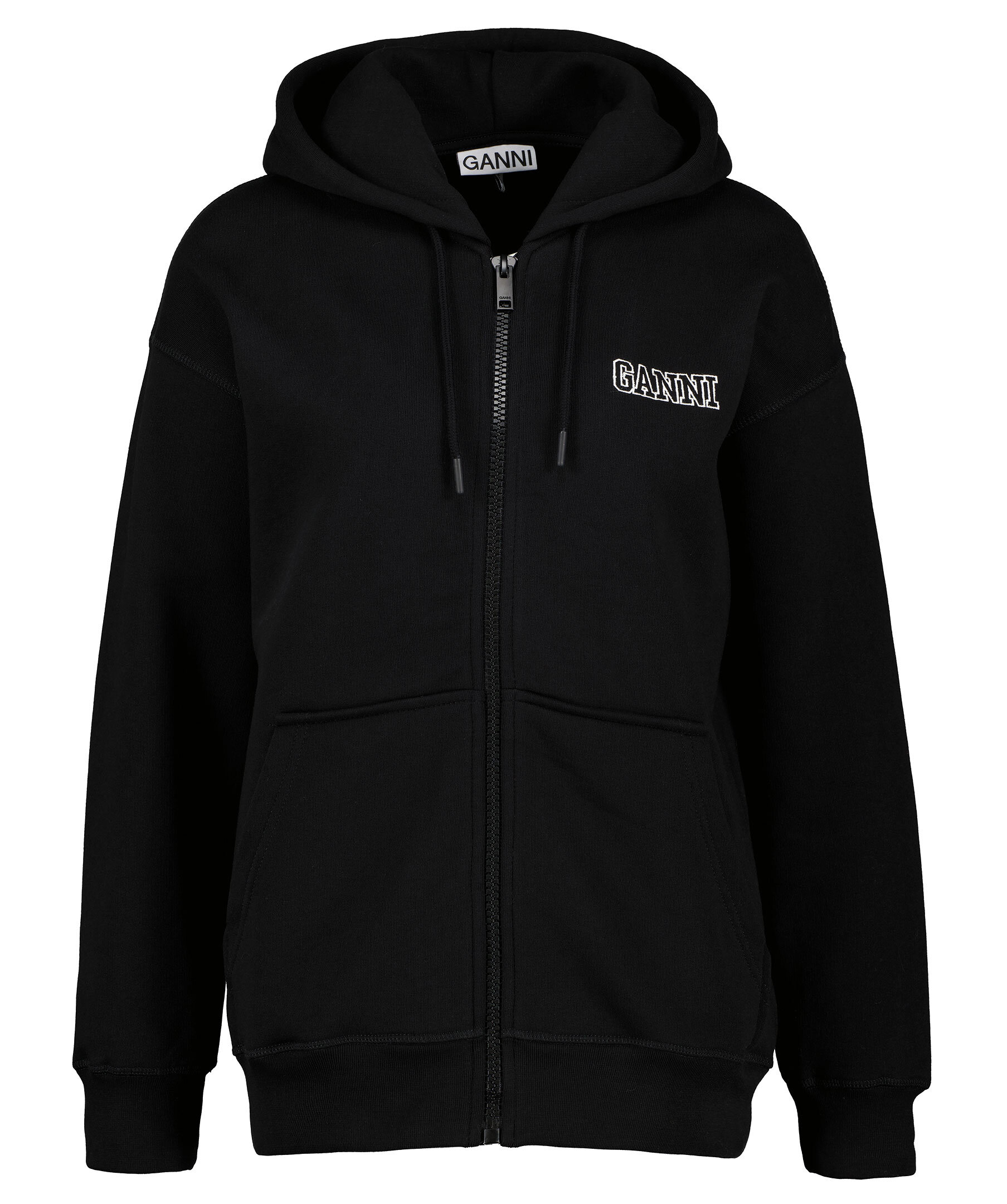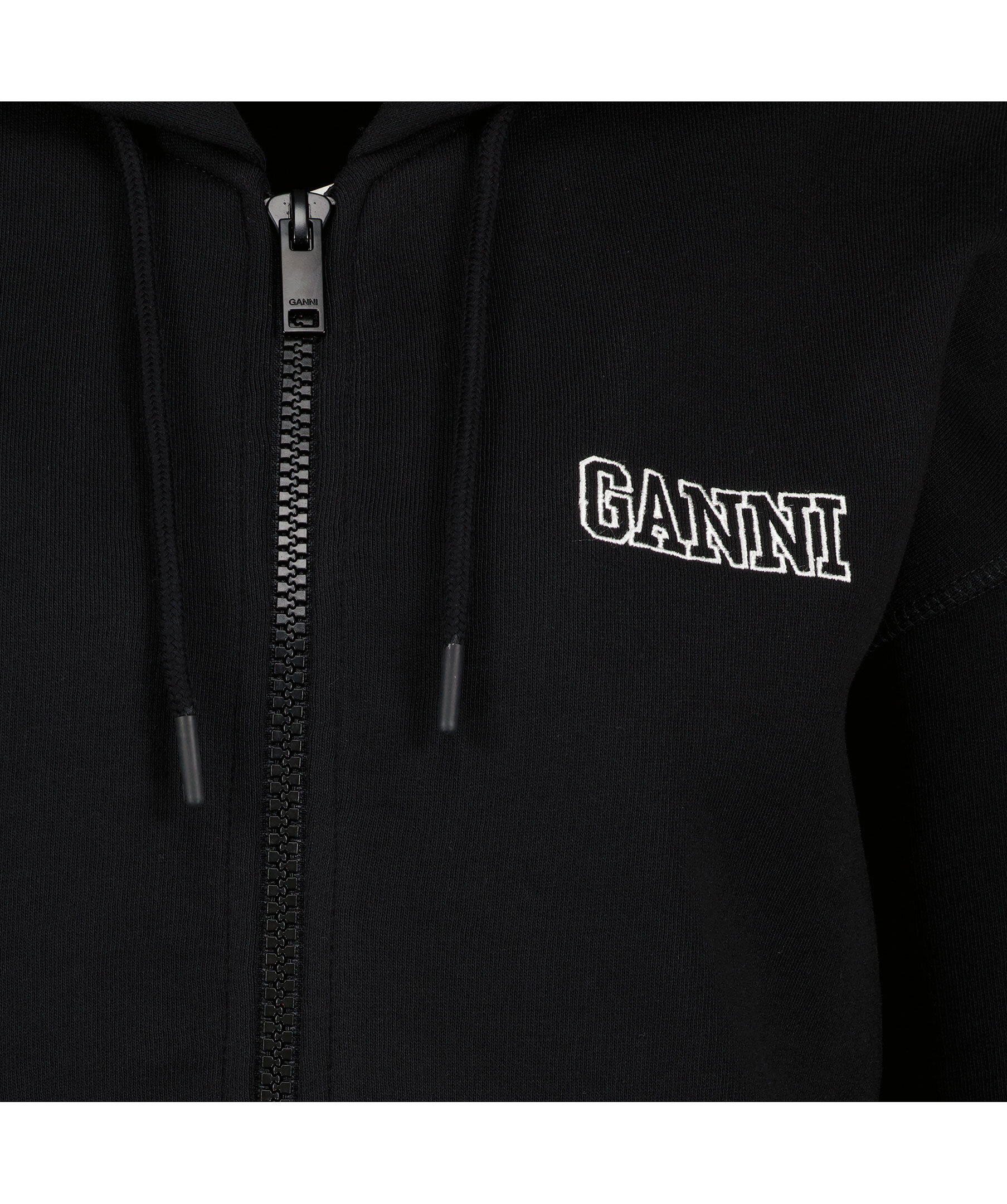 Svart Hoodie från Ganni. Stängs framtill med dragkedja. Luva med dragsko. Broderad logotyp på vänster bröst. Ficka på magen. Ribbstickade muddar vid ärm- och plaggslut. Tillverkad i bommullsblandning.