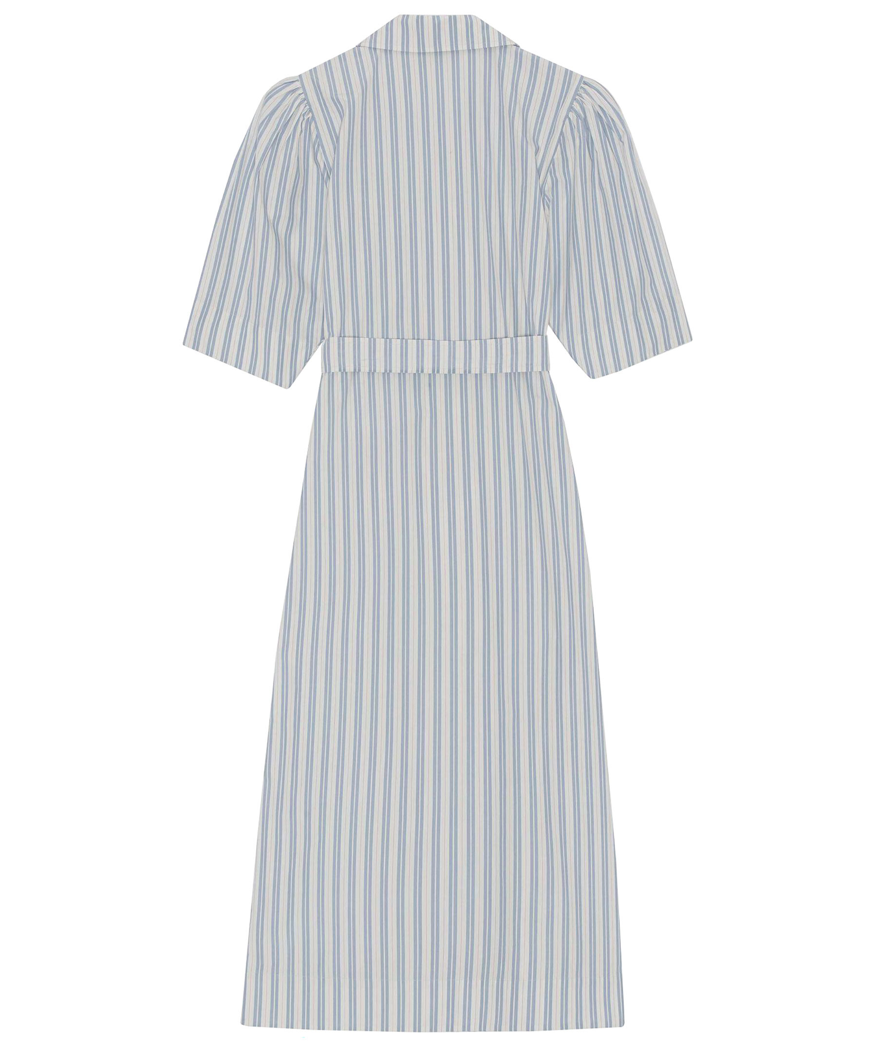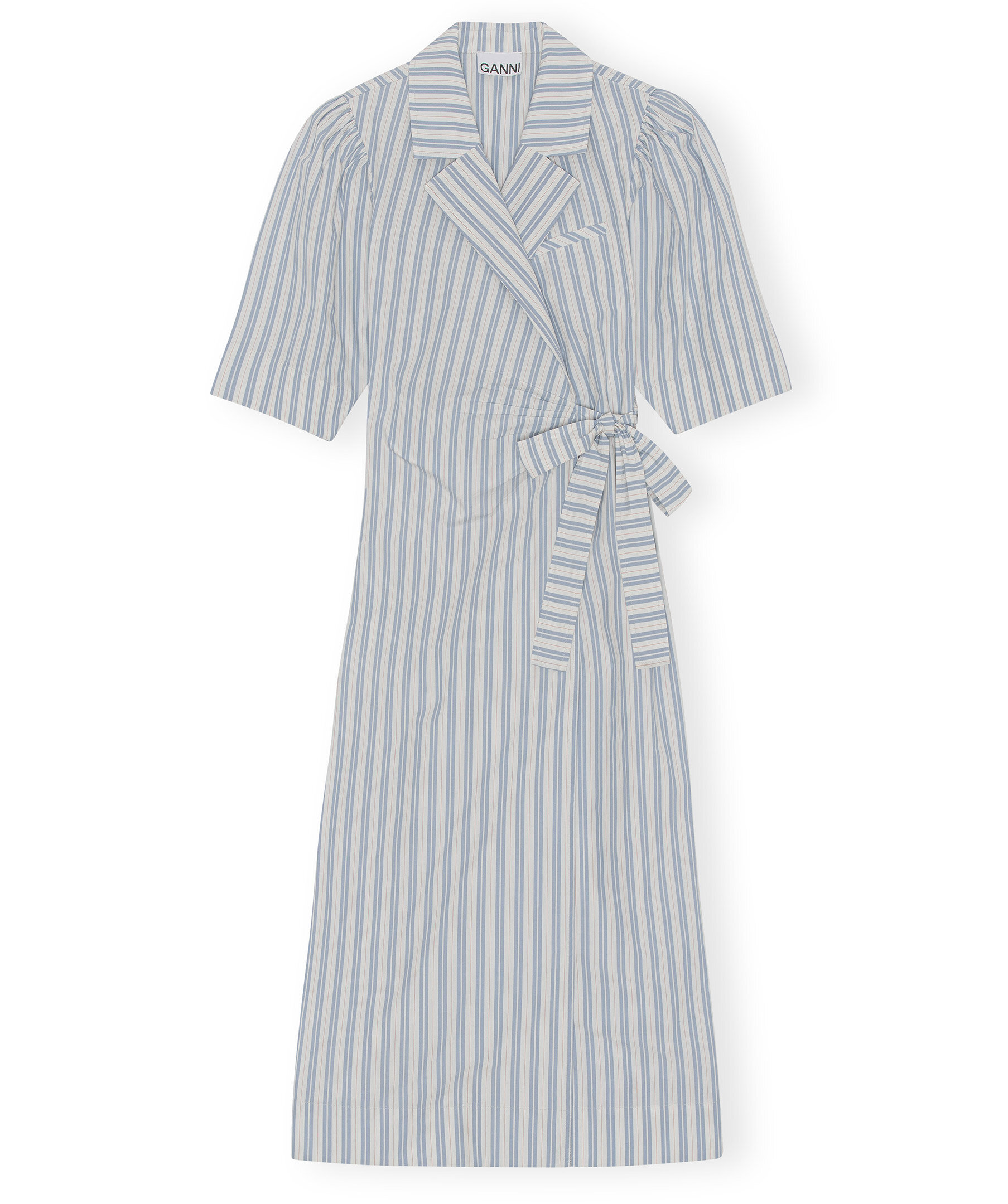 Randig midiklänning i skjortmodell från Ganni. Tillverkad i bomull och har ett mönster av vita och ljusblå ränder samt tunna röda sträck. Revolverkrage, midjeband med knytning för en justerbar passform, bröstficka, samlade axlar och breda avsmalnande armbågslånga ärmar. Skuren för en omlottsilhuett med anpassad passform i axel och byst med en något avsmalnande kjol.