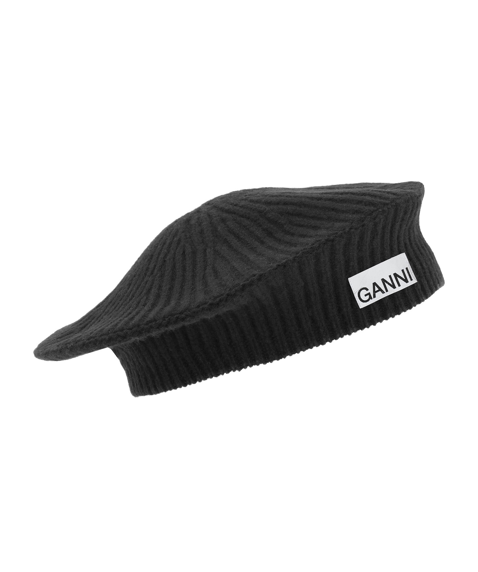 Svart ribbstickad basker från GANNI. Vit patch med logotyp. Tillverkad i ullmix.