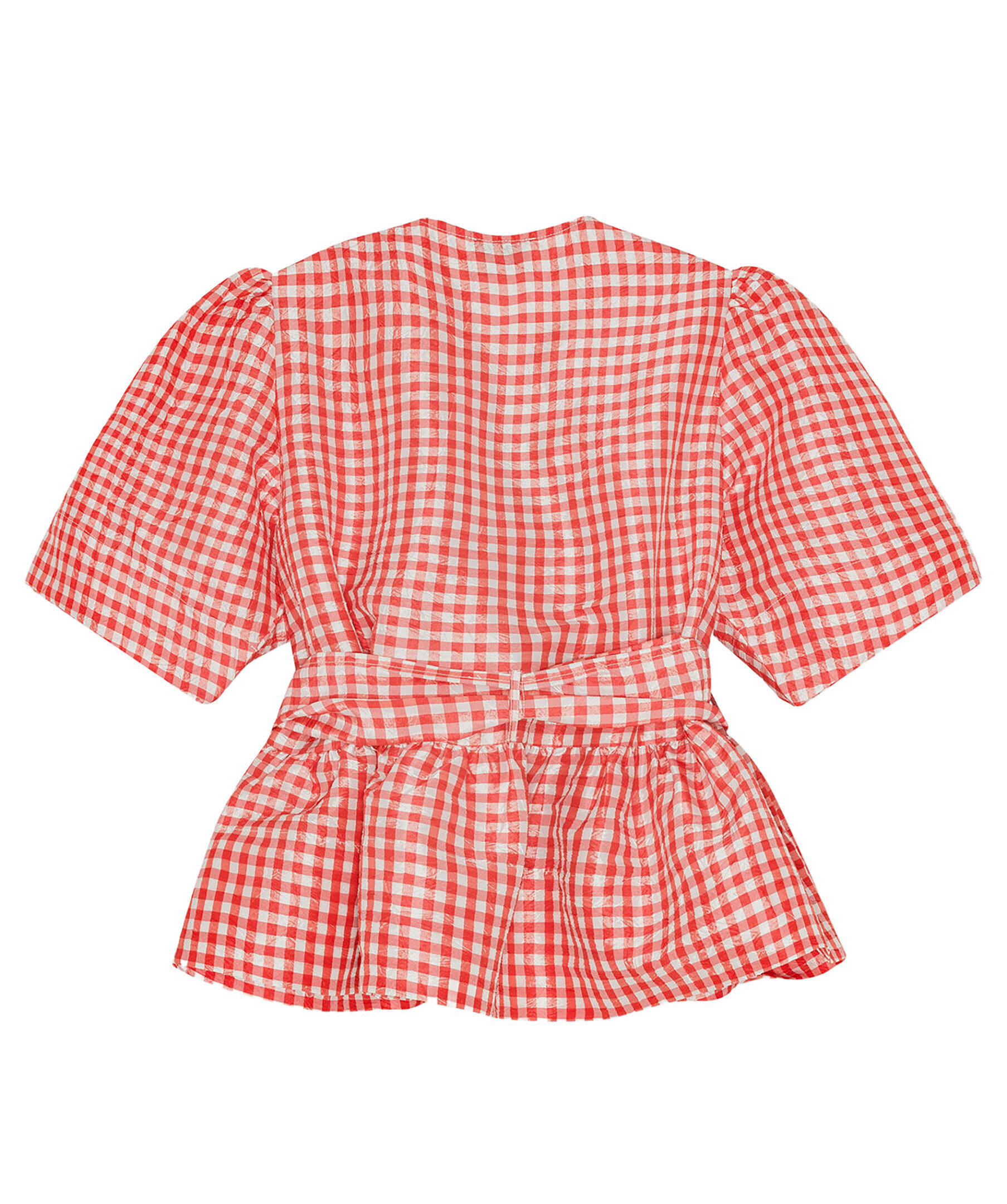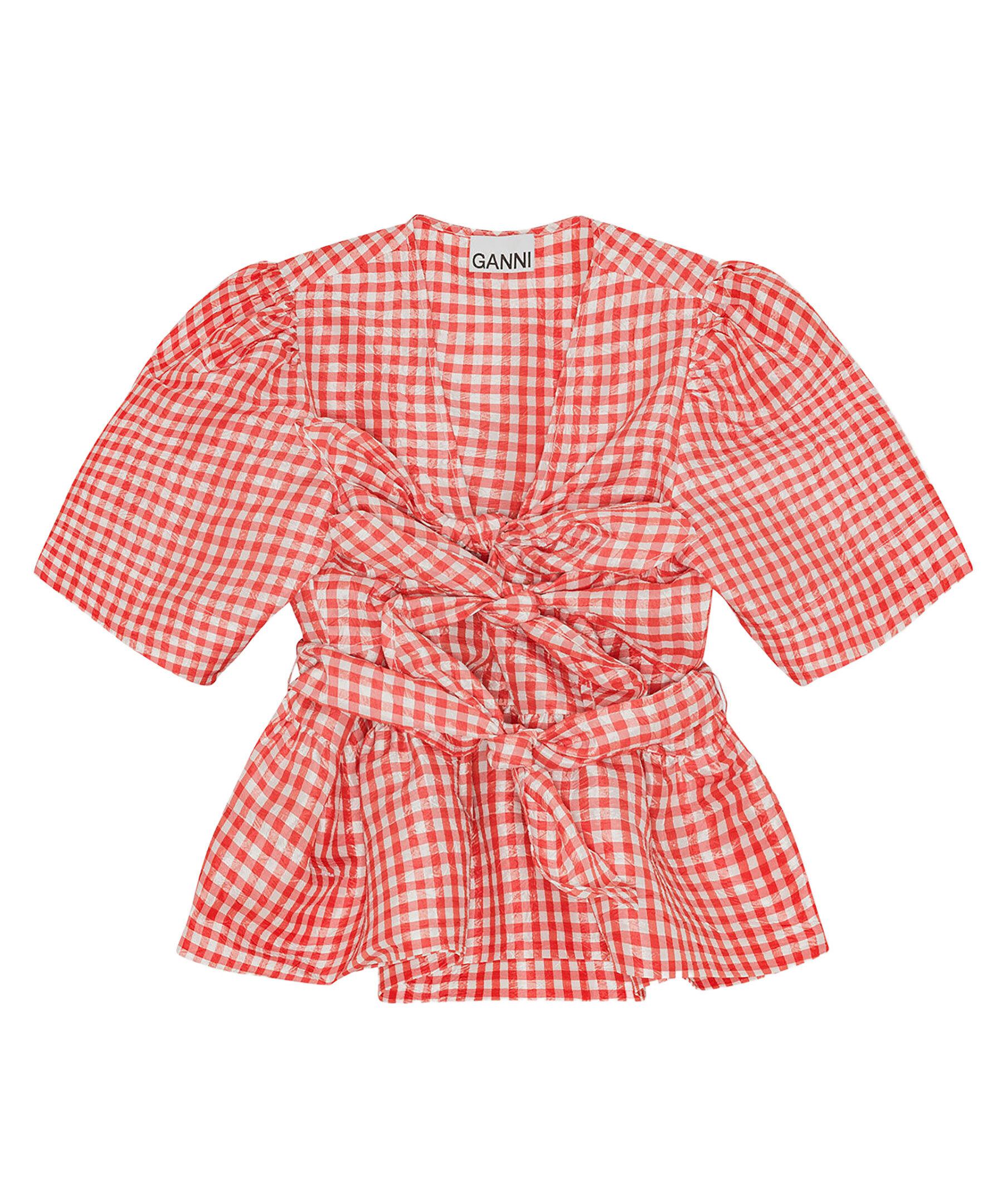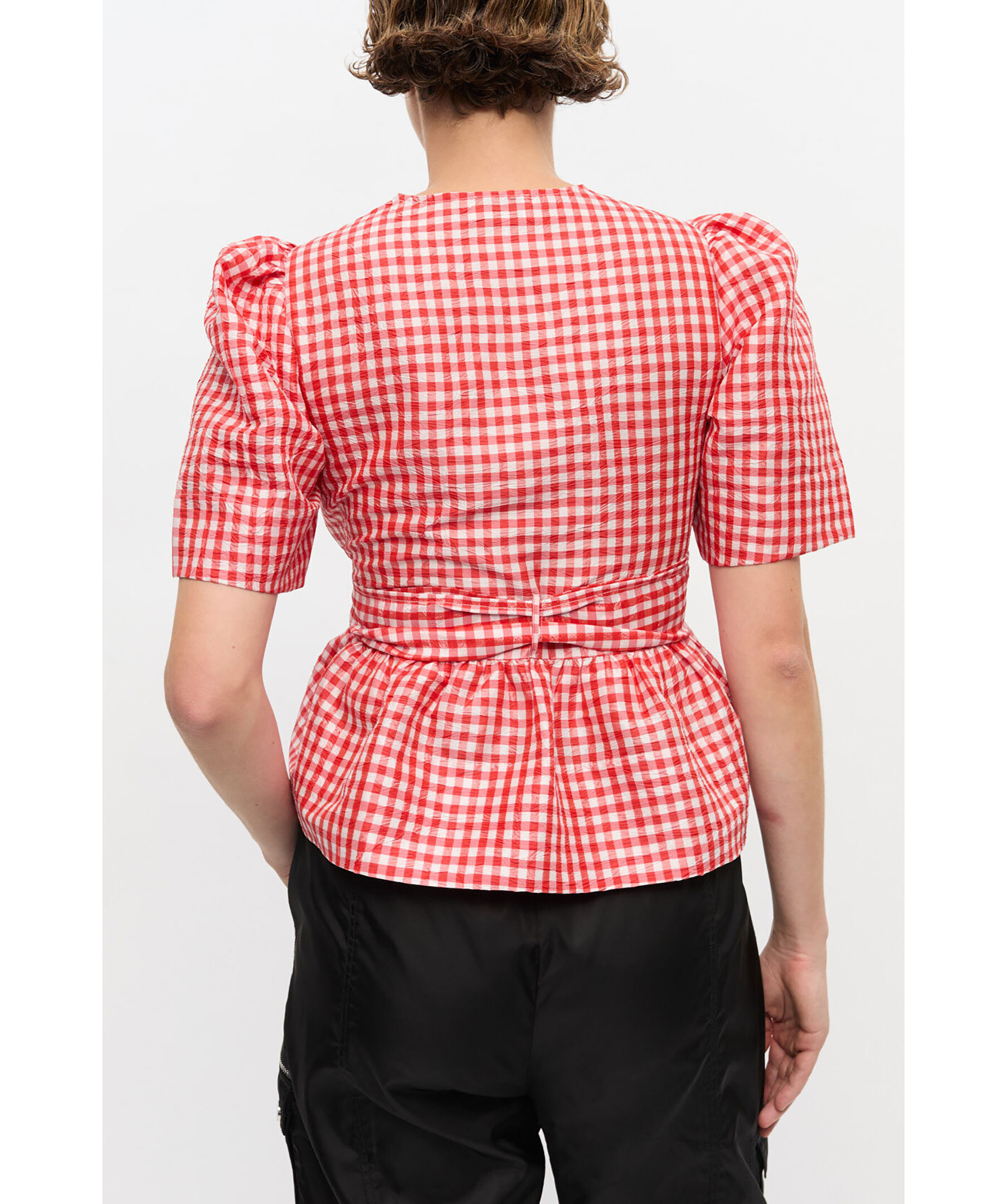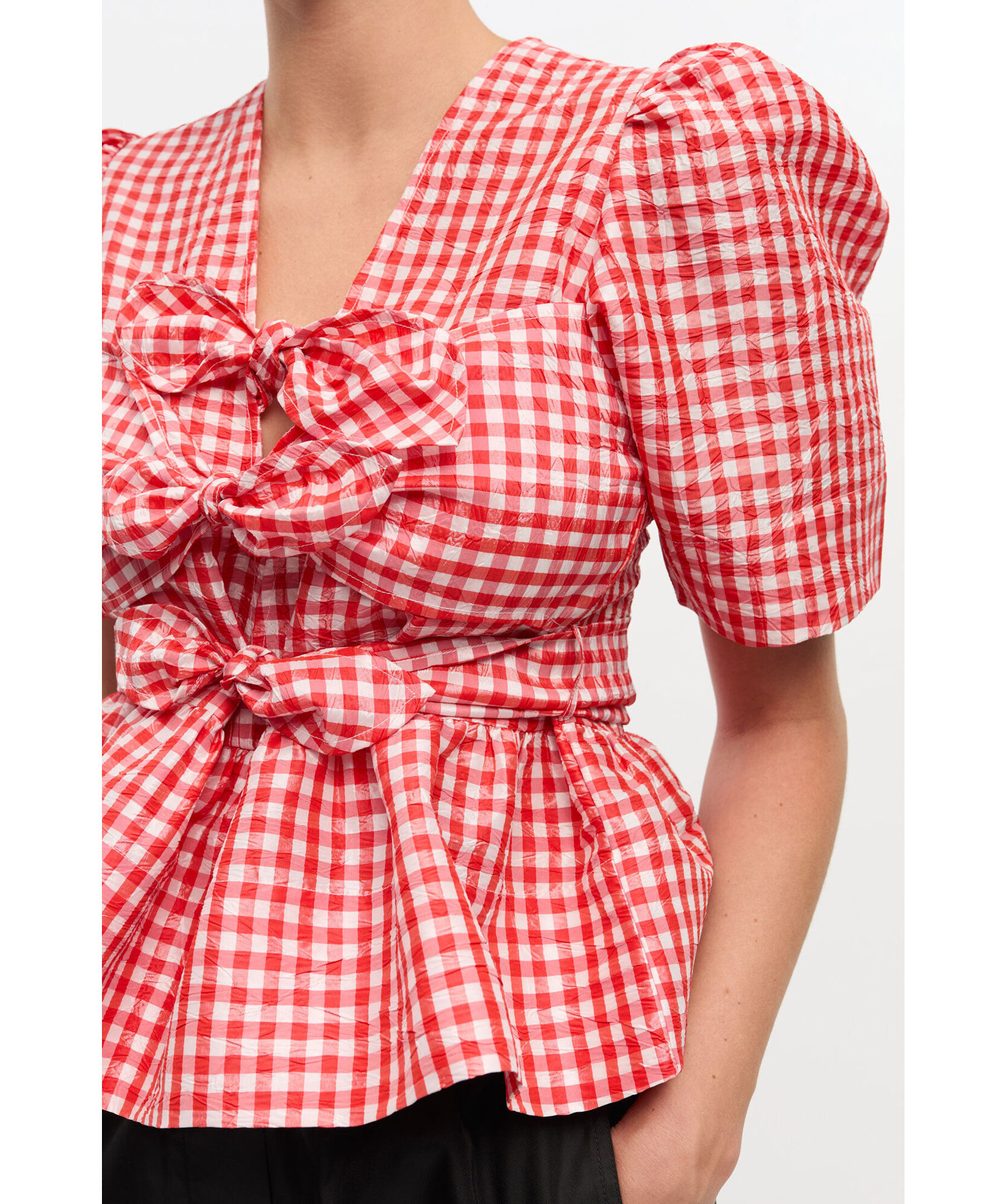 Blus i ett röd- och vitrutigt taftmaterial med skrynkeleffekt från Ganni. Blusen har korta, puffiga ärmar samt knytning framtill. Tillverkad i polyester med bomullsfoder.