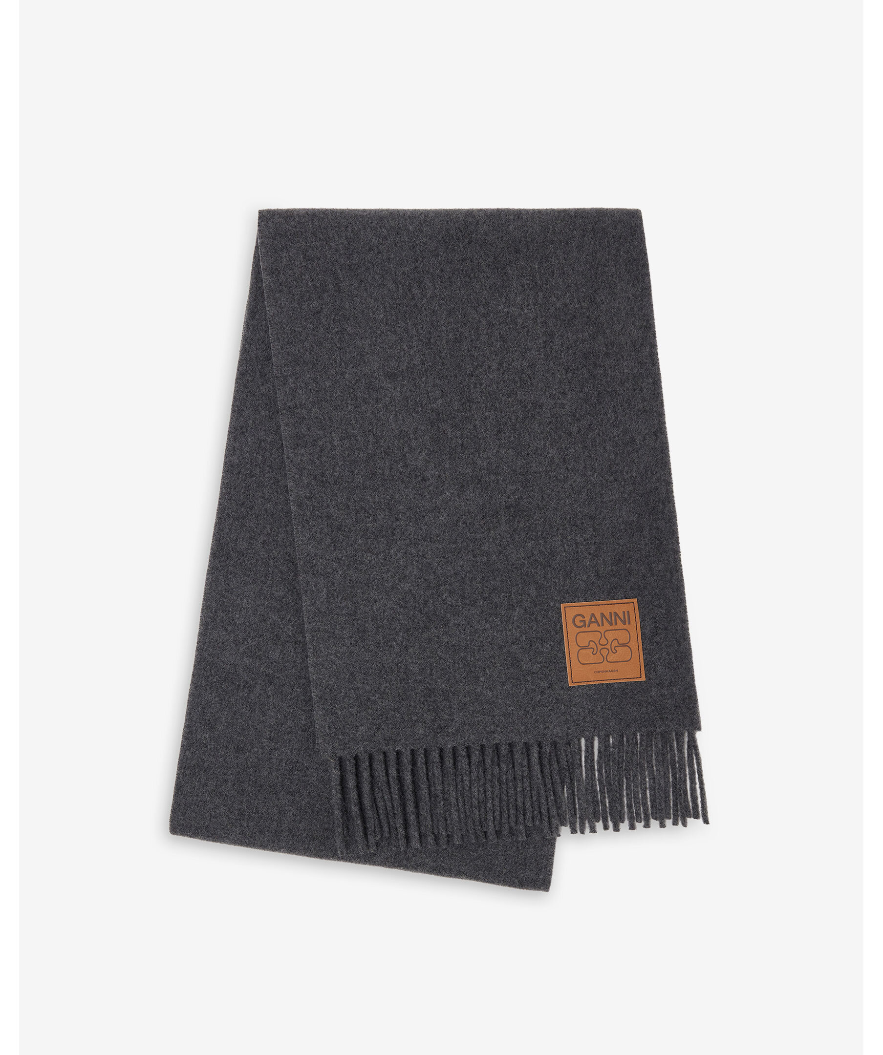 GANNI grå ullhalsduk i färgen Paloma Melange. Tillverkad i 100 % ull med fransade kanter och en lapp med GANNI-logotyp.