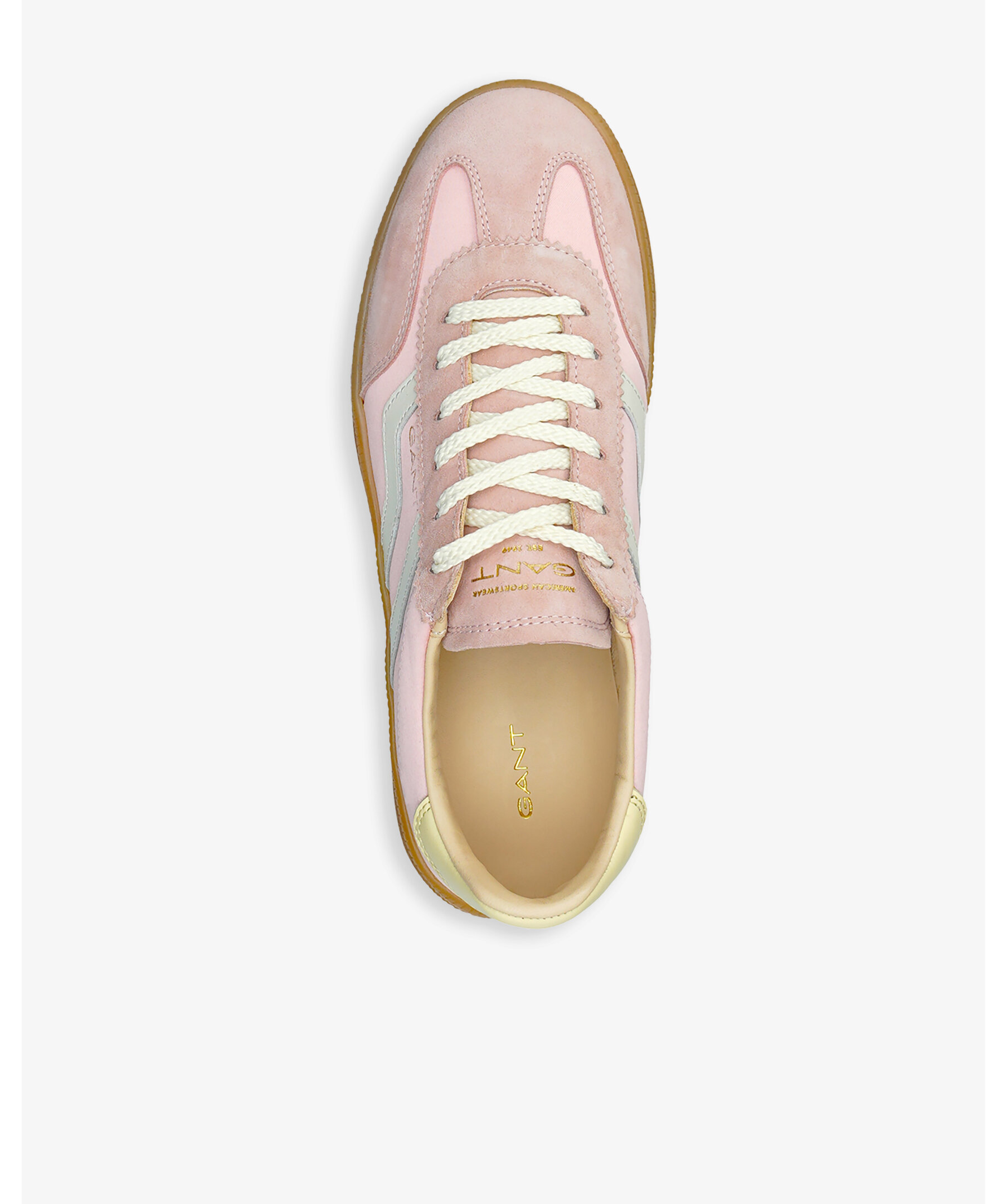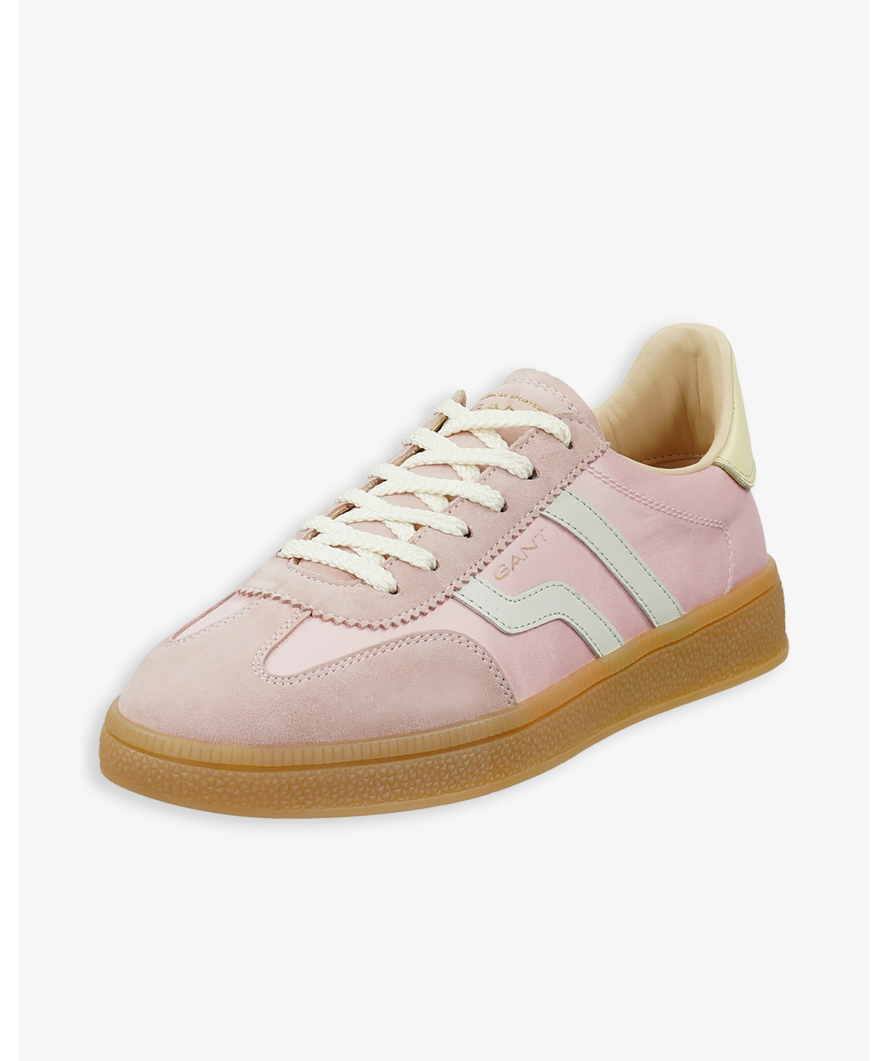 Elegant och retroinspirerad sneaker från Gant Footwear med slimmad silhuett och vintagekänsla. Ovandelen är en mix av mocka, nylon och satin, och med läderfoder samt läderklädd innersula för bekväm passform. De ikoniska honungsfärgade gummisulorna ger skon dess unika karaktär, kompletterad med diskret logotyp på sidan.