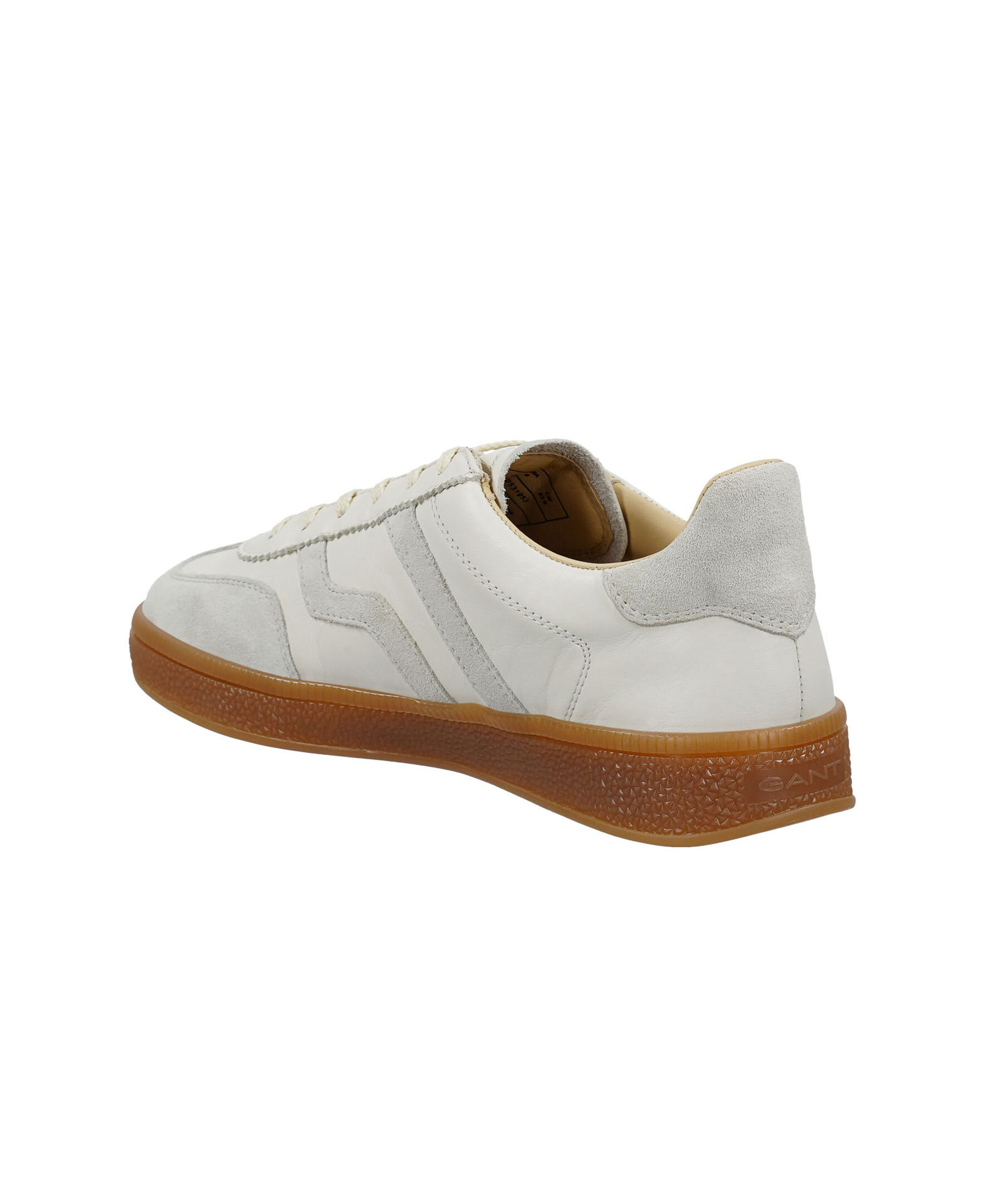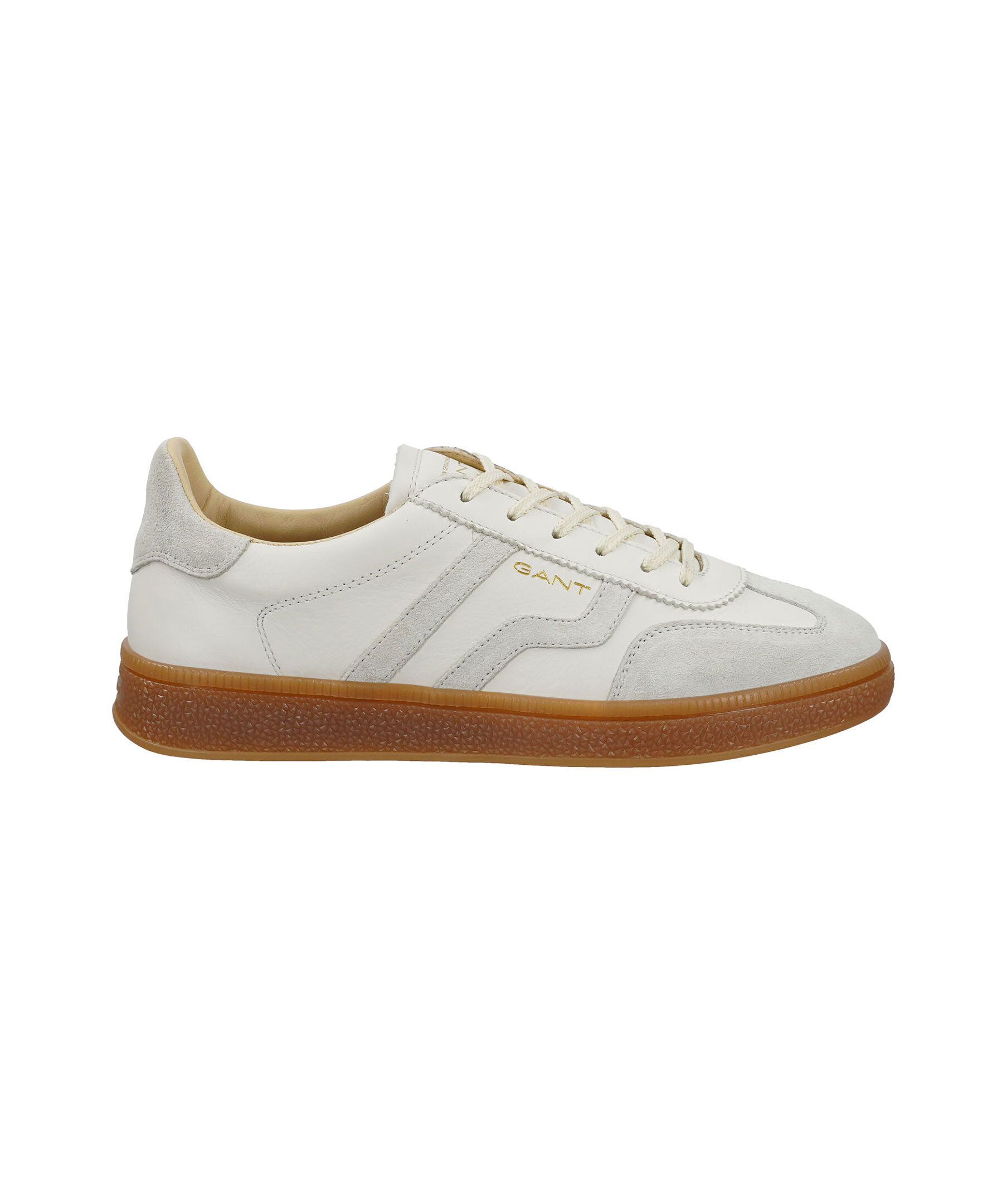 Vita sneakers från Gant Footwear. Dessa retroinspirerade skor har beiga detaljer i mocka, diskret guldfärgad logotyp på utsidan av skon, samt på plösen. Färg i färg logotyp på skosulan baktill. Tillverkad av läder/mocka.