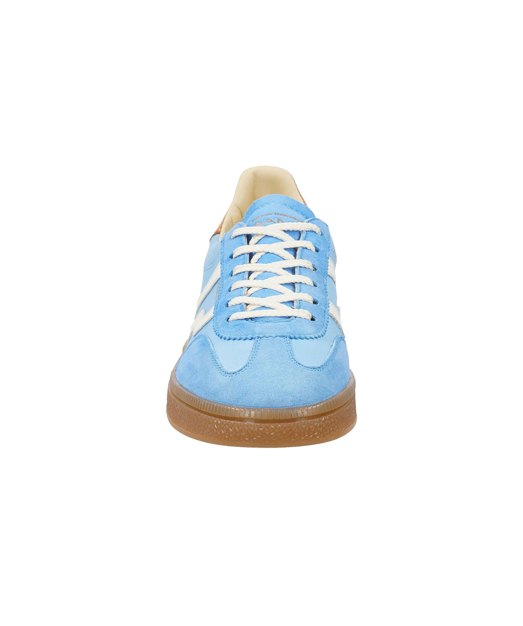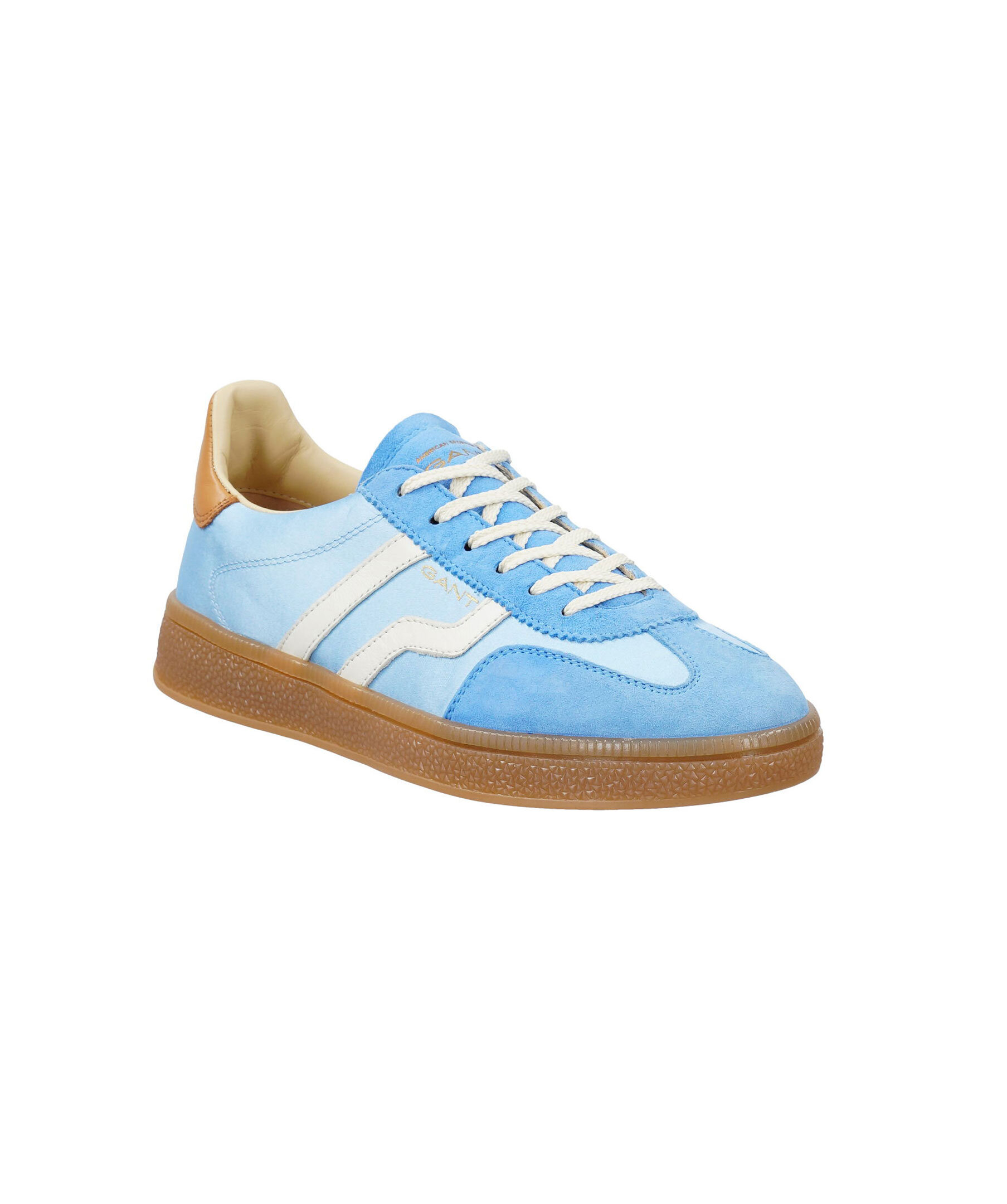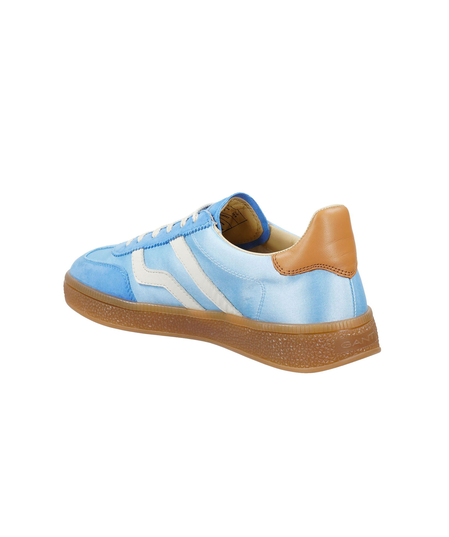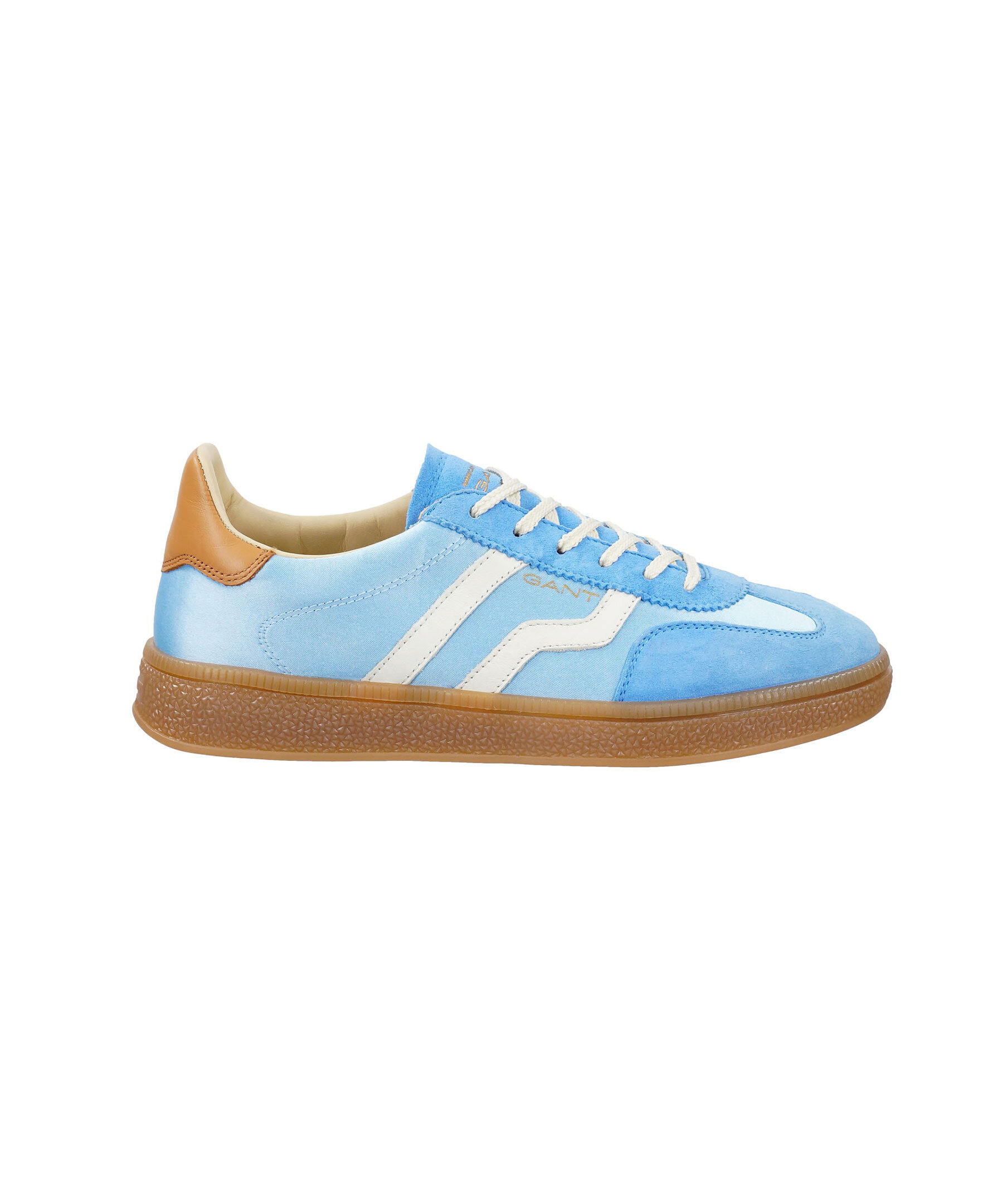 Ljusblåa färgade sneakers från Gant. Dessa retroinspirerade skor har mörkare detaljer i mocka, diskret guldfärgad logotyp på utsidan av skon. Färg i färg logotyp på skosulan baktill. Beige läderdetalj på hälen. Denna modell har detaljer i glansigt satin. Tillverkad av läder/mocka.
