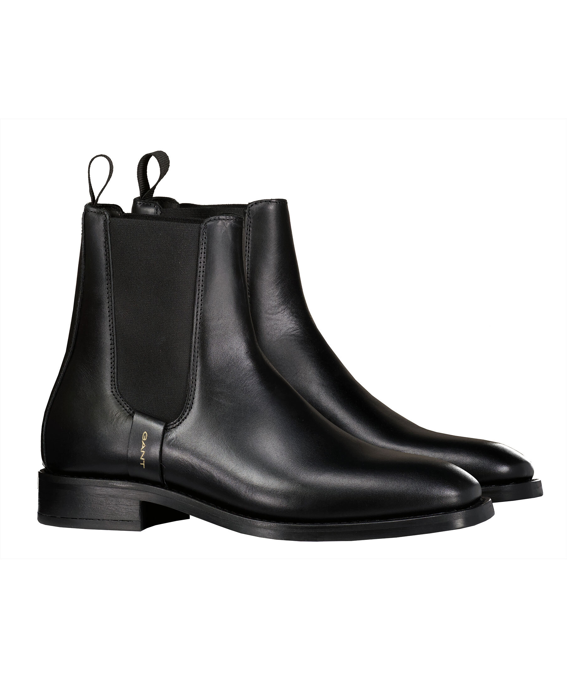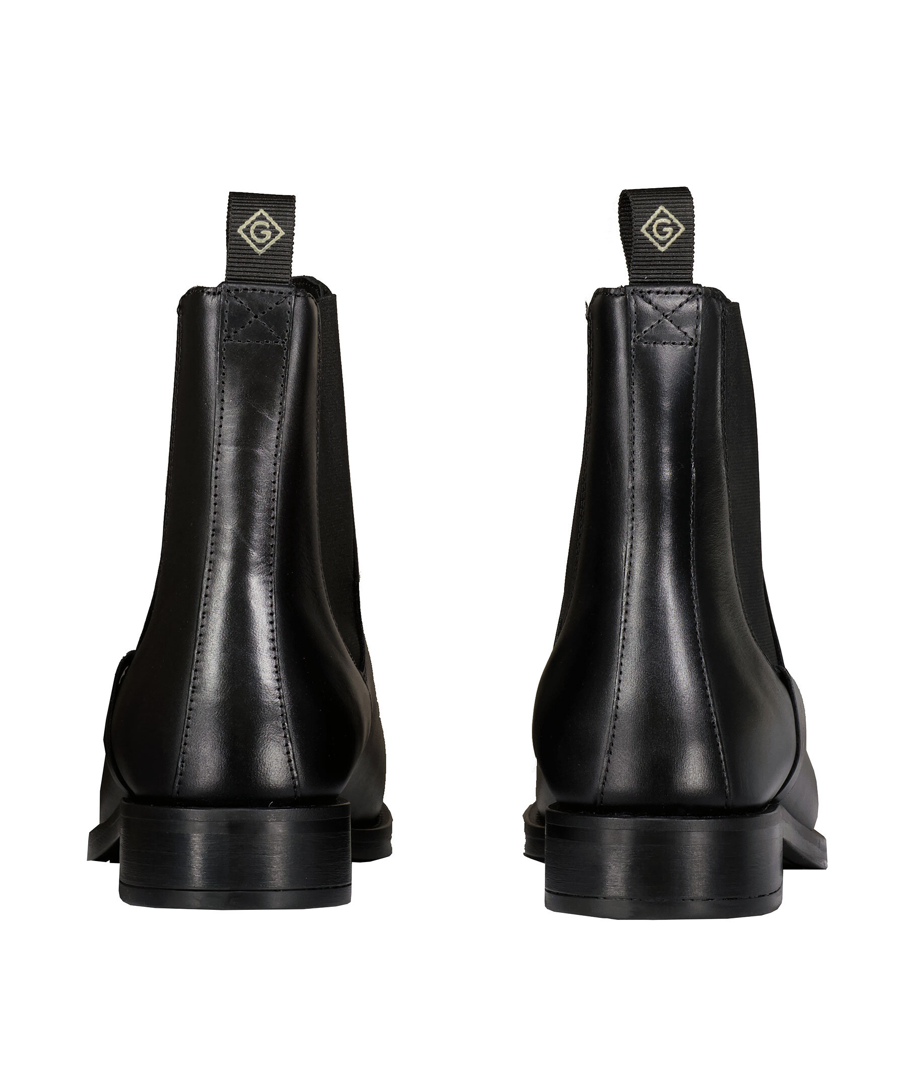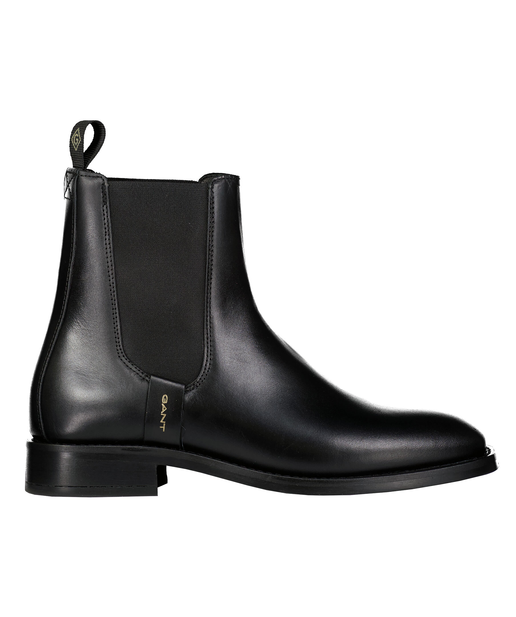 Chelsea Boots i svart läder från GANT. Resår på sidorna, 3cm hög klack, 15,5cm högt skaft. Logotyp på skons ena sida samt ett gummerat G på hälhällan. Innersula i läder.
