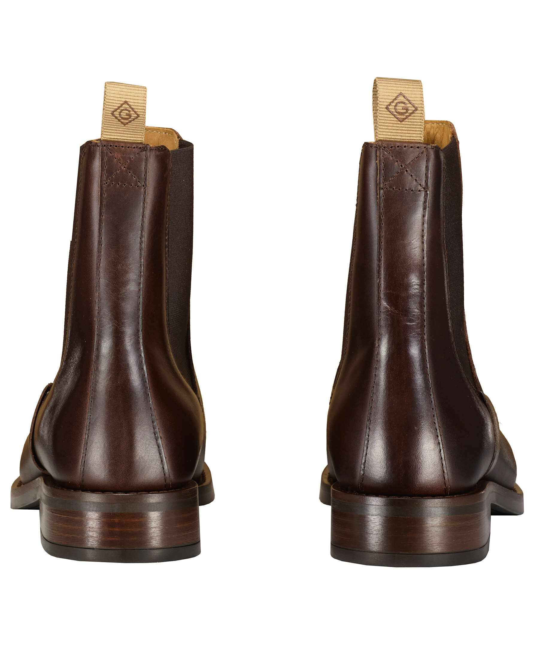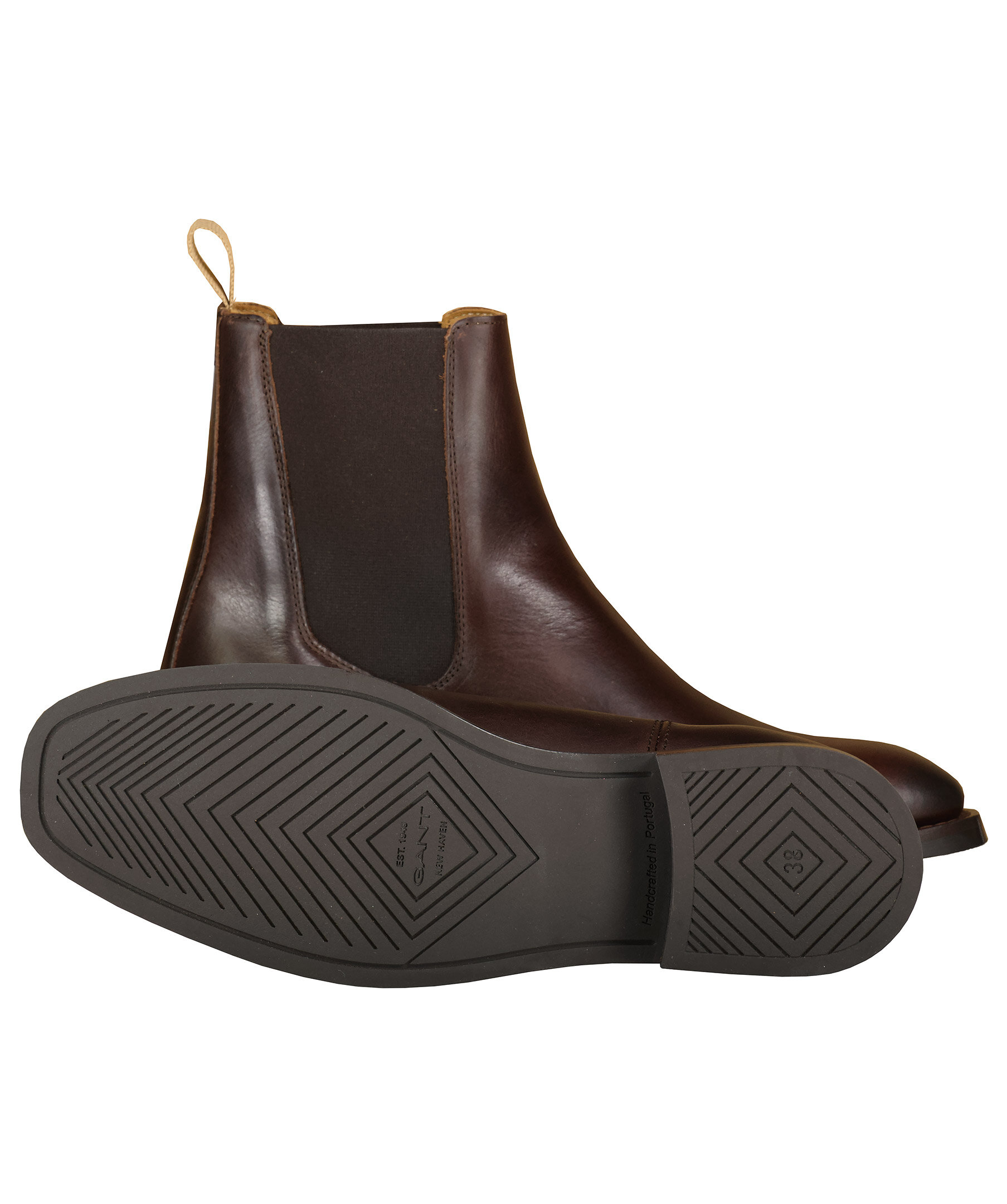 Chelsea Boots i brunt läder från GANT. Resår på sidorna, 3cm hög klack, 15,5cm högt skaft. Logotyp på skons ena sida samt ett gummerat G på hälhällan. Innersula i läder.