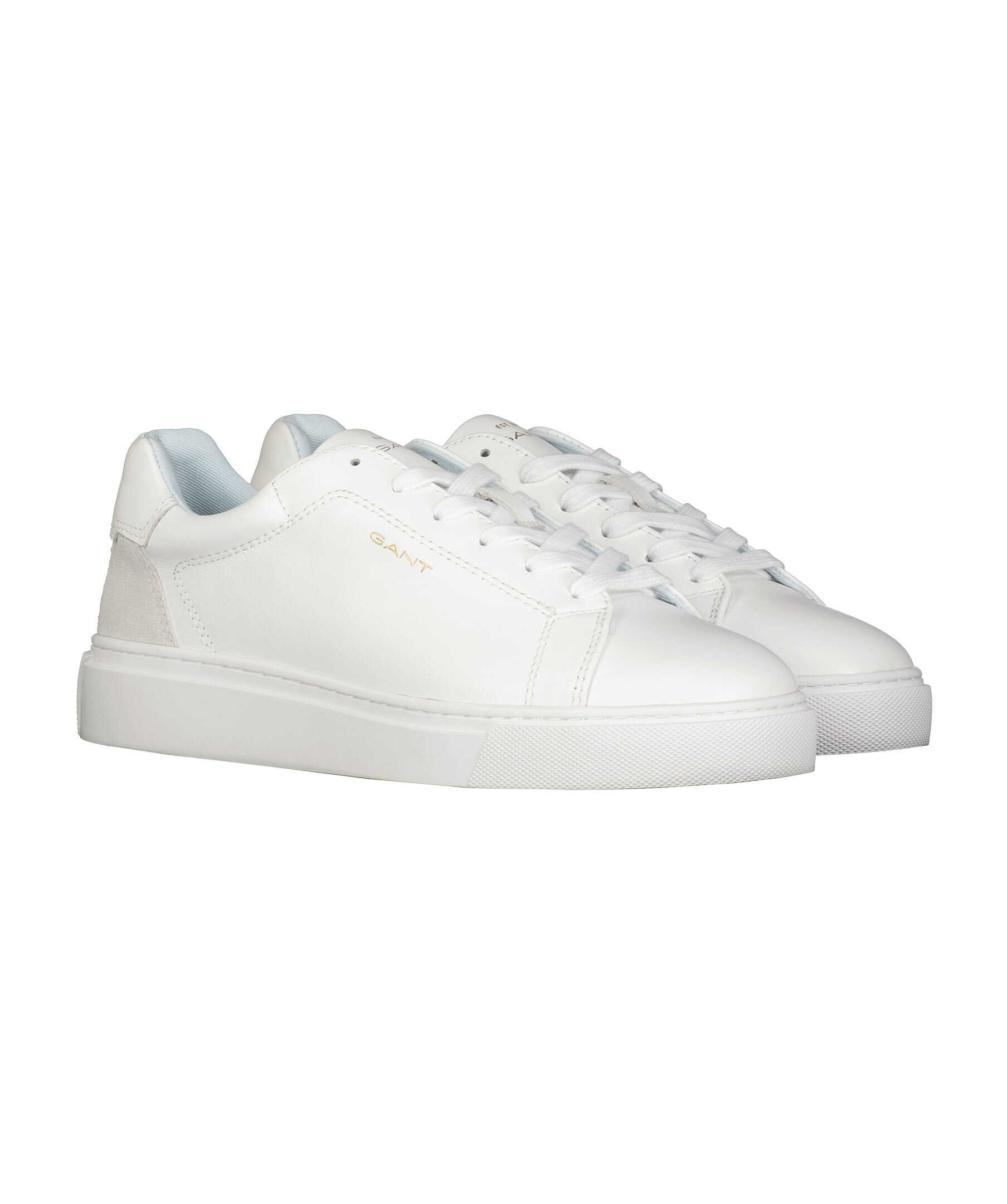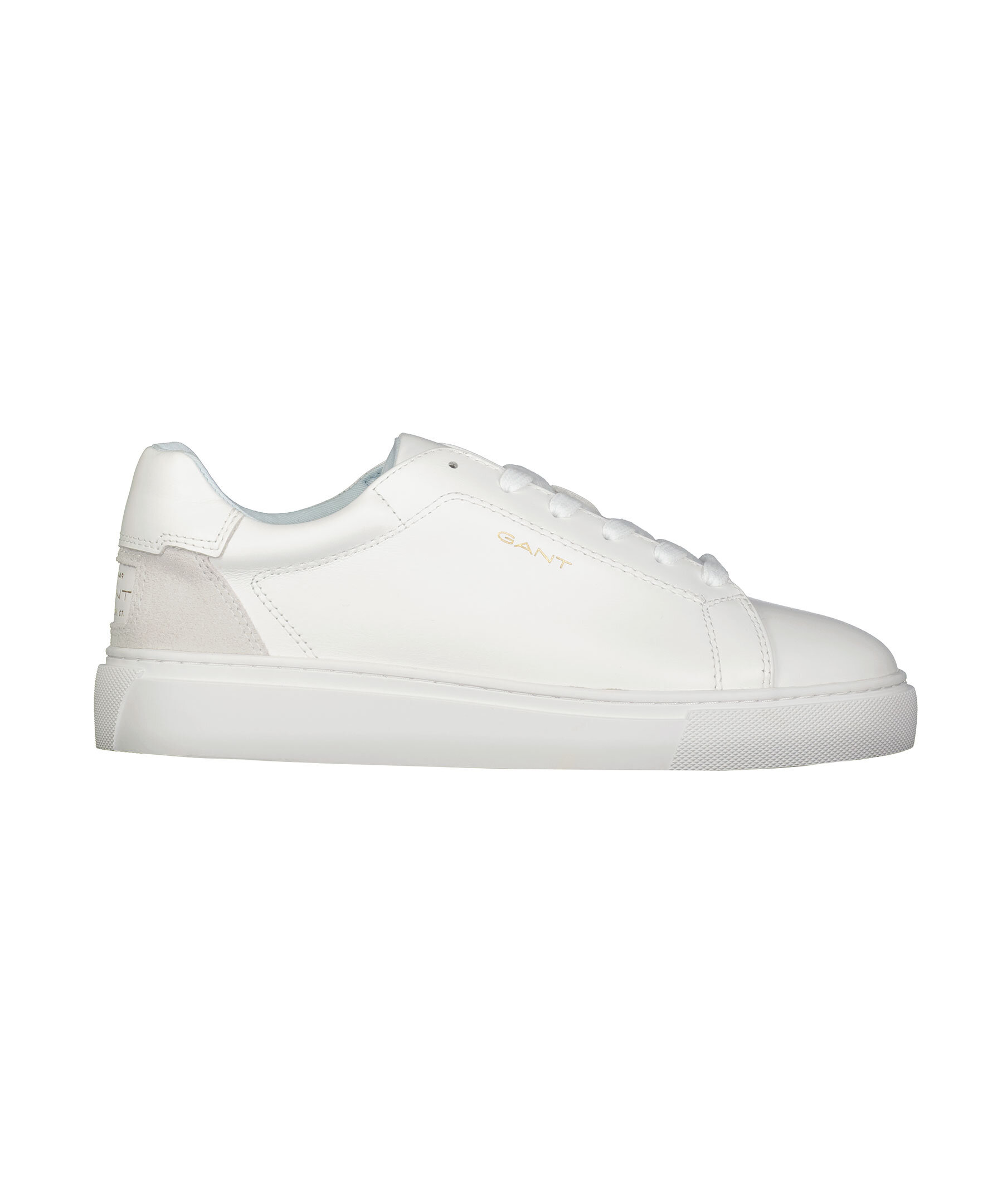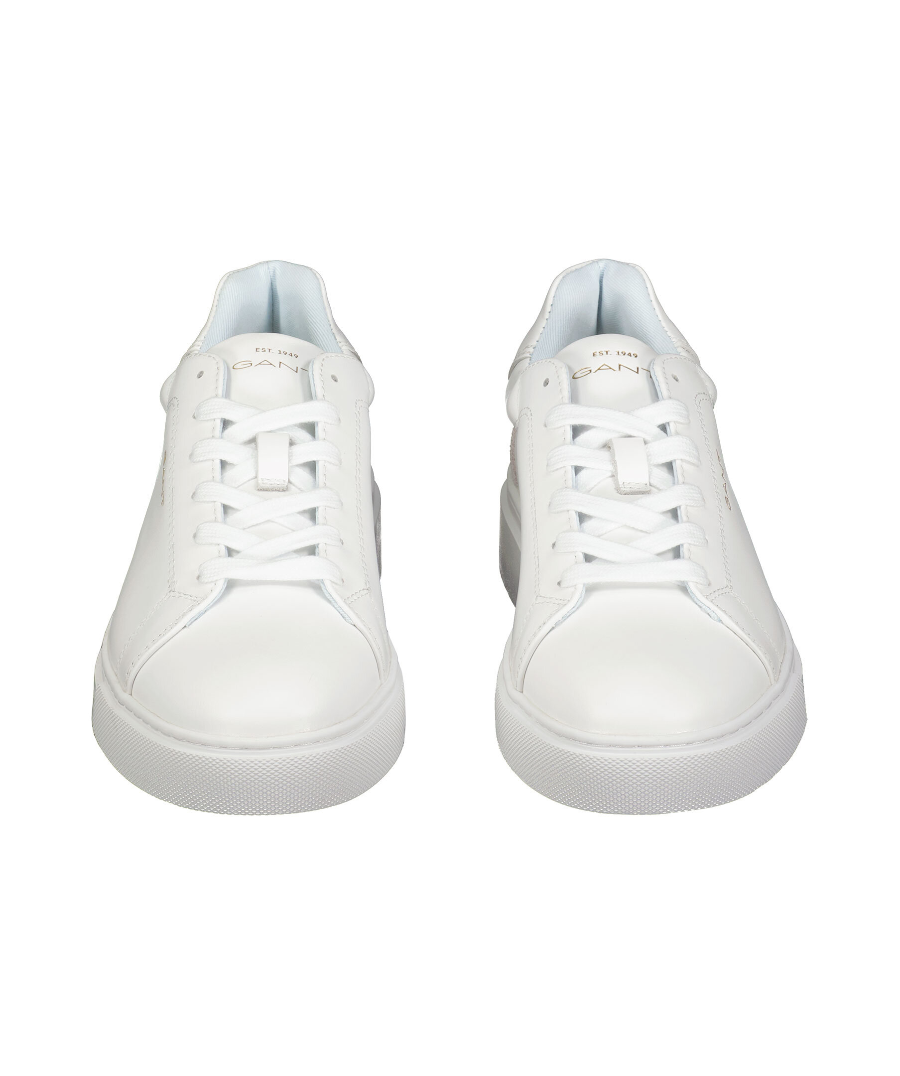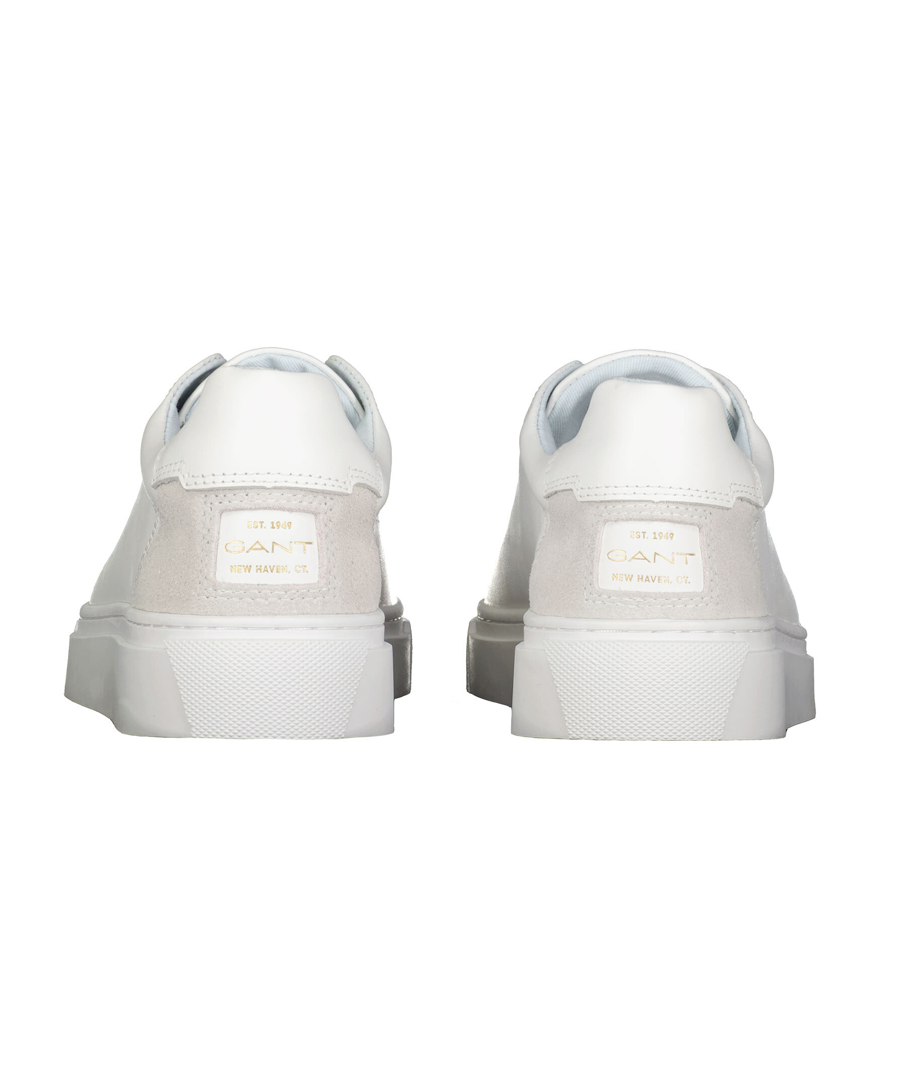 Vita sneakers i läder från Gant. Platta skosnören. Embossad guldfärgad logotyp på skons yttersida, plös samt på hälen. Grå detalj i mocka på hälen. Platta skosnören. Sula i gummi.