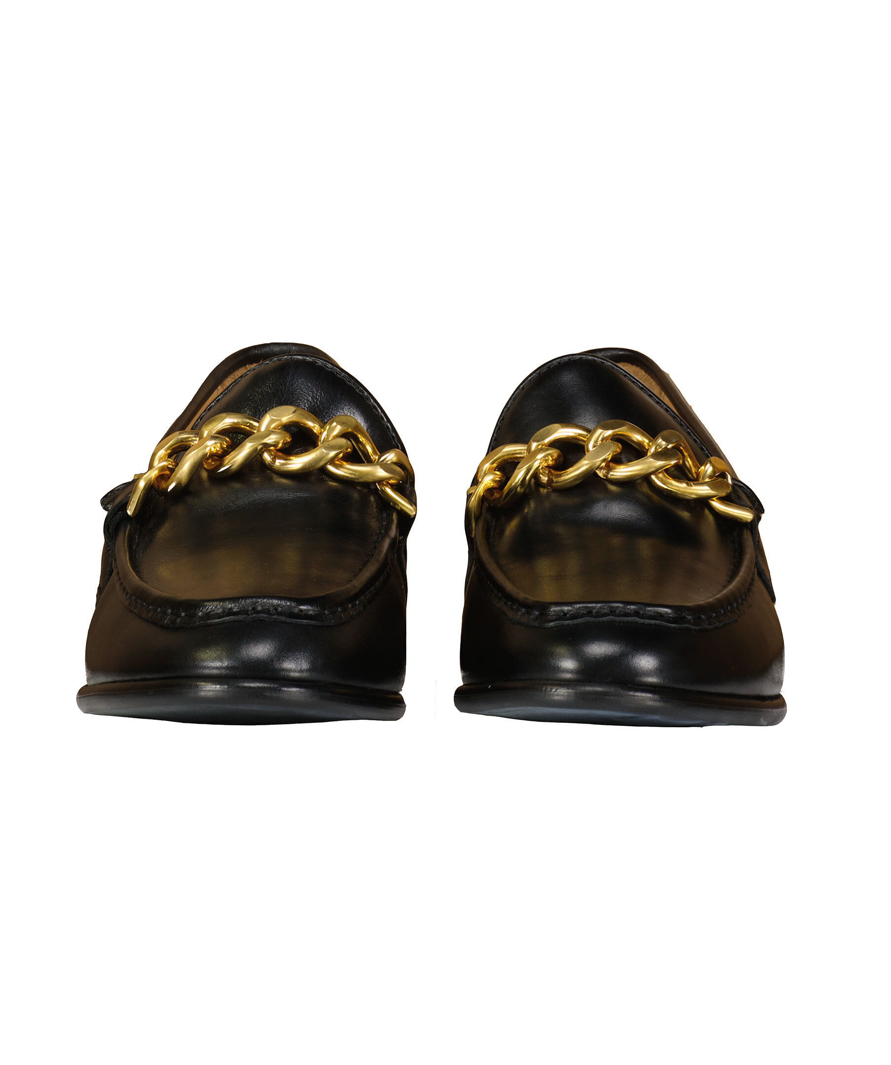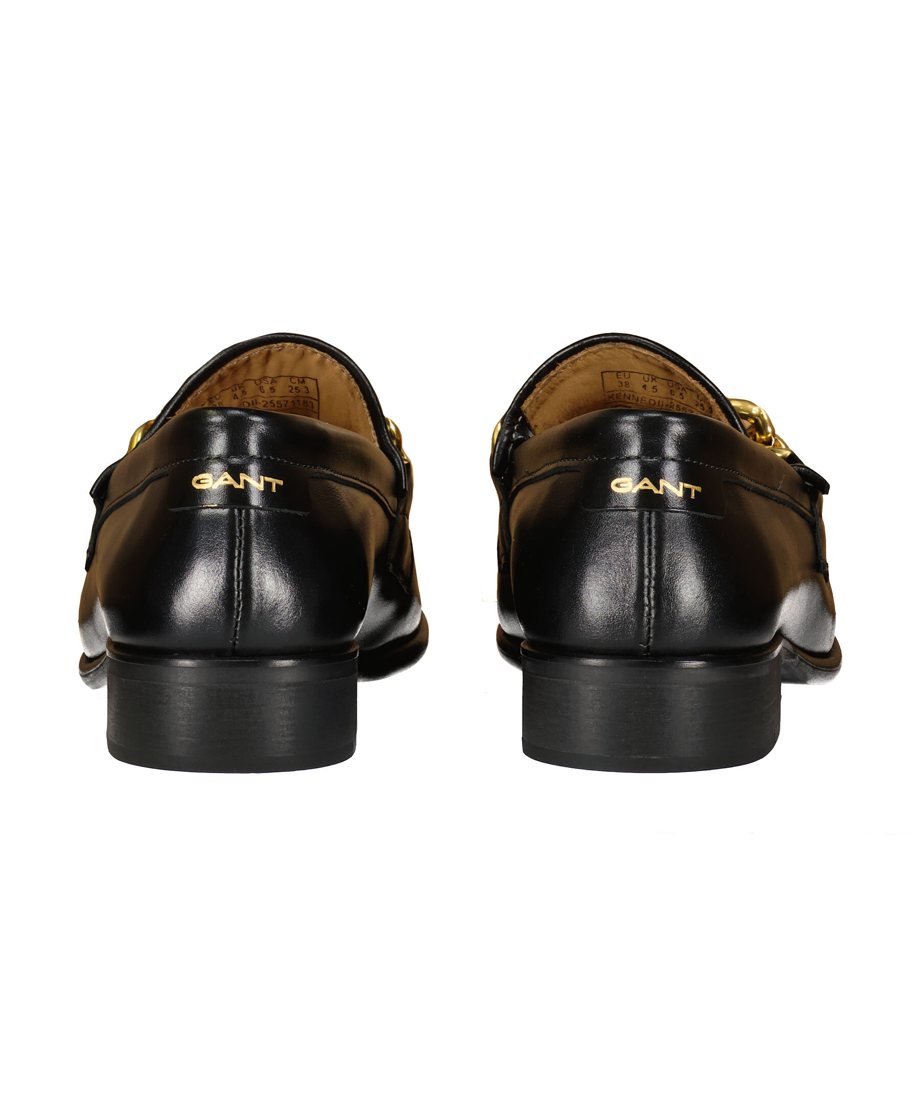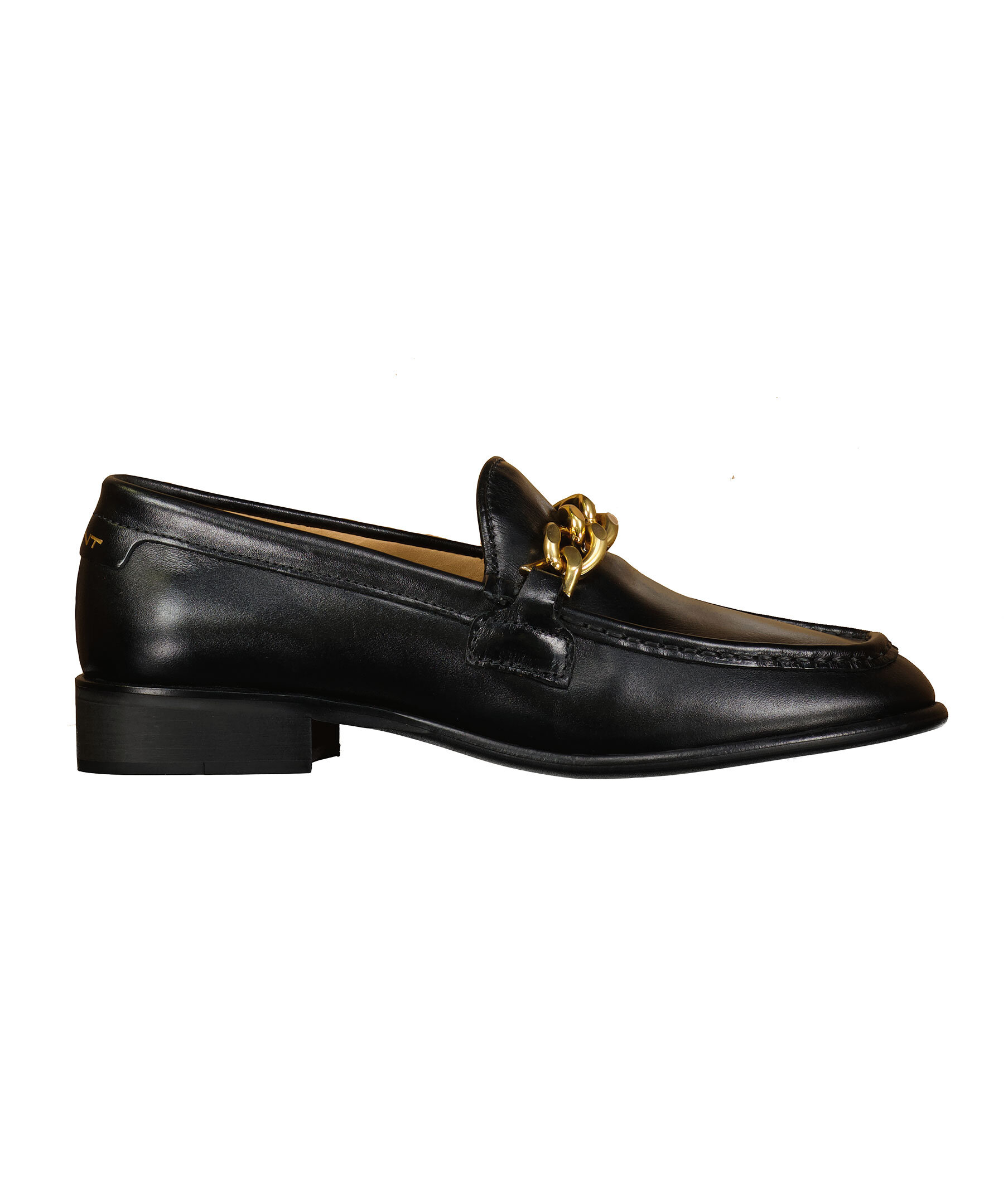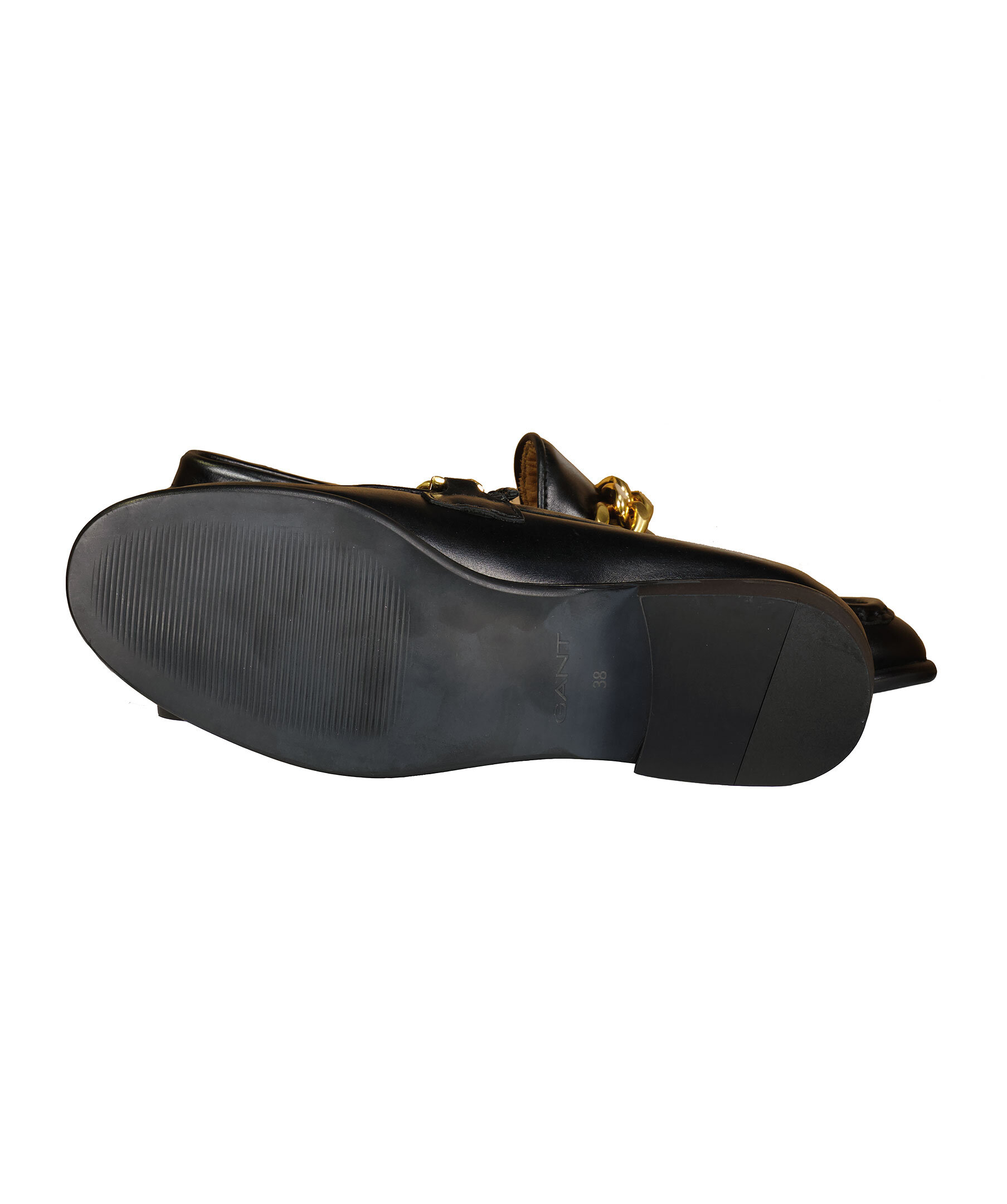 Svarta loafers från Gant i polerat läder. Skorna är tillverkade i mjukt skinn med innersula i skinn och yttersula i gummi. Guldfärgad kedja framtill.