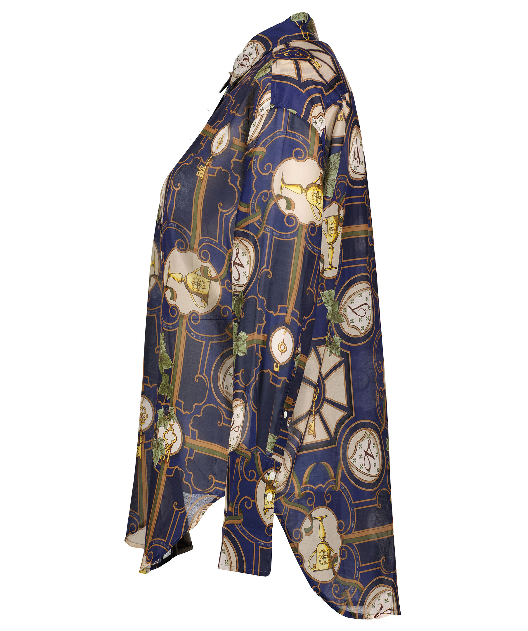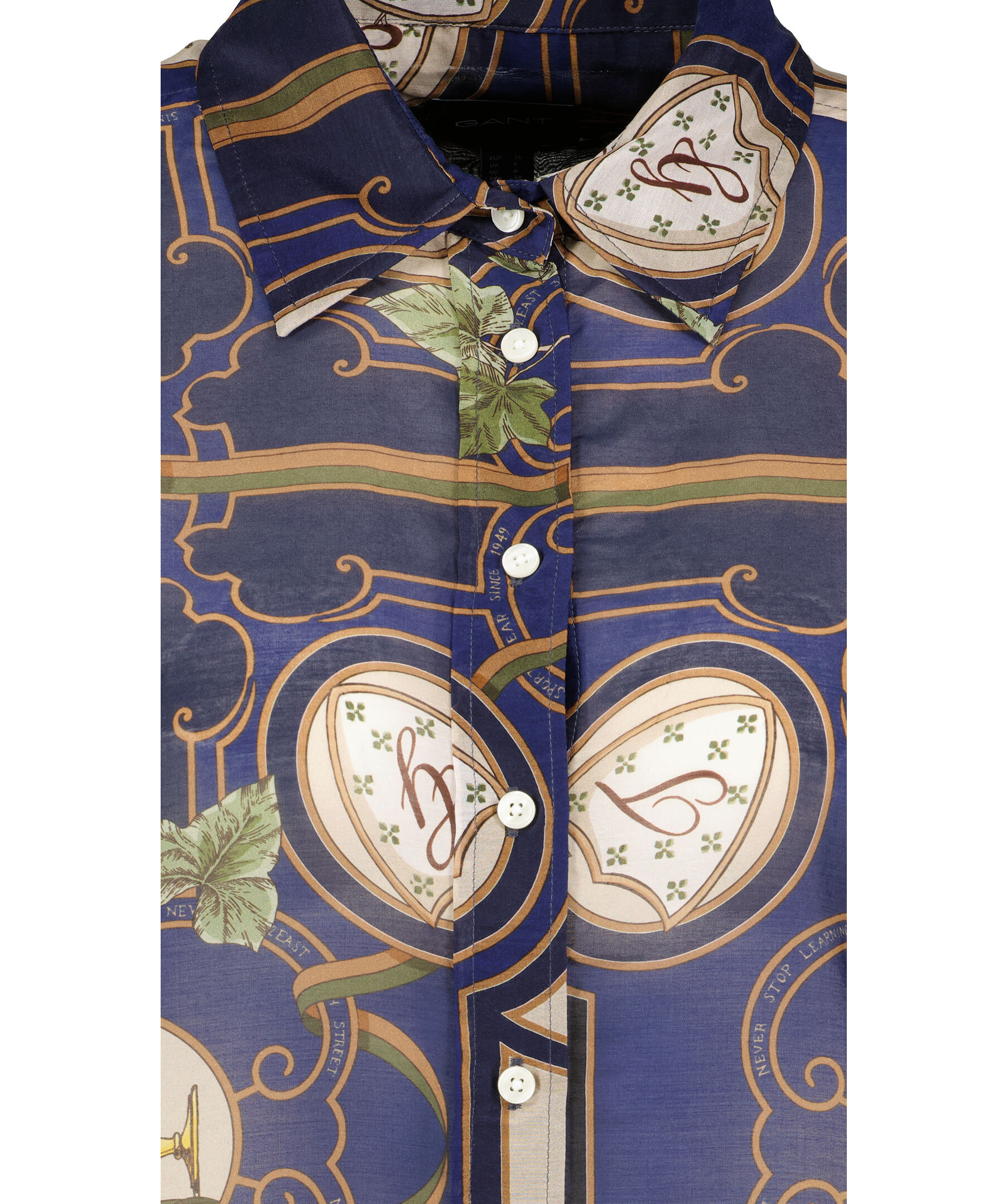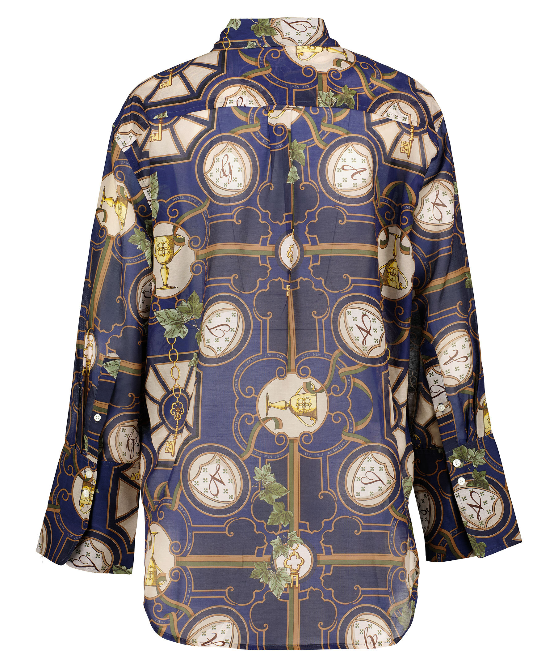 Mörkblå, brun och grön mönstrad skjorta från Gant. Tillverkad i bomull och silkes blandning. Skjortan har en klassisk silhuett, enkel krage, breda manschetter. Locker loop och boxpleat i ryggen.
