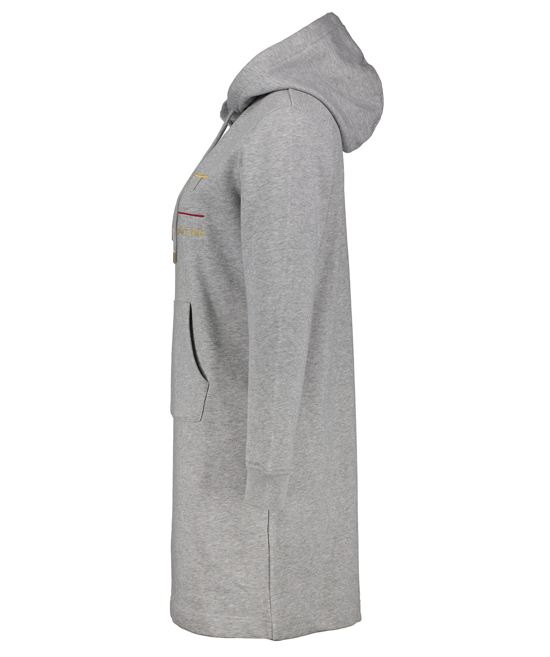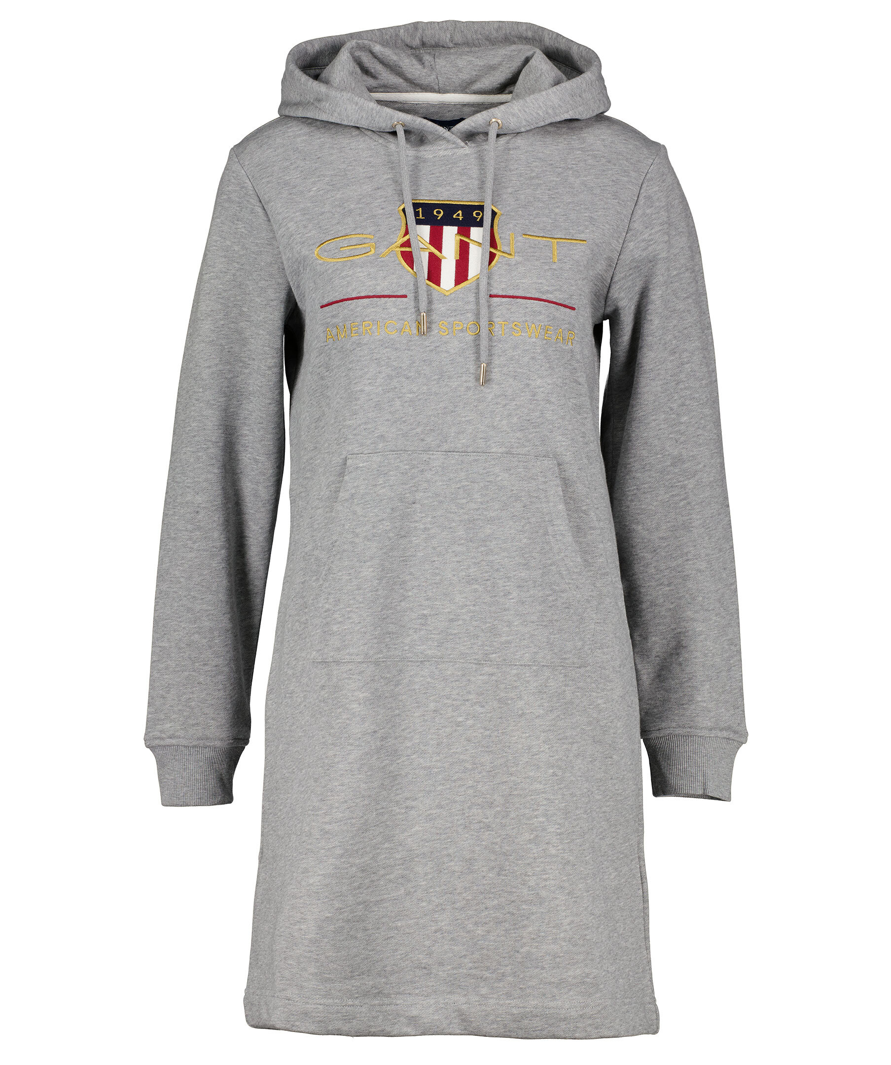 Gråmelerad hoodieklänning från Gant i skön bomullsblandning. Luva med dragsko samt stor ficka på magen. Ribbstickade muddar och broderad logotyp på bröstet. Tillverkad i bomull och polyesterblandning.