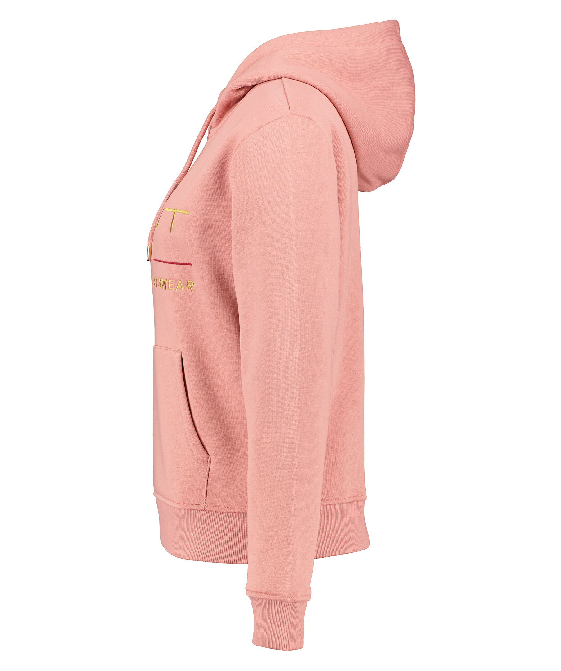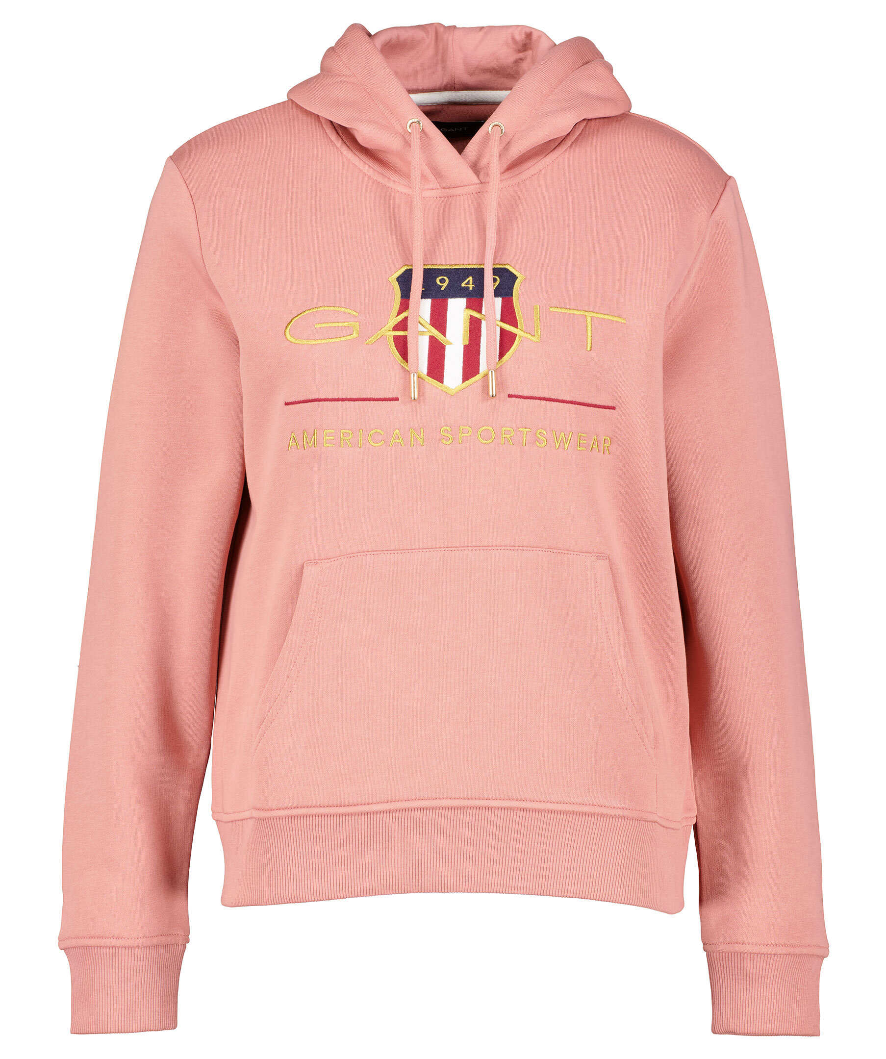 Rosa hoodie från Gant. Tillverkad i en bomullblandning med en mjuk borstad insida. Tröjan har luva med snörning samt stor ficka på magen. Ribbstickade muddar och broderad logotyp med sköld på bröstet.