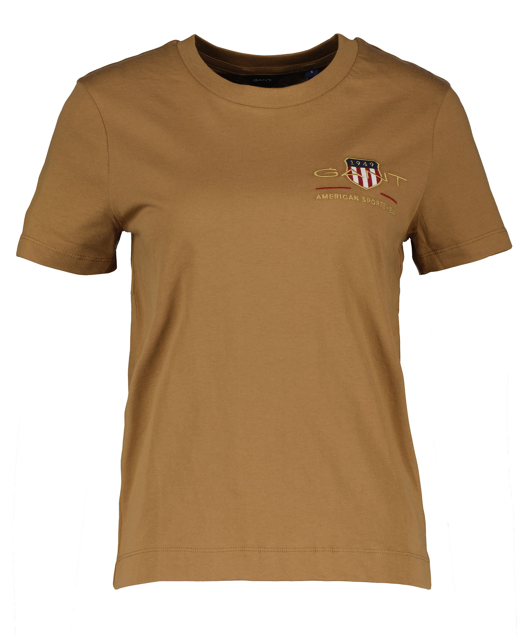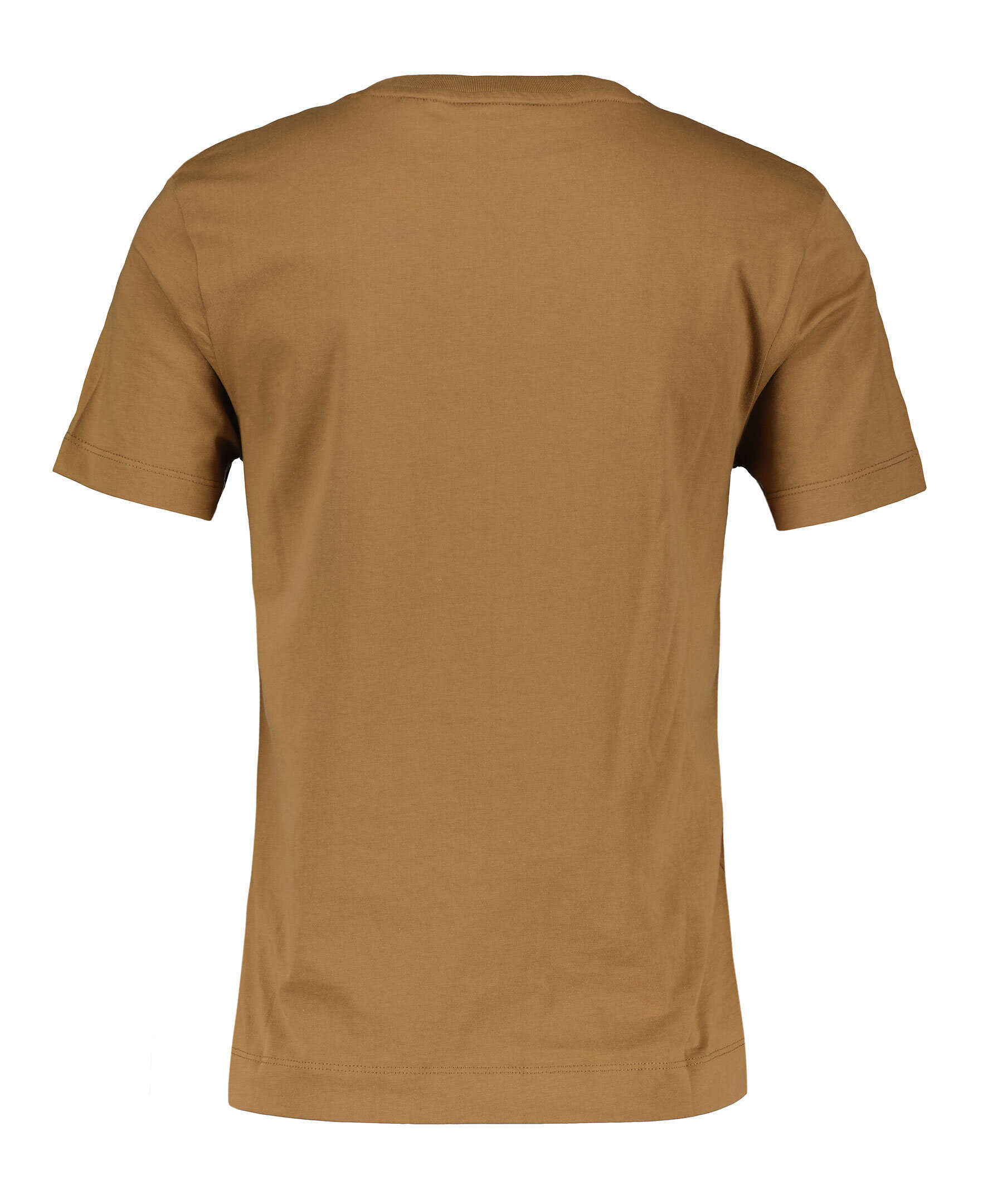 Kamelfärgad t-shirt i stretchig bomull från Gant. Rund halsringning och rak modell. Broderad logotyp och sköld på vänster sida av bröstet.