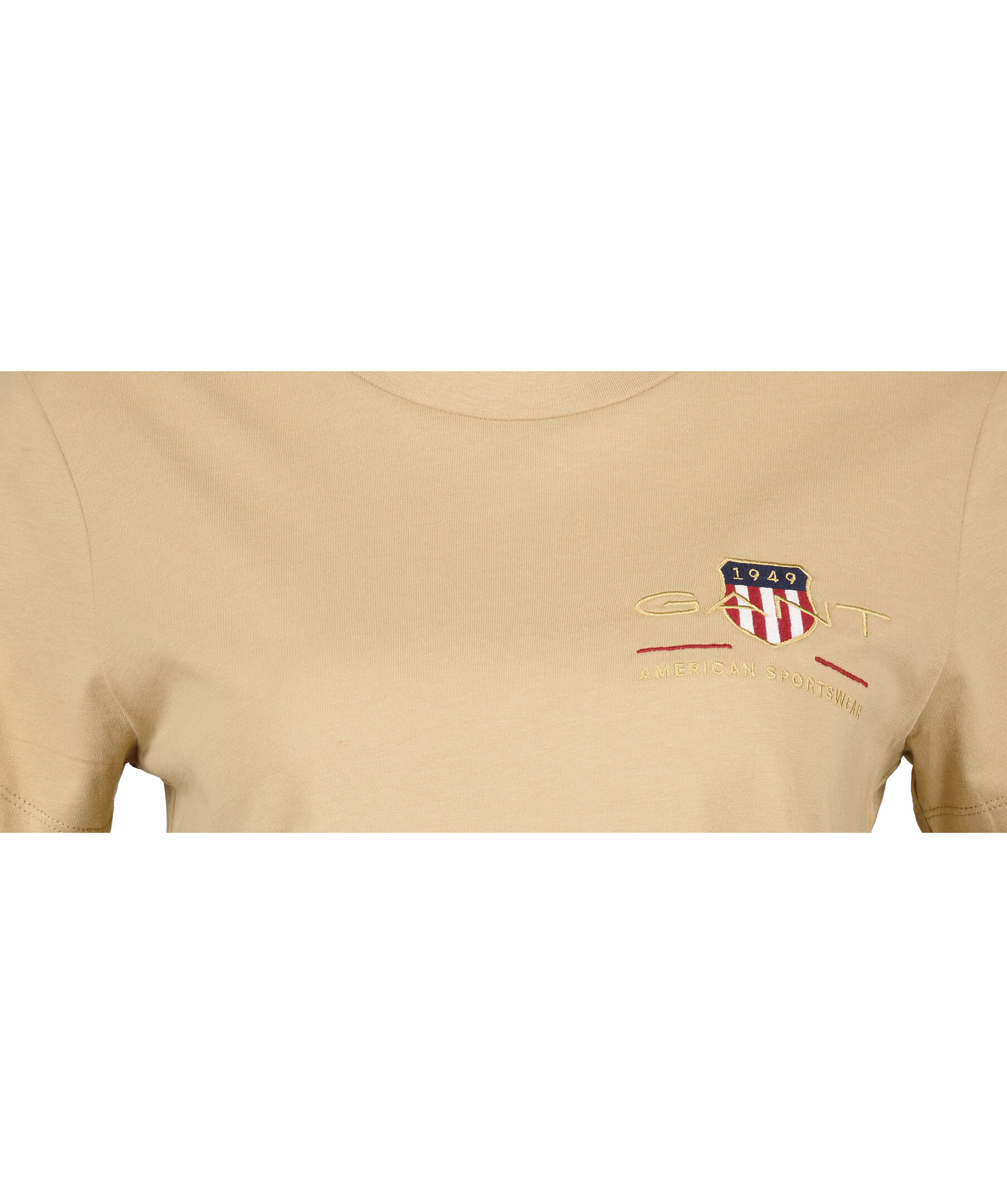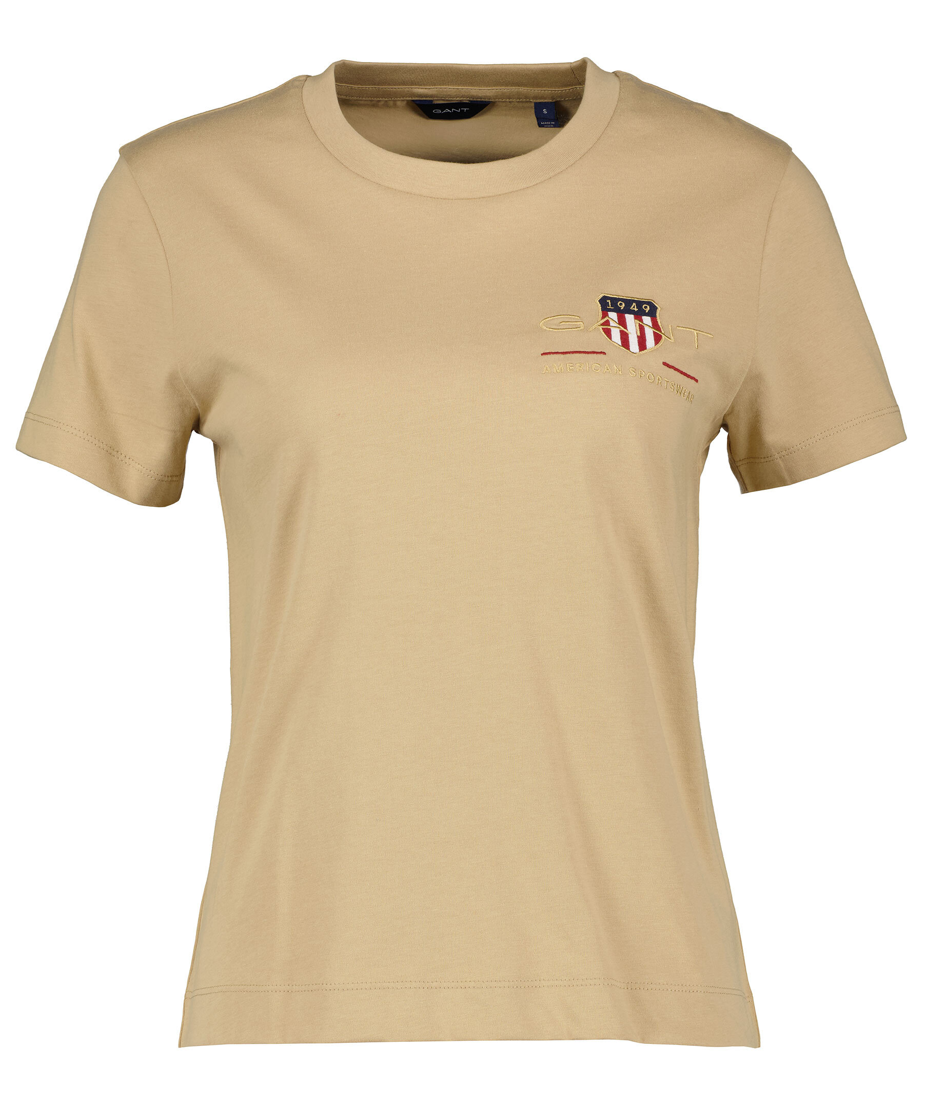 Beige t-shirt i stretchig bomull från Gant. Rund halsringning och rak modell. Broderad logotyp och sköld på vänster sida av bröstet.