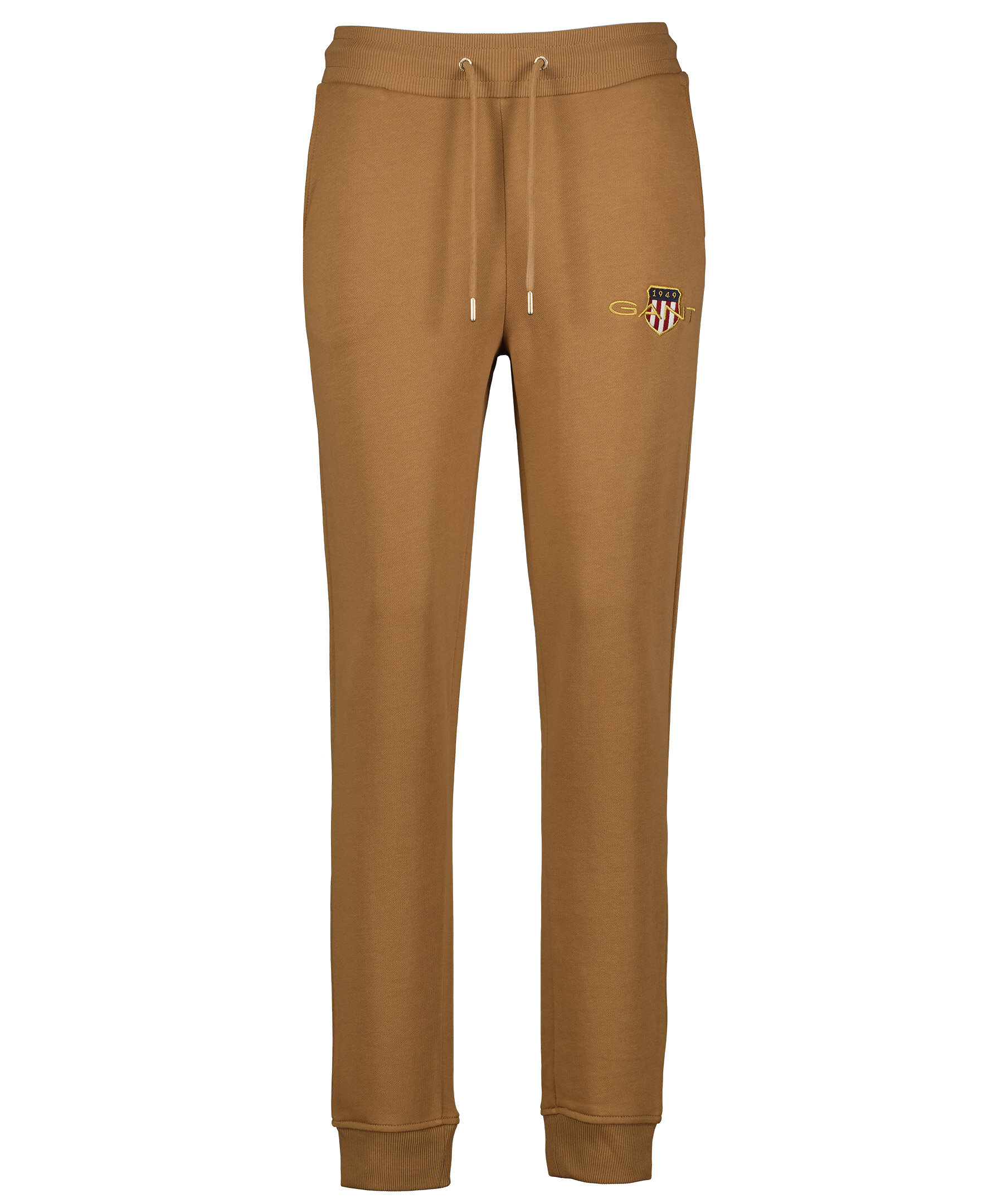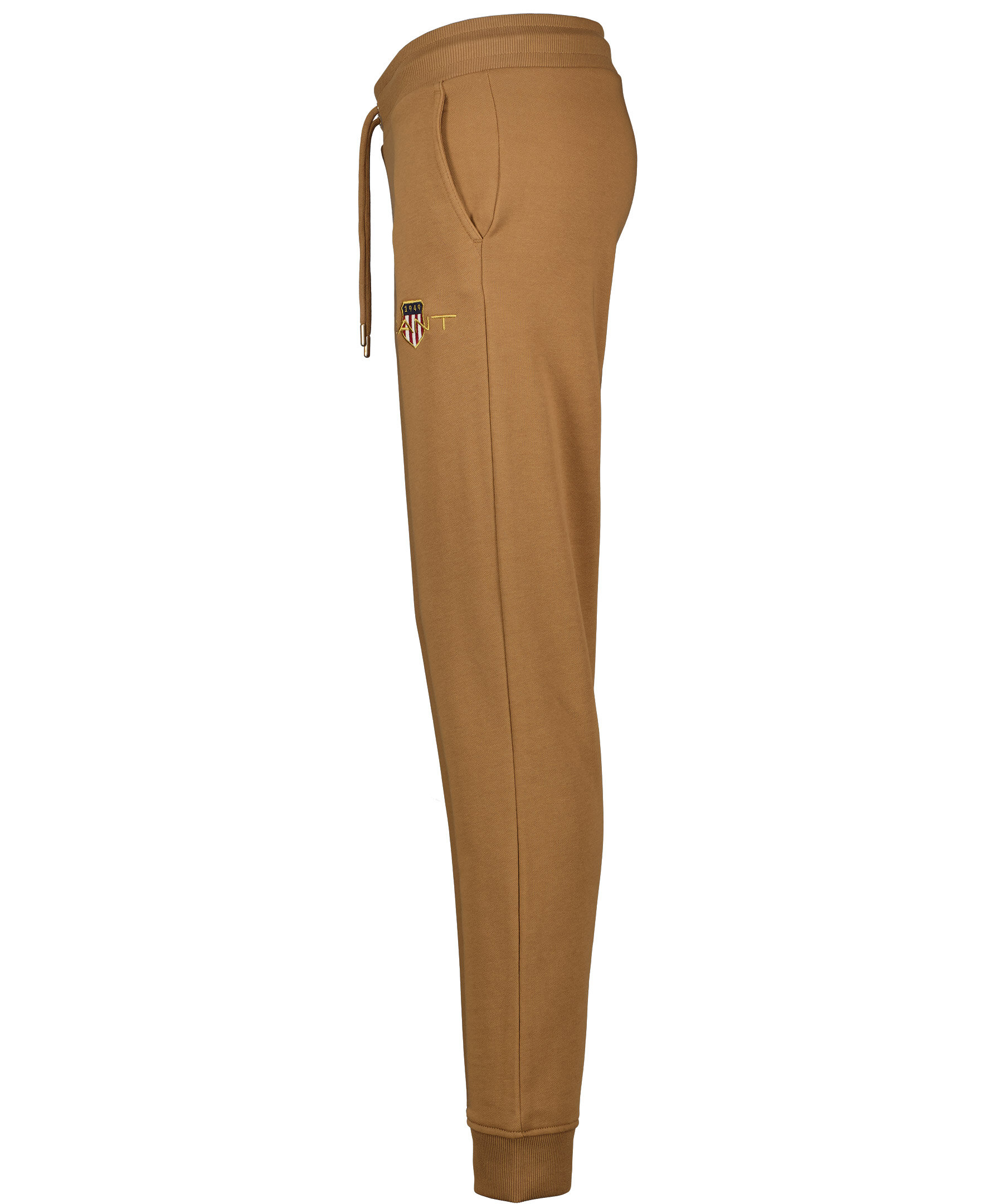 Kamelfärgade mjukisbyxor från Gant. Mudd och snörning i midjan, muddar i benslut och två framfickor. Brodyr med logga och sköld på vänster byxben. Tillverkade i bomullsblandning.