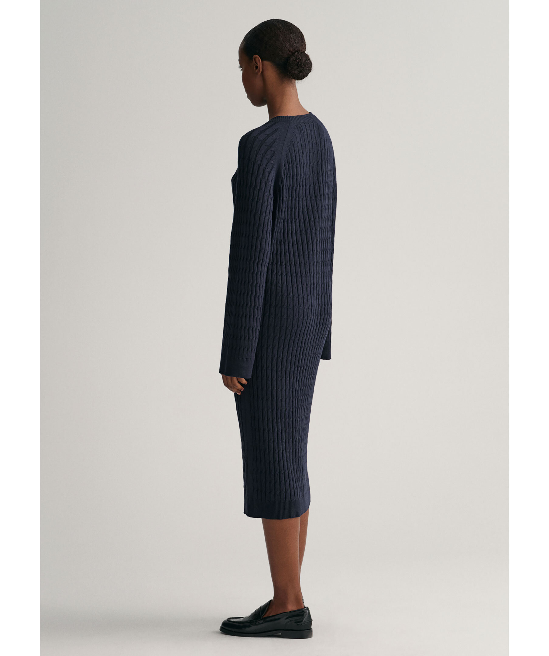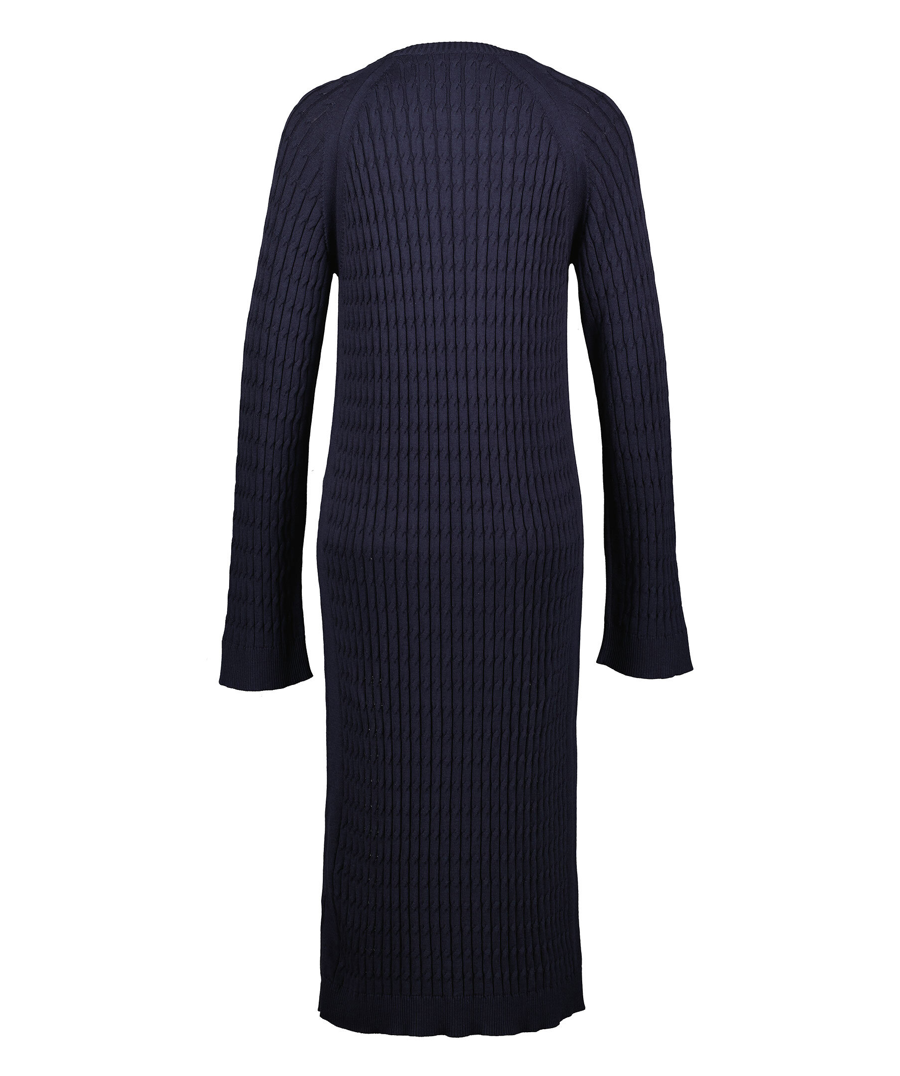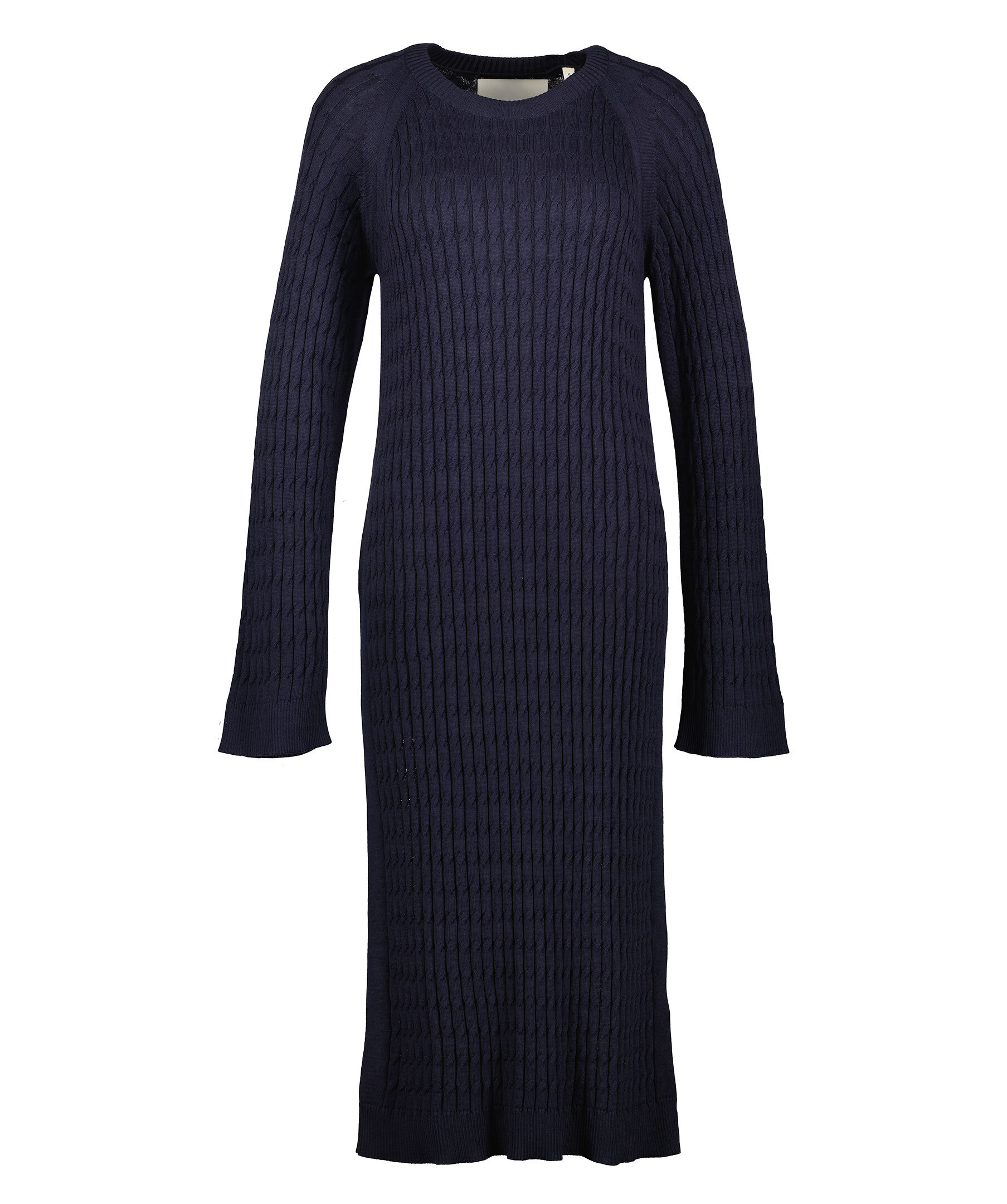 Marinblå chic klänning i glansig lyocell- och bomullsblandning med en smal kabelstickad struktur från Gant. Den har en normal passform som omfamnar kroppen på ett snyggt sätt, med mellanlång längd, klassisk rund halsringning och raka, mellanlånga ärmar. Ett snyggt plagg som kan dressas både upp och ner beroende på tillfälle.